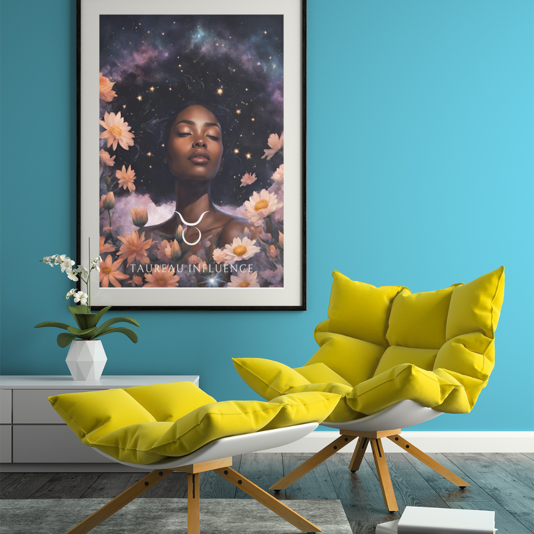 Apportez une touche de douceur et de force à votre intérieur avec ce poster, conçu pour les femmes nées sous le signe du Taureau. Entourée de fleurs et baignée par un ciel étoilé, Imani incarne l’essence de ce signe de terre, ancré et bienveillant.
