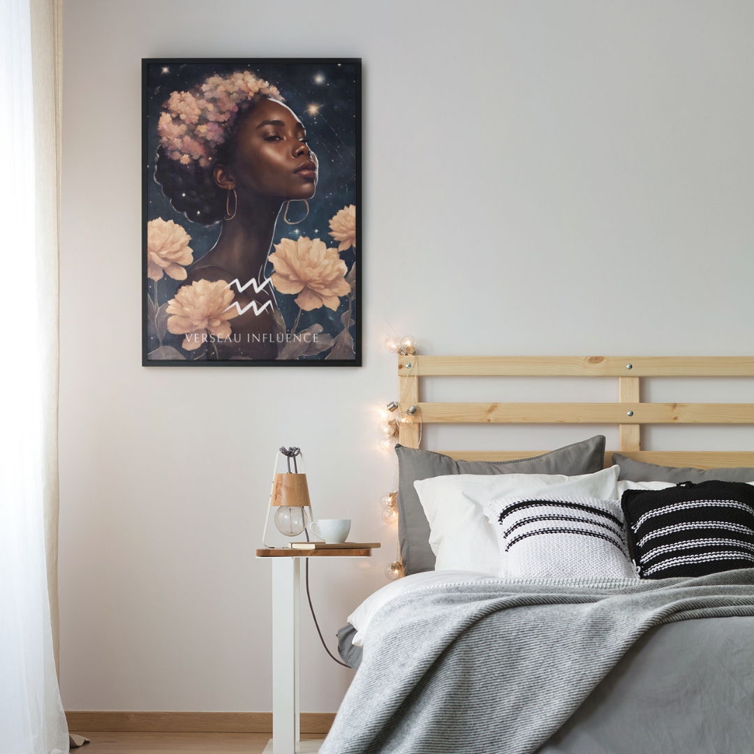 Apportez une ambiance unique et visionnaire à votre intérieur avec ce poster spécialement conçu pour les femmes nées sous le signe du Verseau. Entourée de fleurs sous un ciel étoilé, Aria incarne l'essence de ce signe d'air, créatif et indépendant.