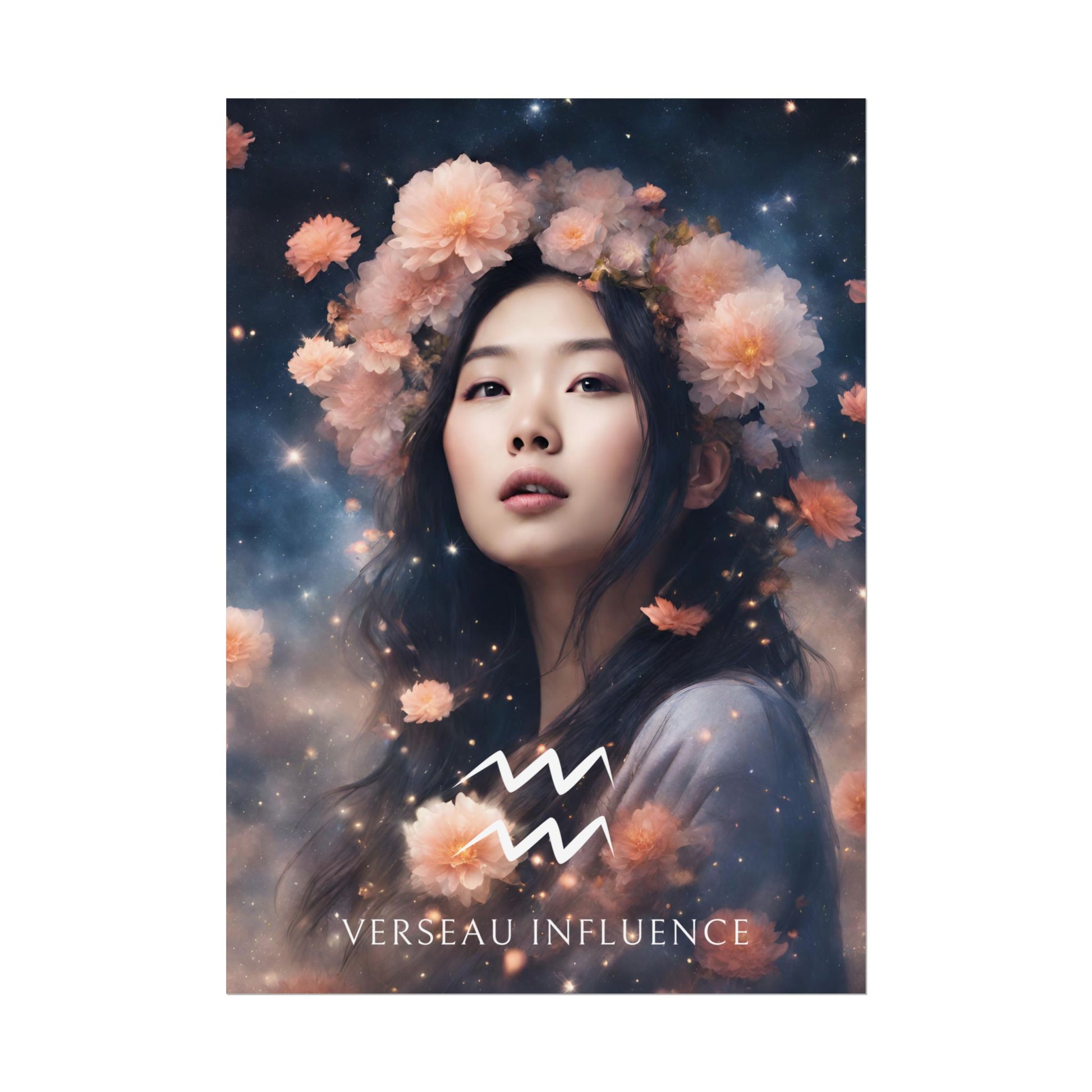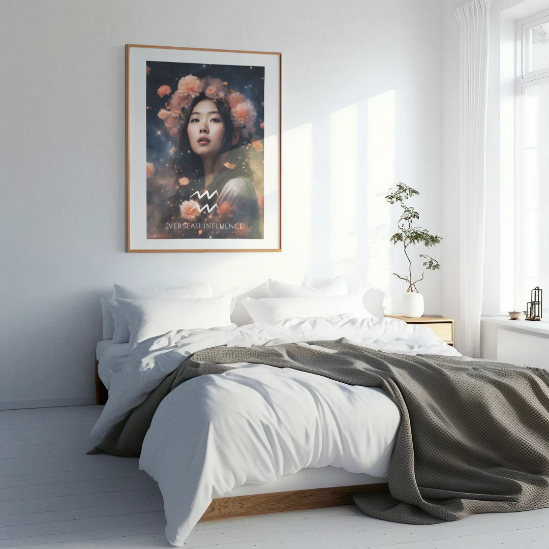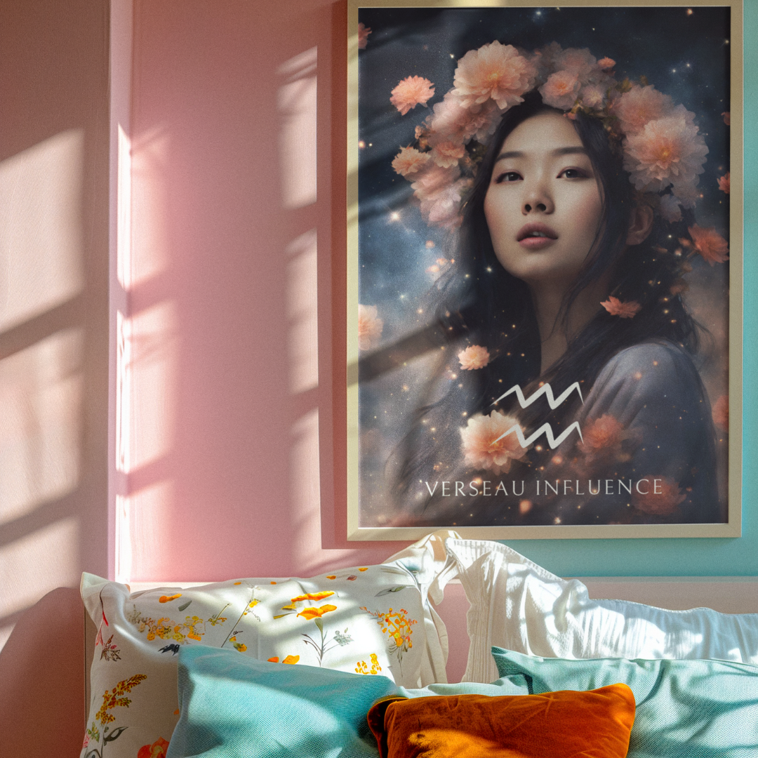 Apportez une ambiance unique et visionnaire à votre intérieur avec ce poster spécialement conçu pour les femmes nées sous le signe du Verseau. Entourée de fleurs sous un ciel étoilé, Meiying incarne l'essence de ce signe d'air, créatif et indépendant.