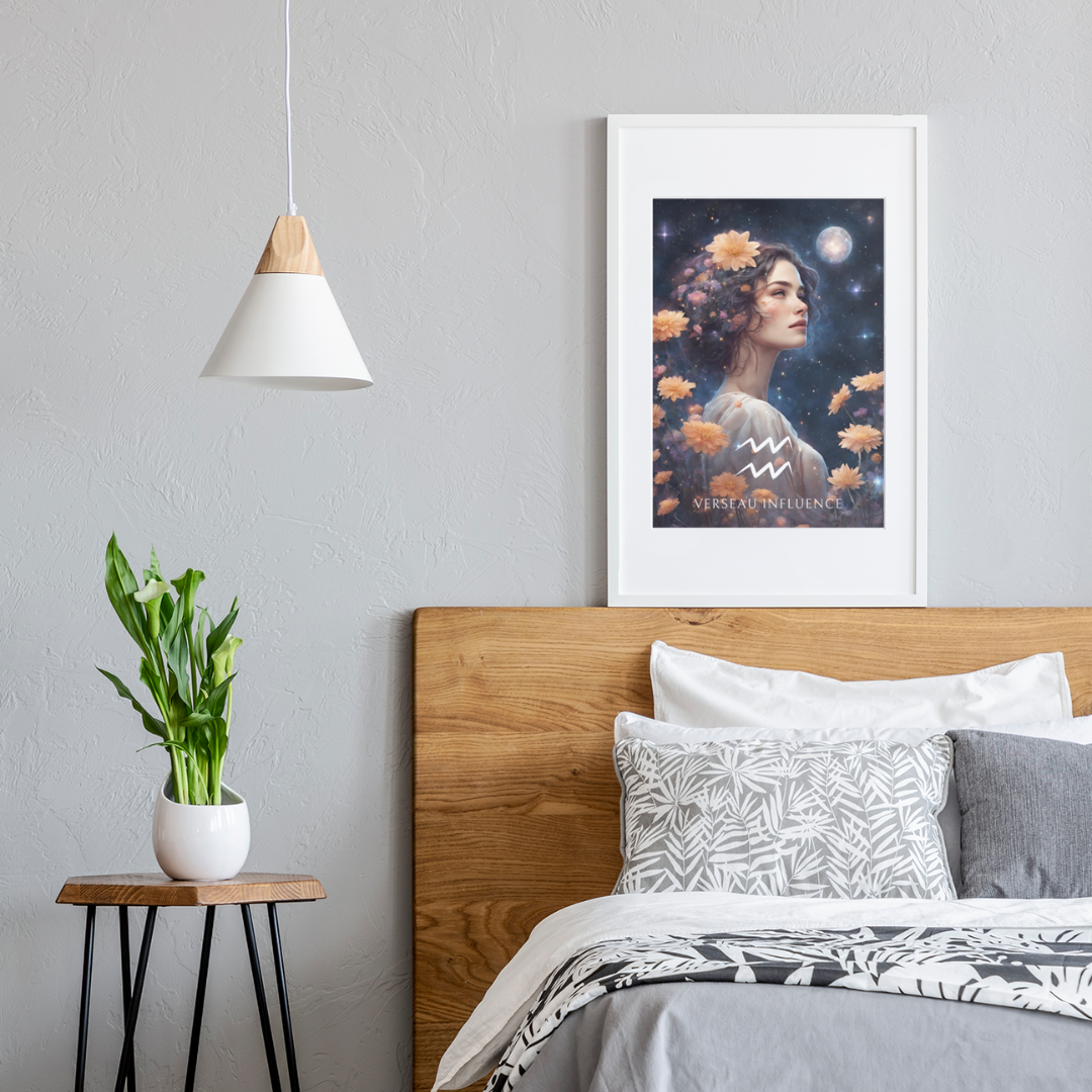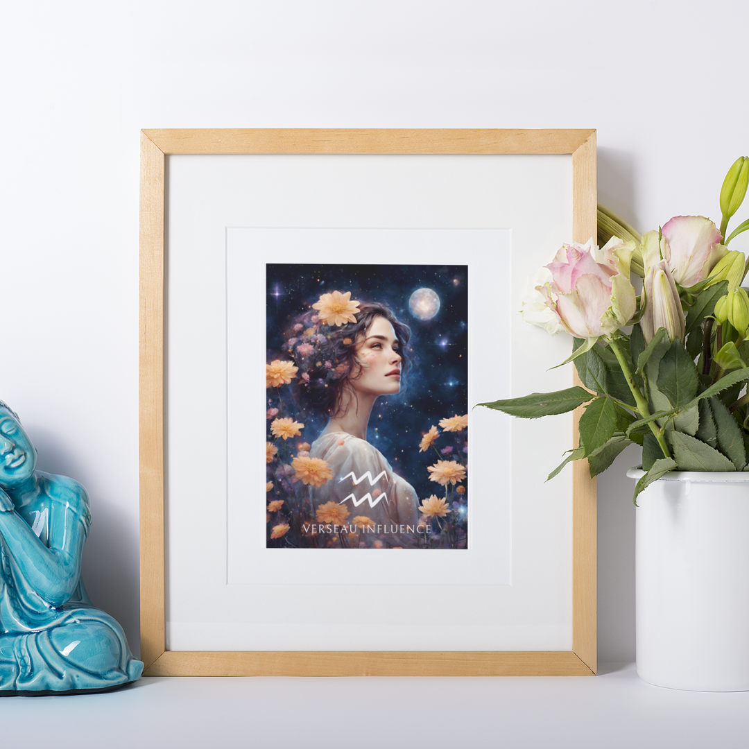 Apportez une ambiance unique et visionnaire à votre intérieur avec ce poster spécialement conçu pour les femmes nées sous le signe du Verseau. Entourée de fleurs sous un ciel étoilé, Sophie incarne l'essence de ce signe d'air, créatif et indépendant.