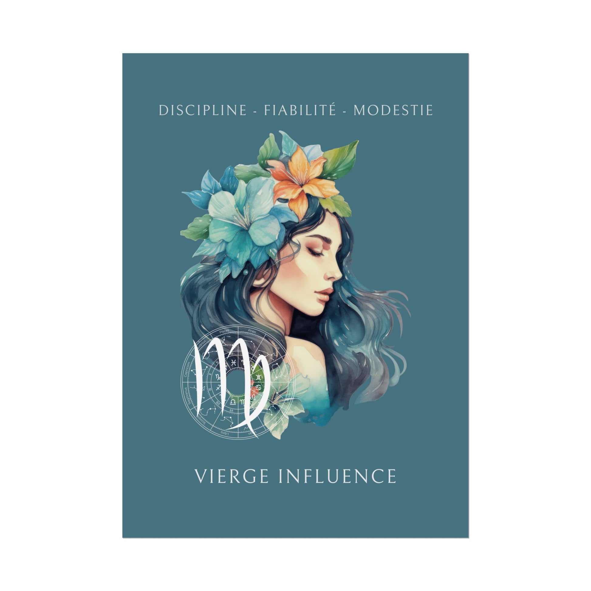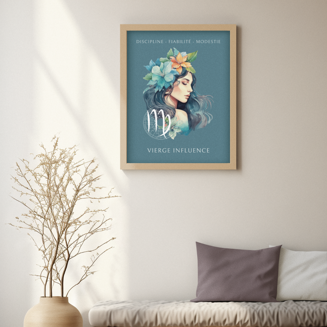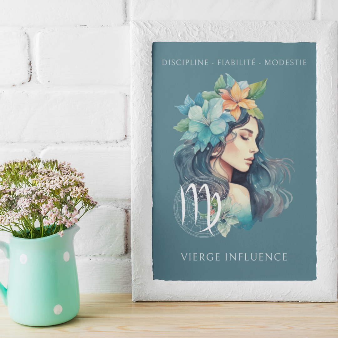 Exprimez la rigueur et la douceur du signe de la Vierge avec ce magnifique poster, conçu pour les femmes nées sous ce signe de terre. L’illustration d'Aurélie, entourée de fleurs, capte l’essence de la Vierge tout en mettant en avant ses qualités uniques : discipline, fiabilité et modestie.