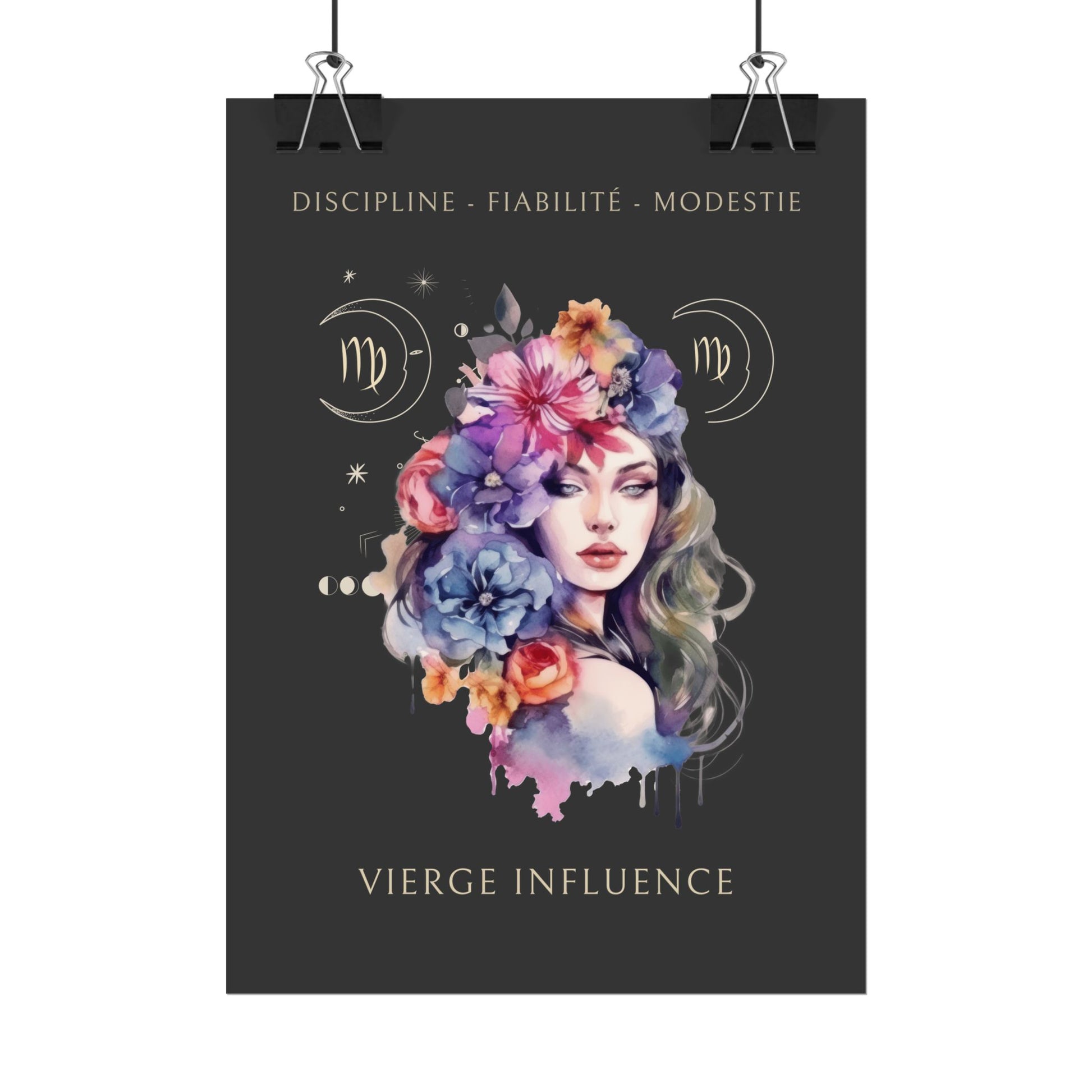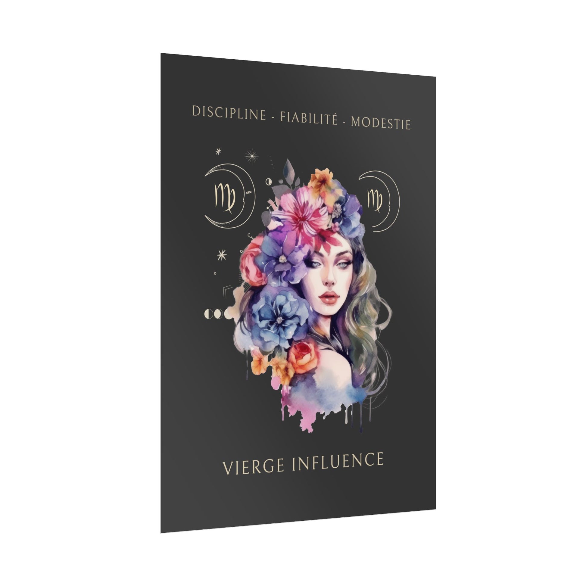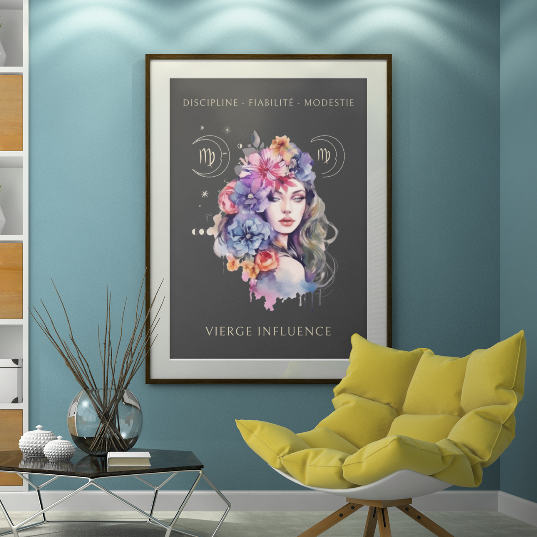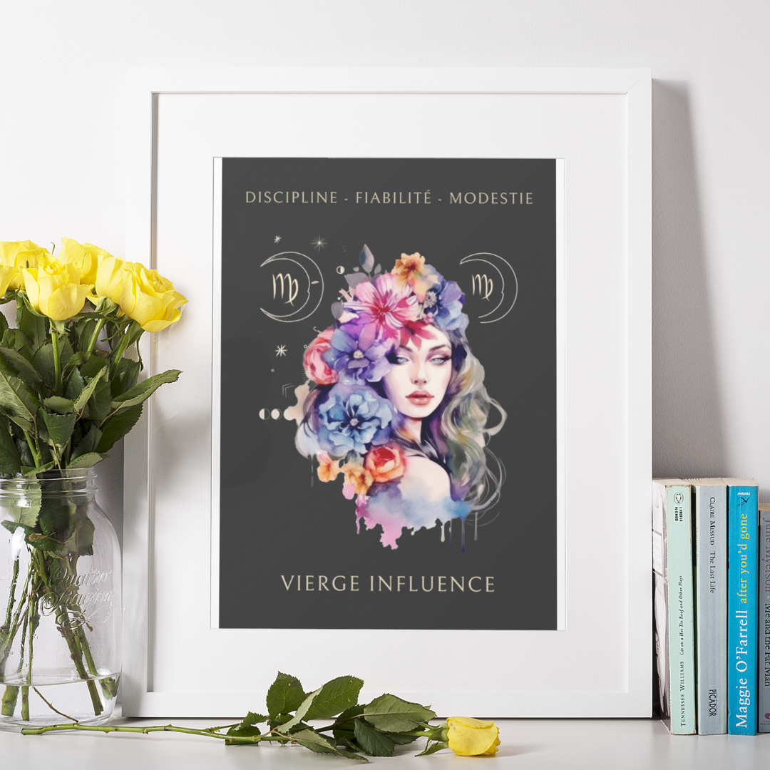 Exprimez la rigueur et la douceur du signe de la Vierge avec ce magnifique poster, conçu pour les femmes nées sous ce signe de terre. L’illustration d'Eleonore, entourée de fleurs, capte l’essence de la Vierge tout en mettant en avant ses qualités uniques : discipline, fiabilité et modestie.