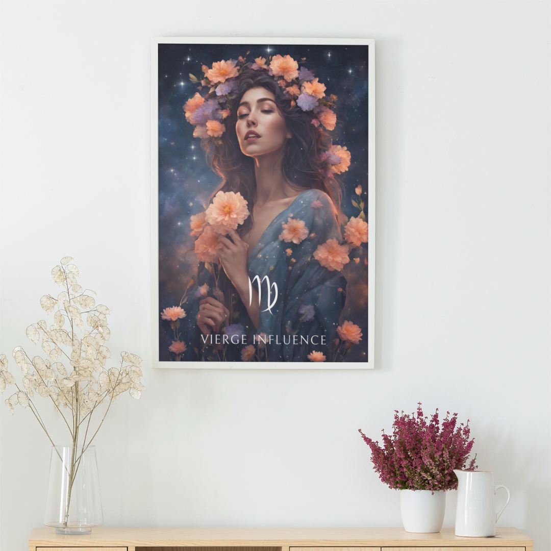 Apportez une touche de douceur et d’harmonie à votre intérieur avec ce poster spécialement conçu pour les femmes nées sous le signe de la Vierge. Entourée de fleurs sous un ciel étoilé, Elisa incarne l'essence de ce signe de terre, raffiné et attentif aux détails.
