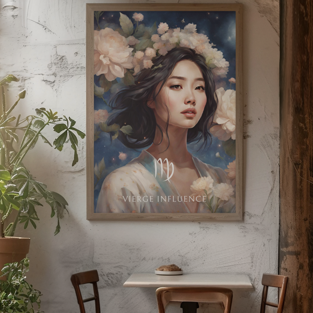 Apportez une touche de douceur et d’harmonie à votre intérieur avec ce poster spécialement conçu pour les femmes nées sous le signe de la Vierge. Entourée de fleurs sous un ciel étoilé, Jiawei incarne l'essence de ce signe de terre, raffiné et attentif aux détails.