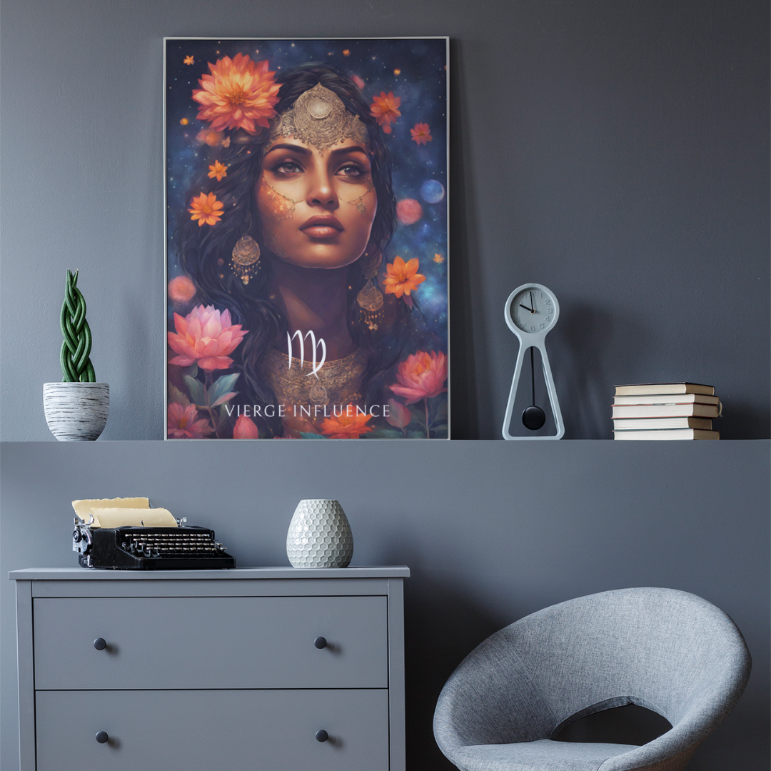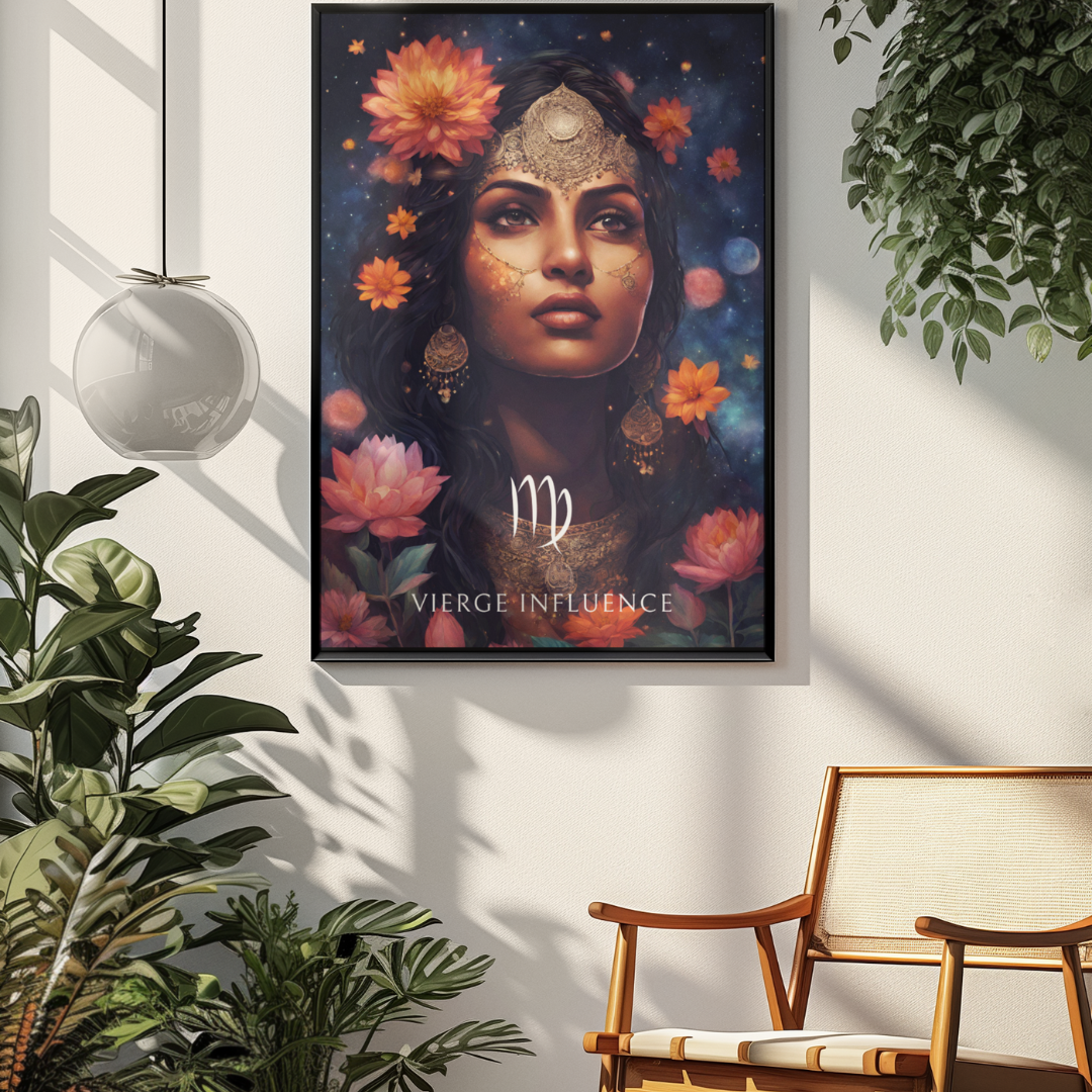 Apportez une touche de douceur et d’harmonie à votre intérieur avec ce poster spécialement conçu pour les femmes nées sous le signe de la Vierge. Entourée de fleurs sous un ciel étoilé, Lakshmi incarne l'essence de ce signe de terre, raffiné et attentif aux détails.