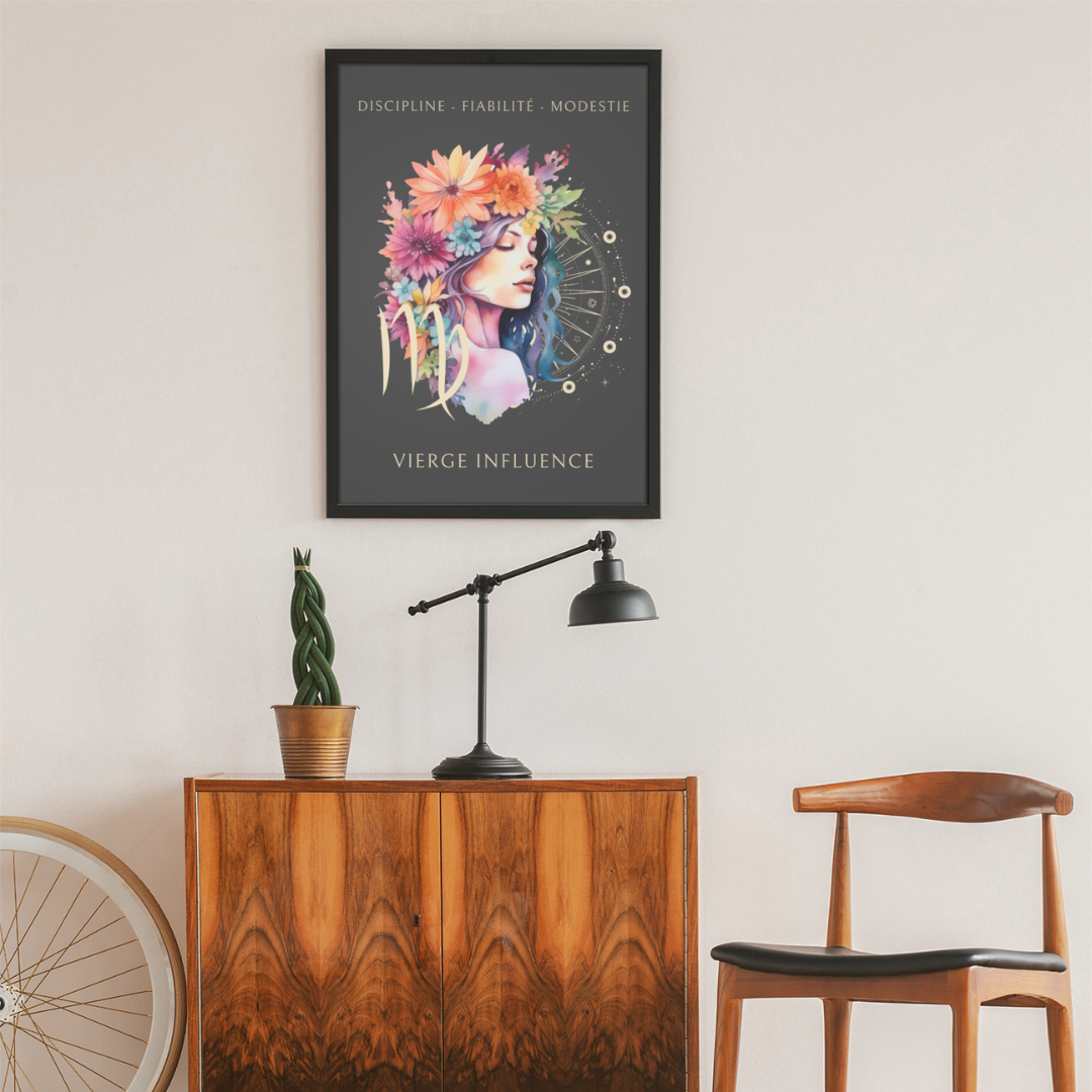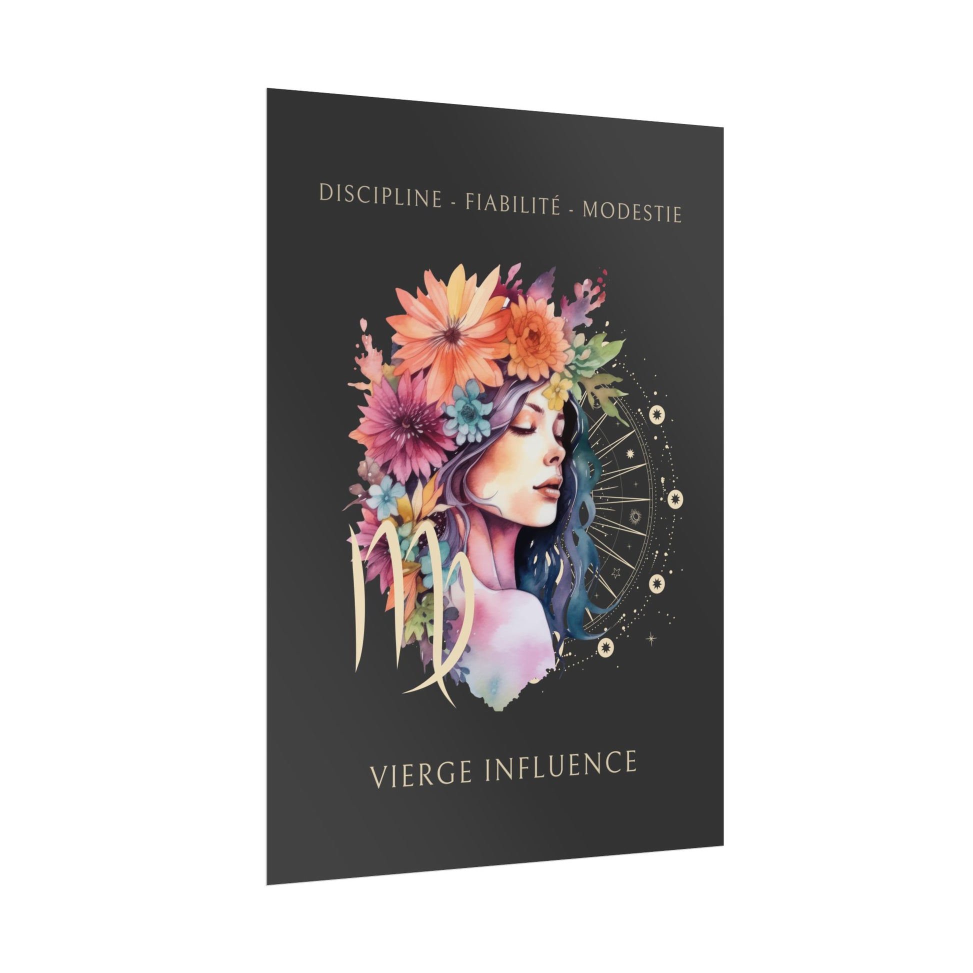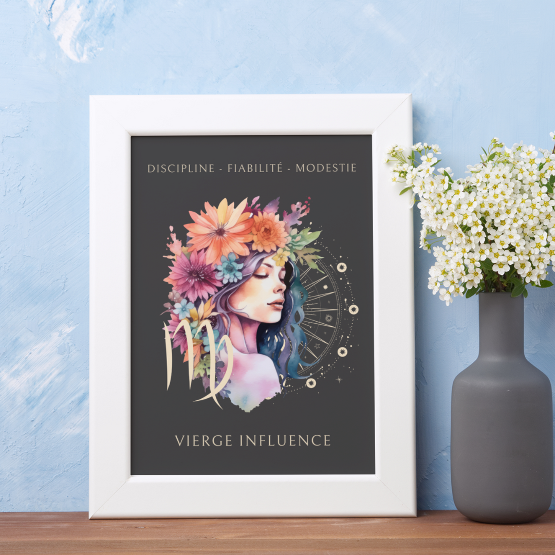 Exprimez la rigueur et la douceur du signe de la Vierge avec ce magnifique poster, conçu pour les femmes nées sous ce signe de terre. L’illustration de Mélanie, entourée de fleurs, capte l’essence de la Vierge tout en mettant en avant ses qualités uniques : discipline, fiabilité et modestie.
