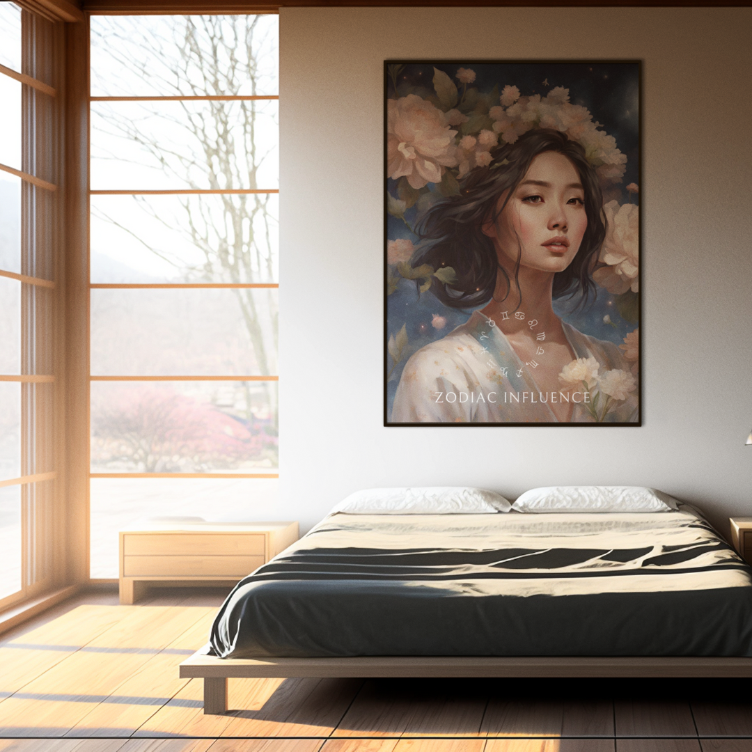 Apportez une touche mystique et féminine à votre intérieur avec ce poster inspiré de l'univers astrologique. Entourée de fleurs sous un ciel étoilé, Jiawei incarne l'essence même de l’astrologie, une alliance subtile de sagesse et d’influence céleste.