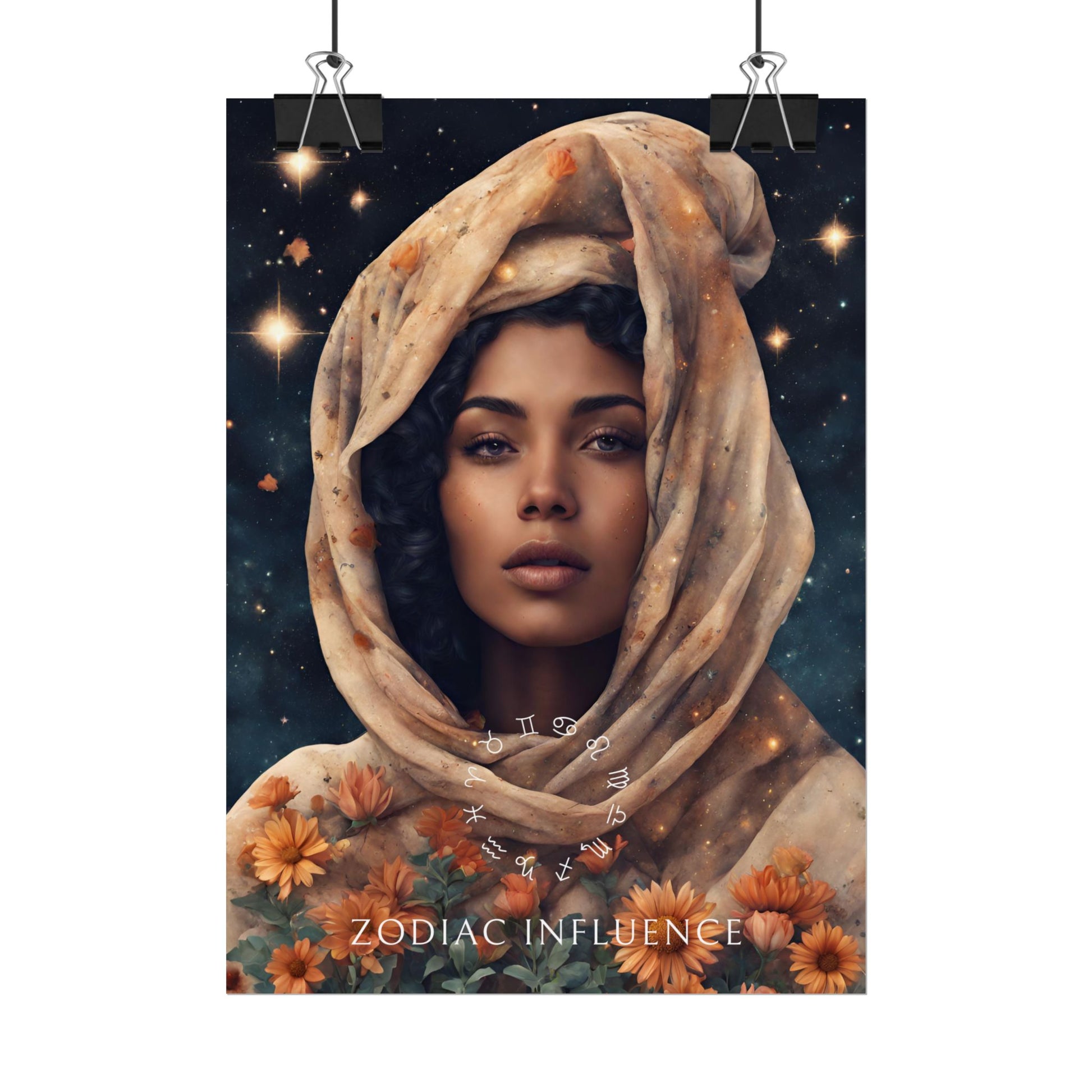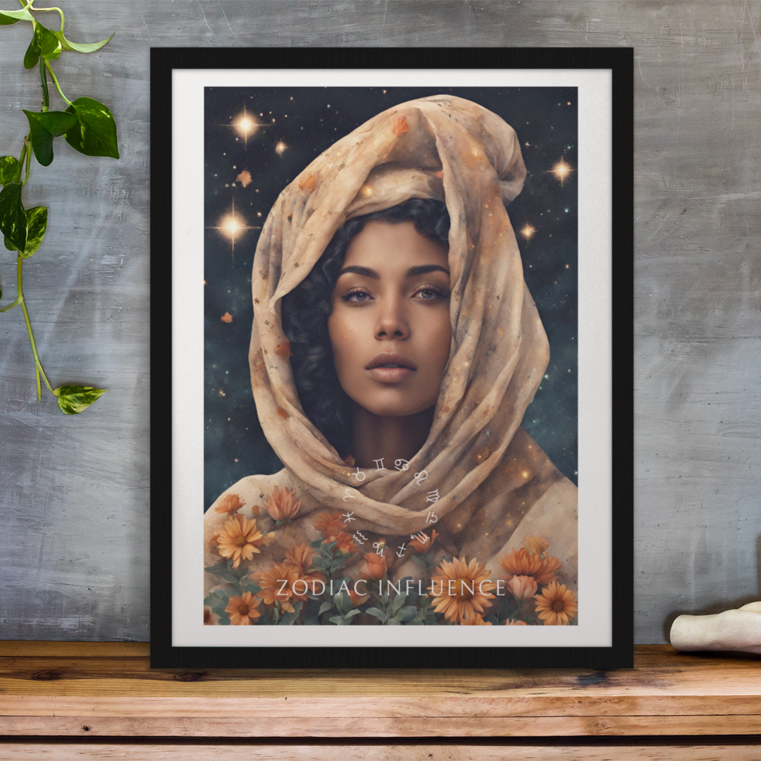 Apportez une touche mystique et féminine à votre intérieur avec ce poster inspiré de l'univers astrologique. Entourée de fleurs sous un ciel étoilé, Jihane incarne l'essence même de l’astrologie, une alliance subtile de sagesse et d’influence céleste.