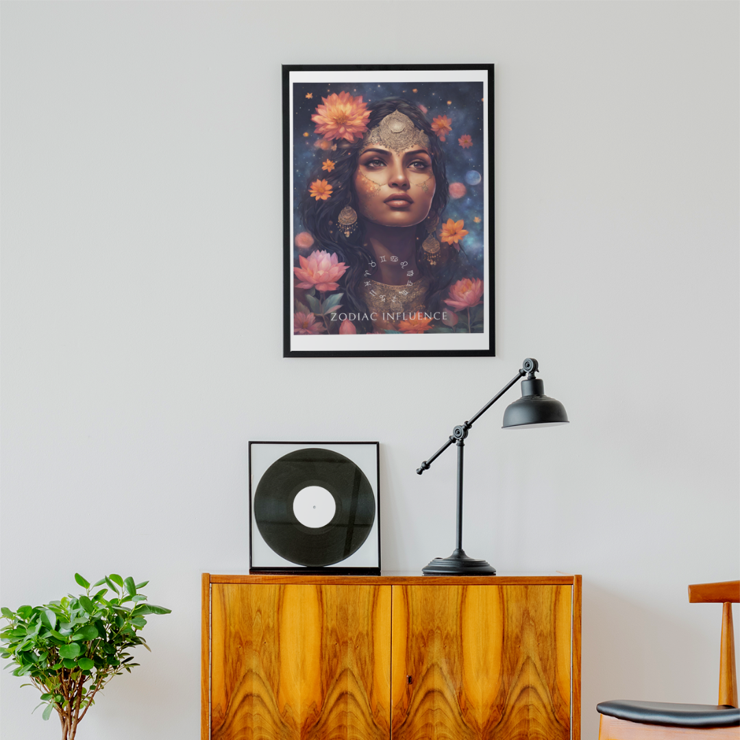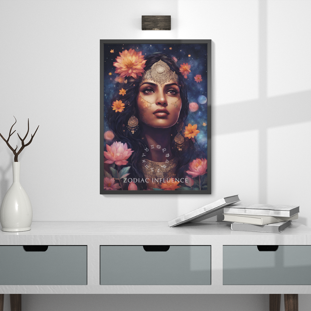 Apportez une touche mystique et féminine à votre intérieur avec ce poster inspiré de l'univers astrologique. Entourée de fleurs sous un ciel étoilé, Lakshmi incarne l'essence même de l’astrologie, une alliance subtile de sagesse et d’influence céleste.
