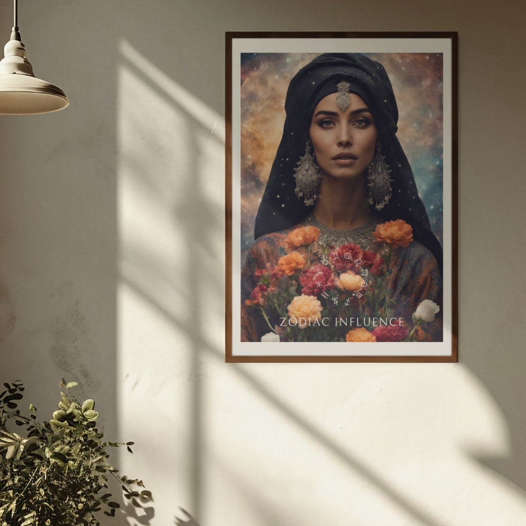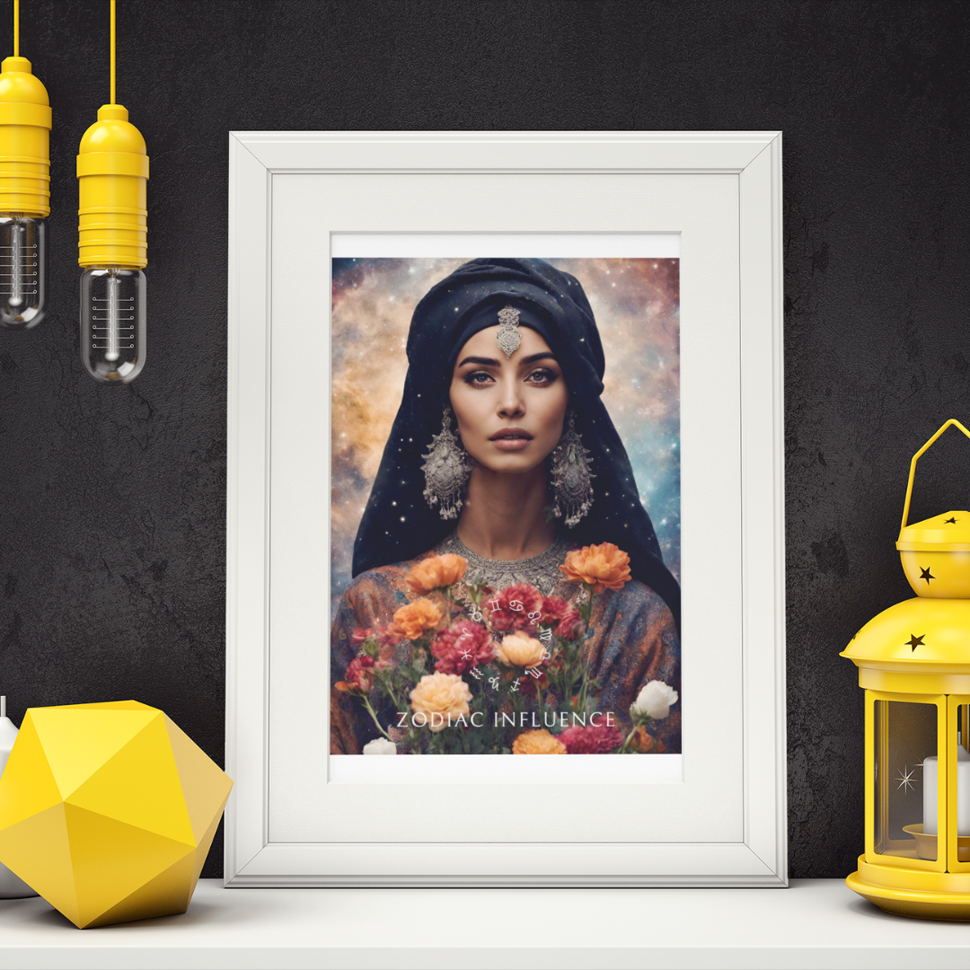 Apportez une touche mystique et féminine à votre intérieur avec ce poster inspiré de l'univers astrologique. Entourée de fleurs sous un ciel étoilé, Nawal incarne l'essence même de l’astrologie, une alliance subtile de sagesse et d’influence céleste.