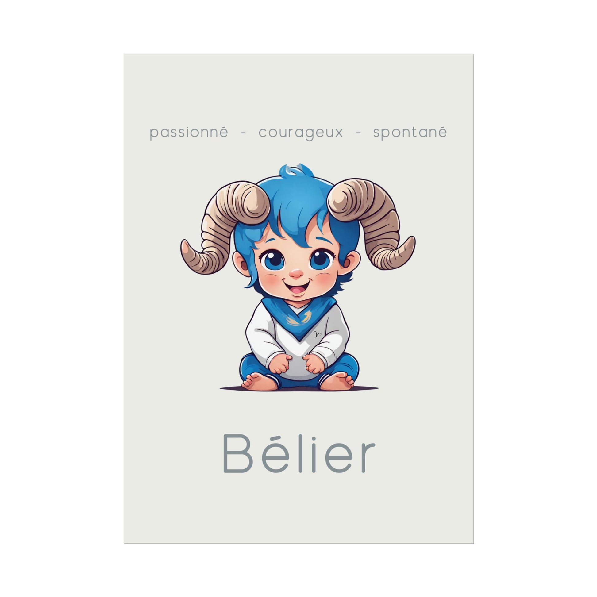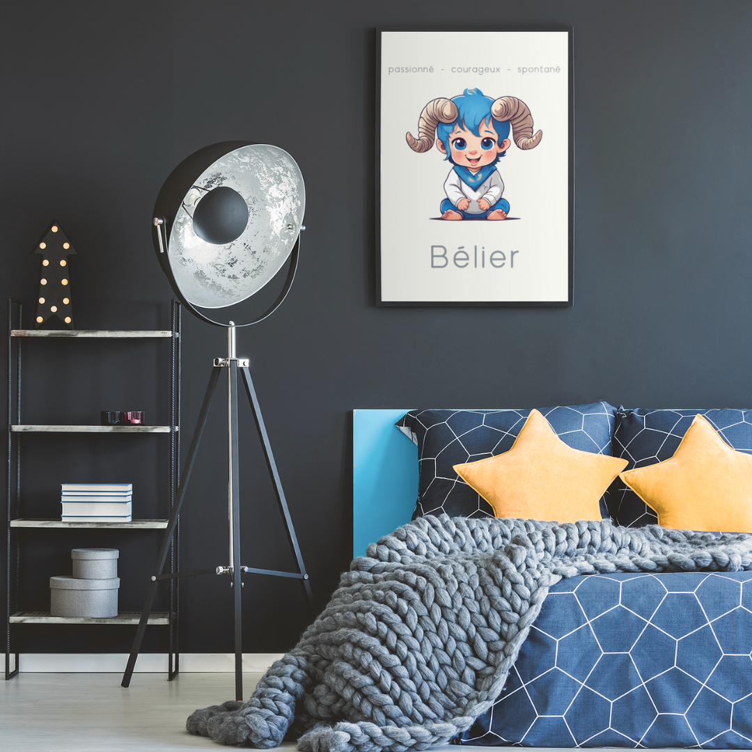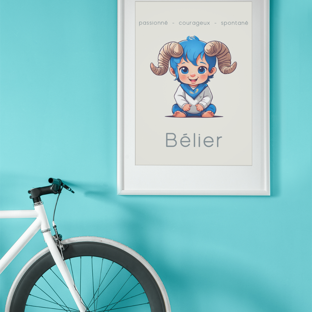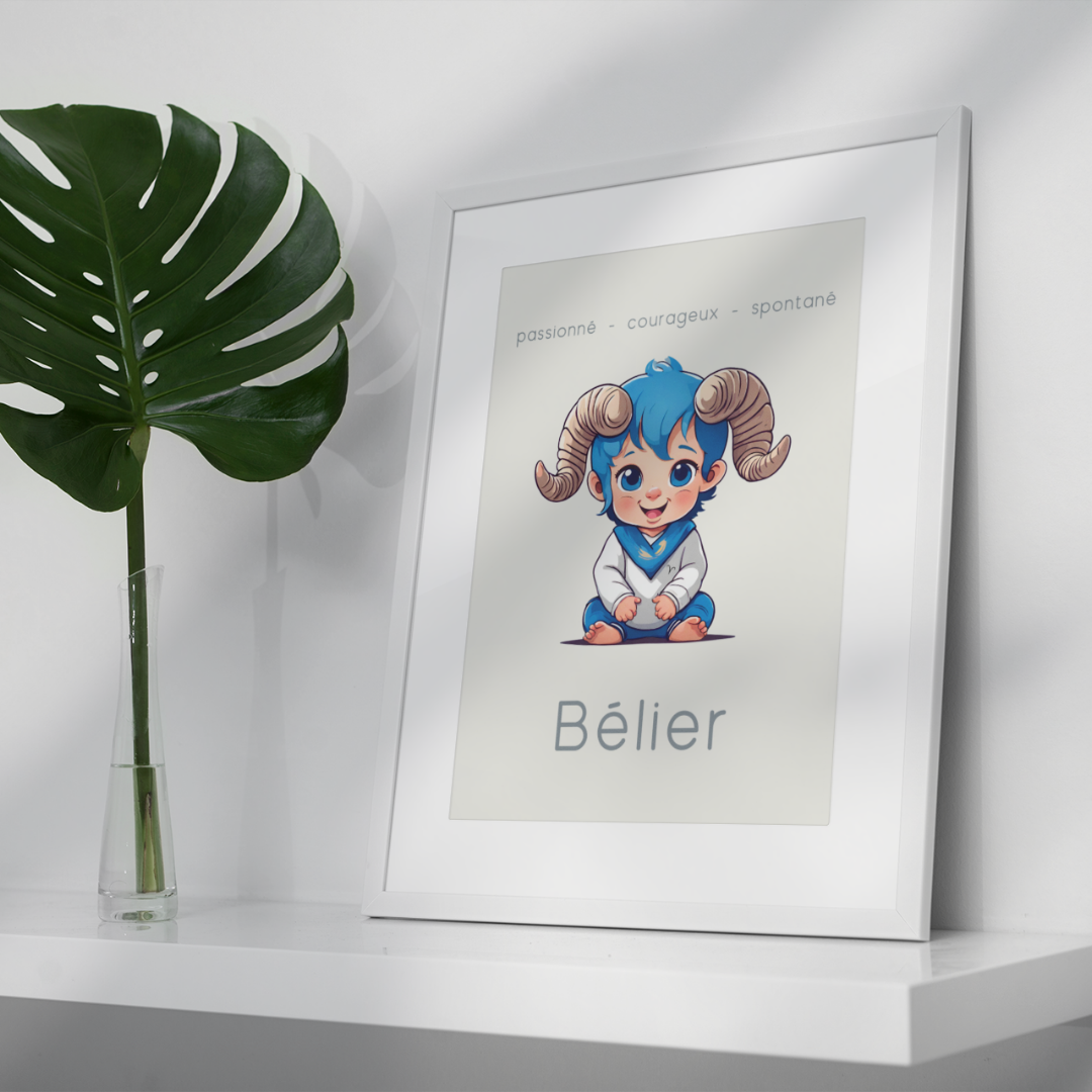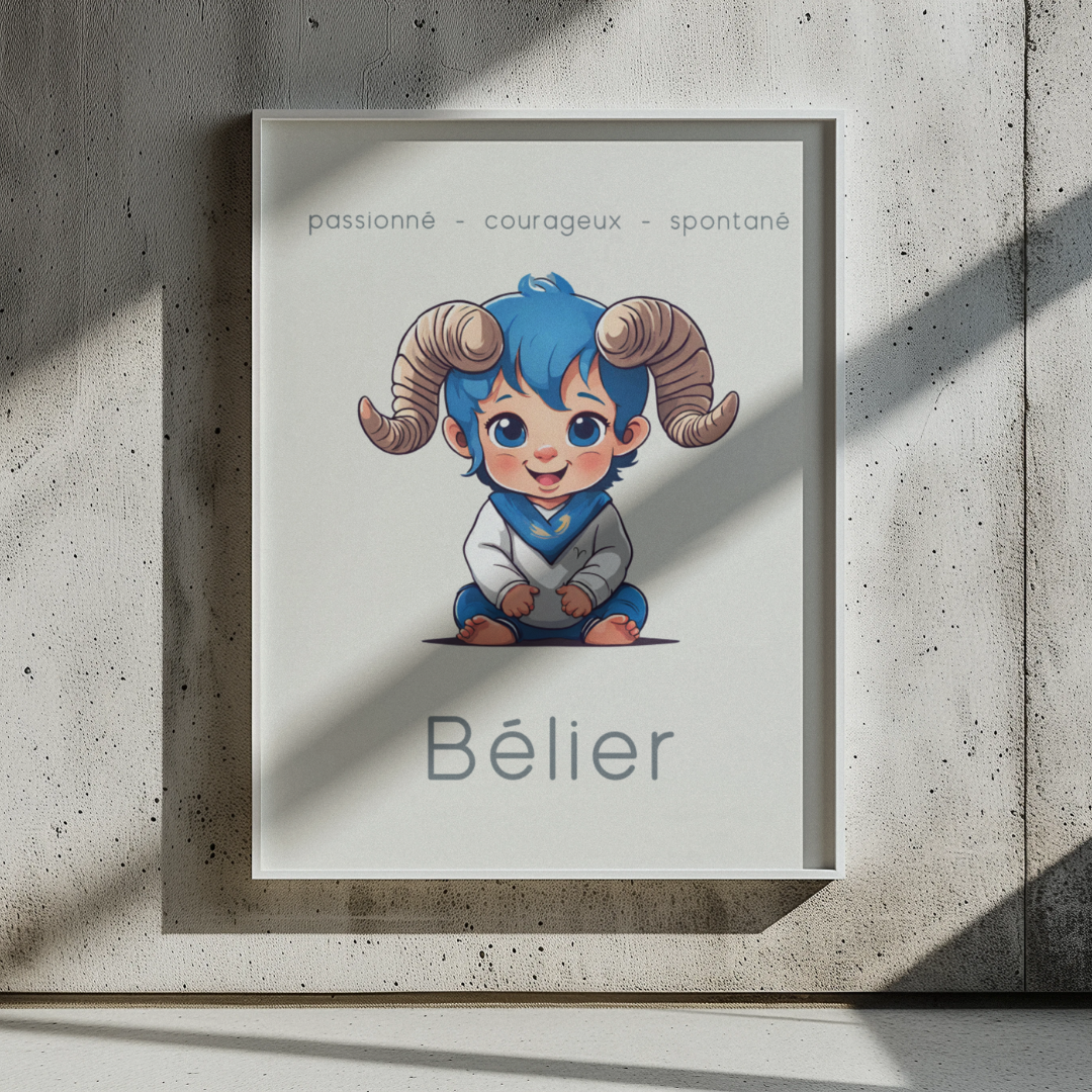 Ajoutez une touche d'énergie et de détermination à votre espace avec ce poster conçu pour les petits garçons ou les hommes ayant gardé leur âme d’enfant, nés sous le signe du Bélier. Sur un fond beige, cette illustration enfantine du Bélier incarne la passion, le courage et la spontanéité de ce signe de feu.