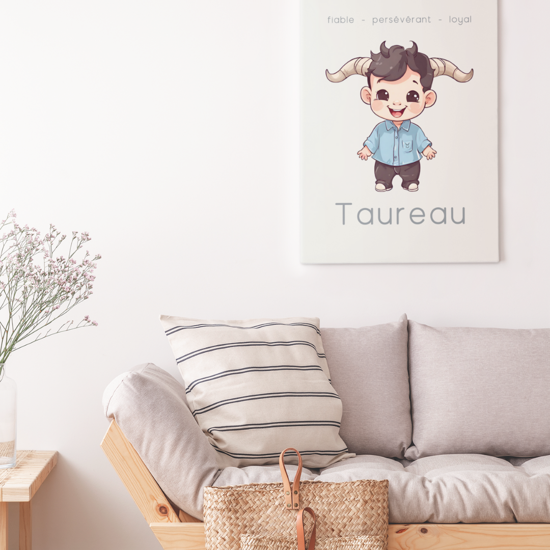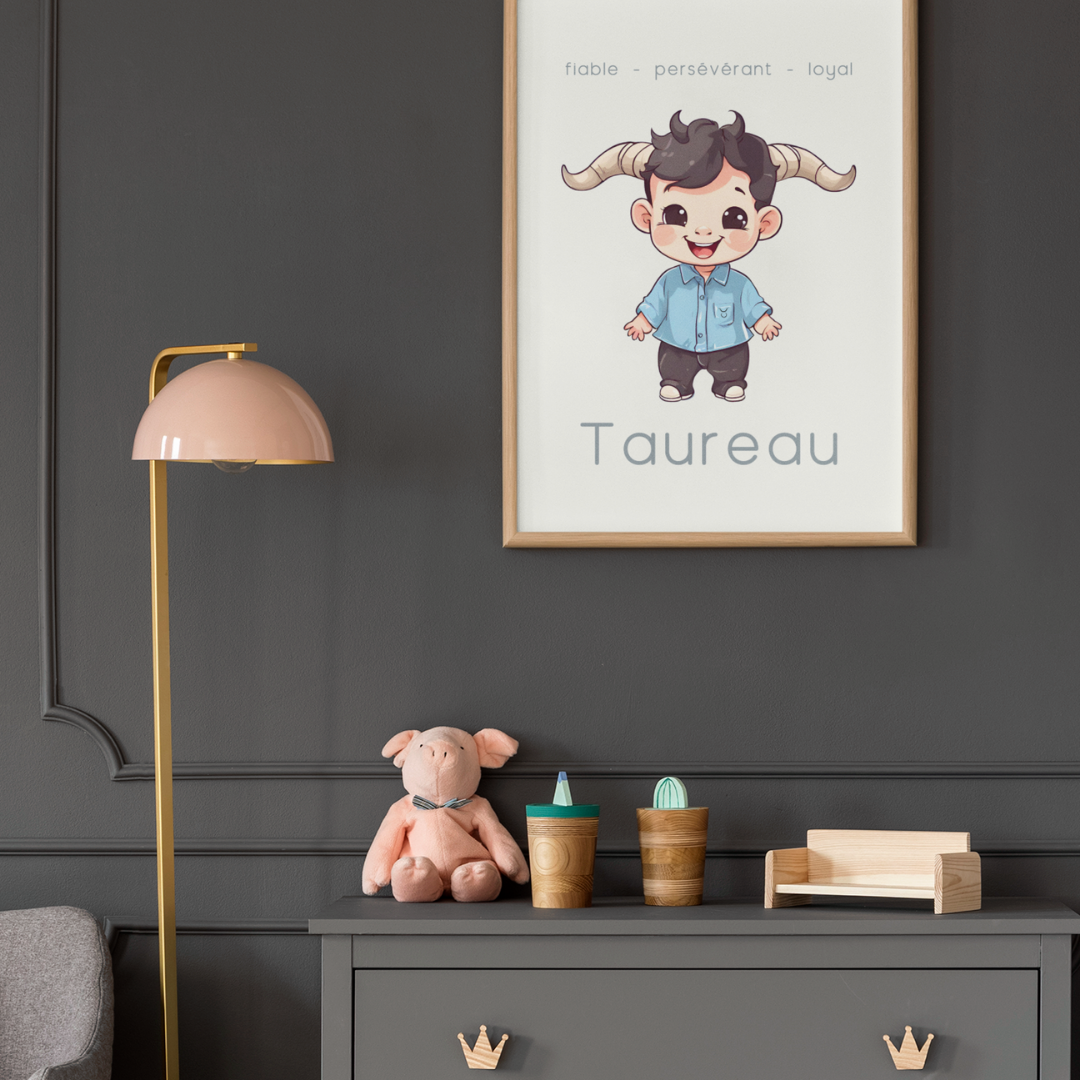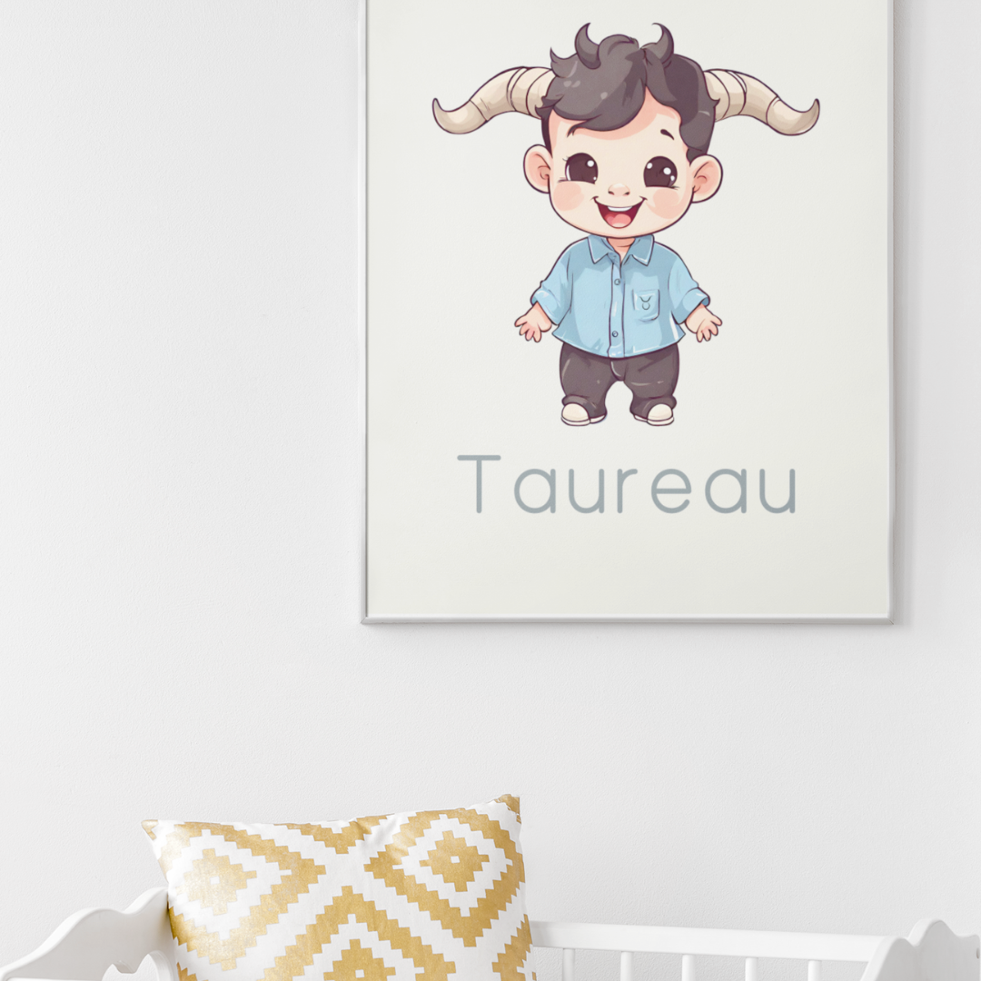 Apportez une touche de stabilité et de douceur à votre intérieur avec ce poster conçu pour les petits garçons ou les hommes ayant gardé leur âme d’enfant, nés sous le signe du Taureau. Sur un fond beige, cette illustration enfantine du Taureau incarne la fiabilité, la persévérance et la loyauté caractéristiques de ce signe de terre.