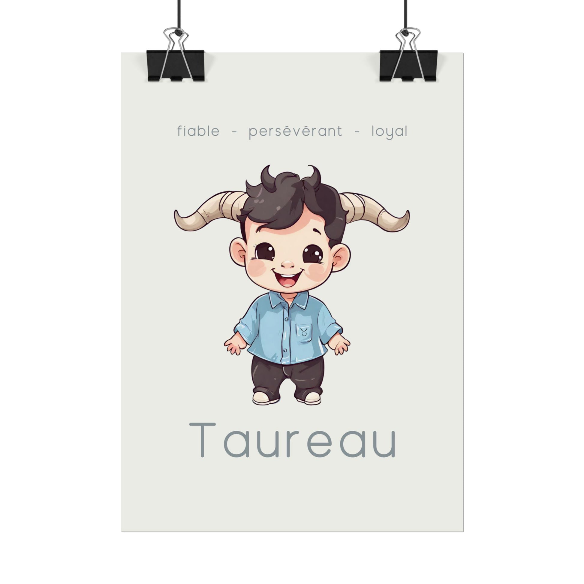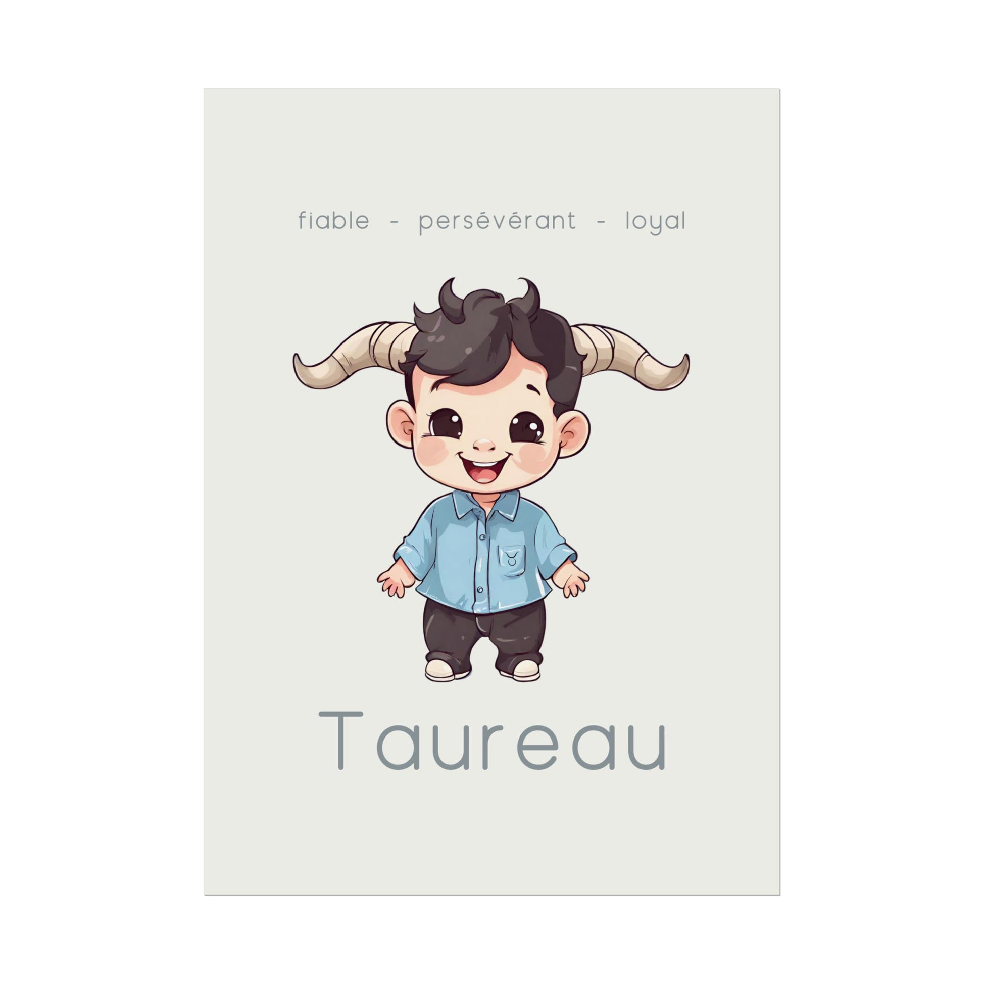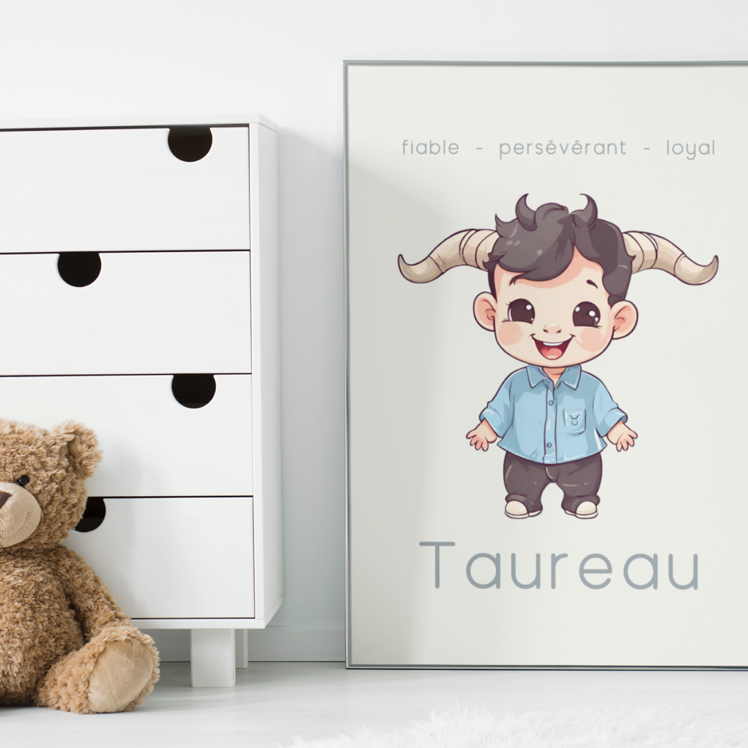 Apportez une touche de stabilité et de douceur à votre intérieur avec ce poster conçu pour les petits garçons ou les hommes ayant gardé leur âme d’enfant, nés sous le signe du Taureau. Sur un fond beige, cette illustration enfantine du Taureau incarne la fiabilité, la persévérance et la loyauté caractéristiques de ce signe de terre.