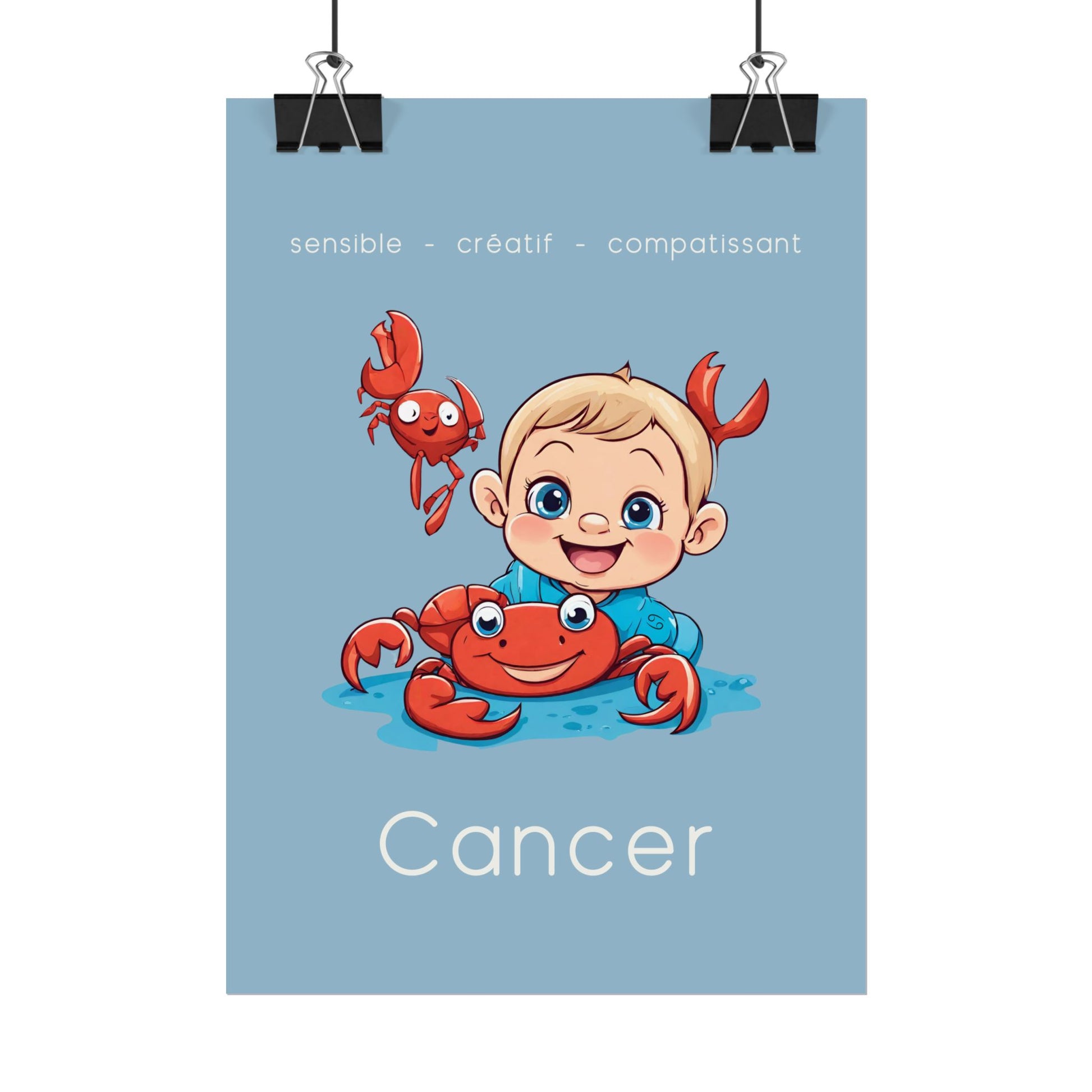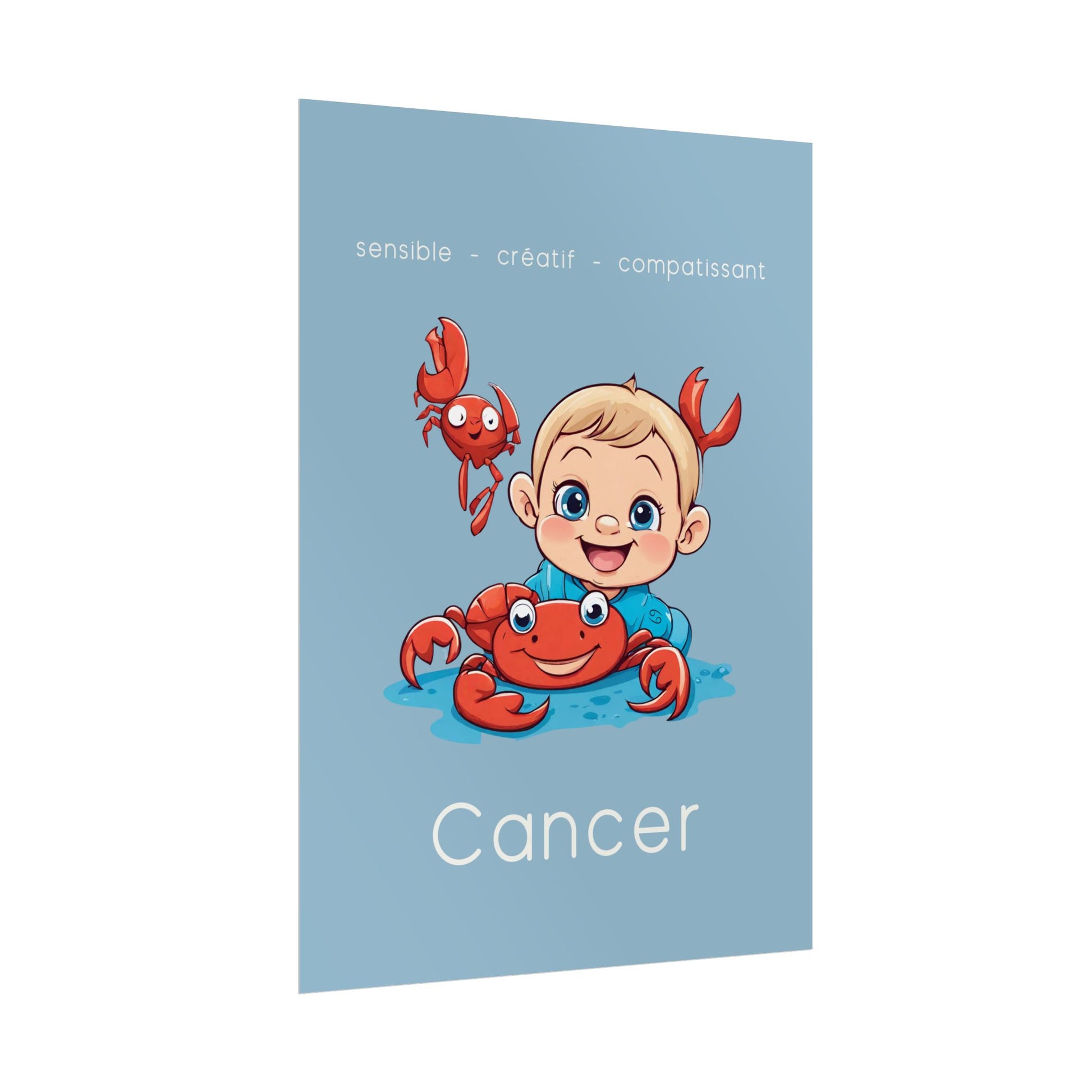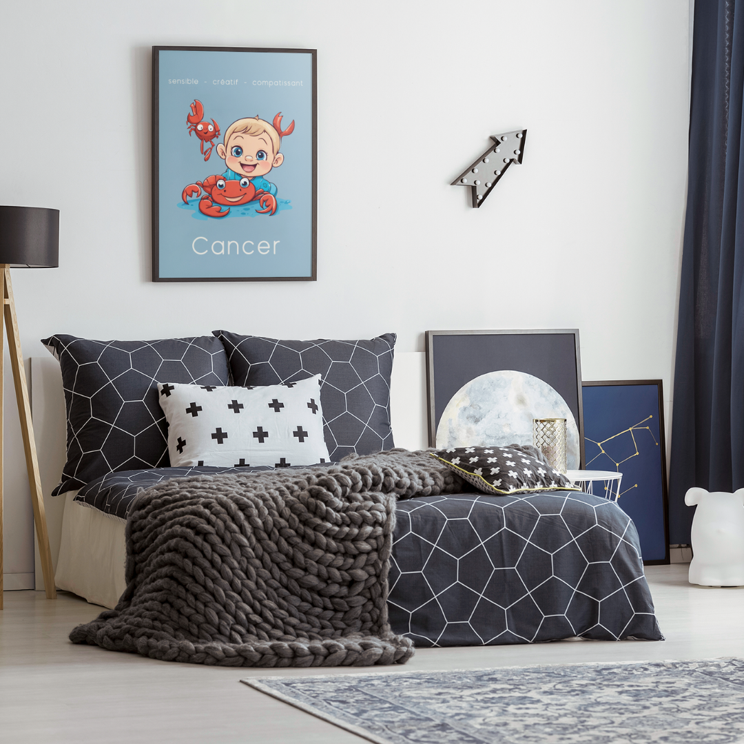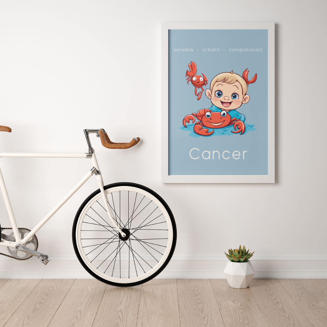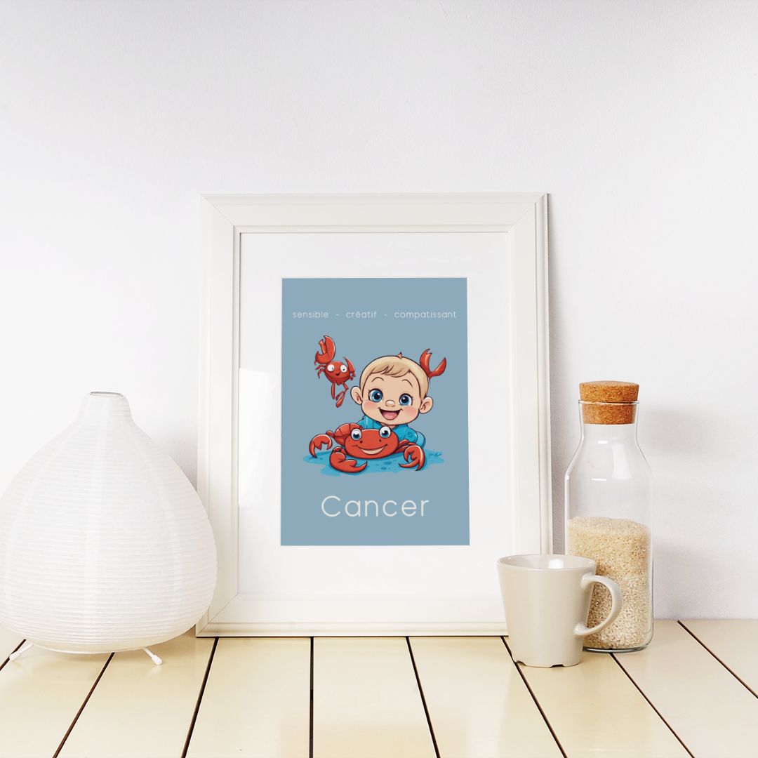 Ajoutez une touche de douceur et d’empathie à votre décoration avec ce poster spécialement conçu pour les petits garçons ou les hommes ayant conservé leur âme d’enfant, nés sous le signe du Cancer. Cette illustration enfantine reflète la sensibilité, la créativité et la compassion caractéristiques de ce signe d’eau.