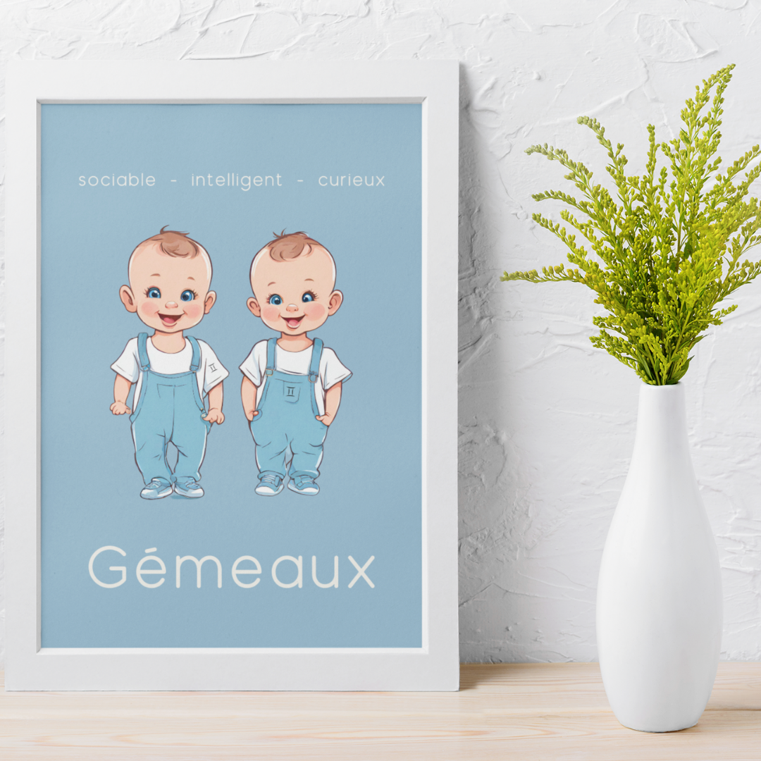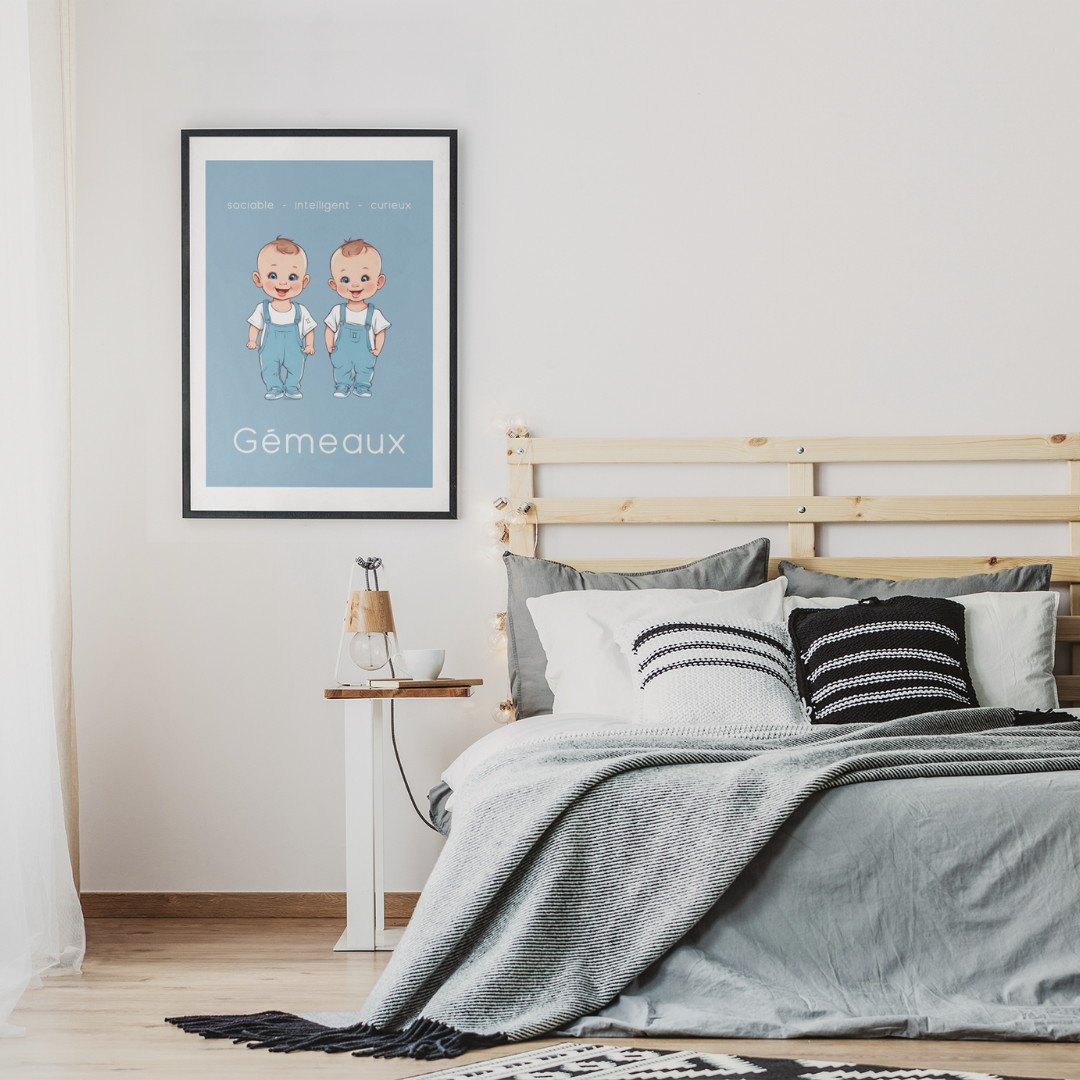 Ajoutez une touche de vivacité et de curiosité à votre intérieur avec ce poster conçu pour les petits garçons ou les hommes ayant gardé leur âme d’enfant, nés sous le signe des Gémeaux. Cette illustration enfantine des Gémeaux incarne la sociabilité, l’intelligence et la curiosité propres à ce signe d’air.