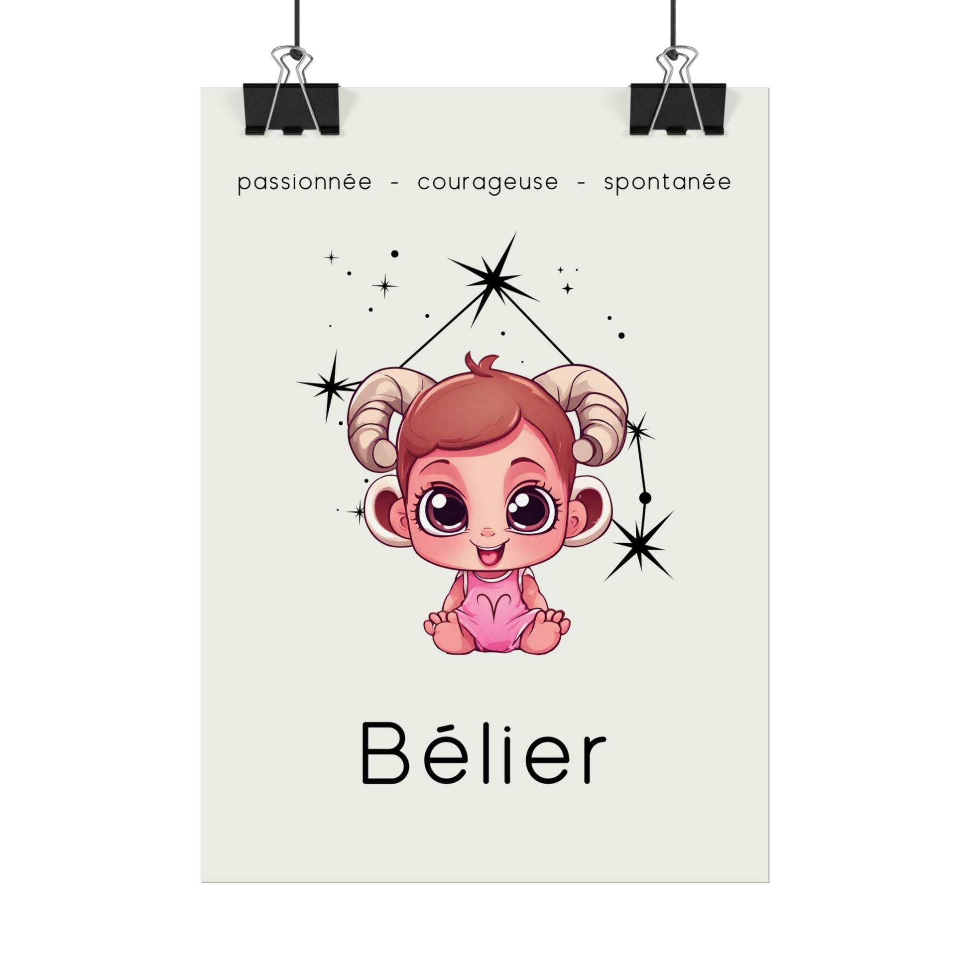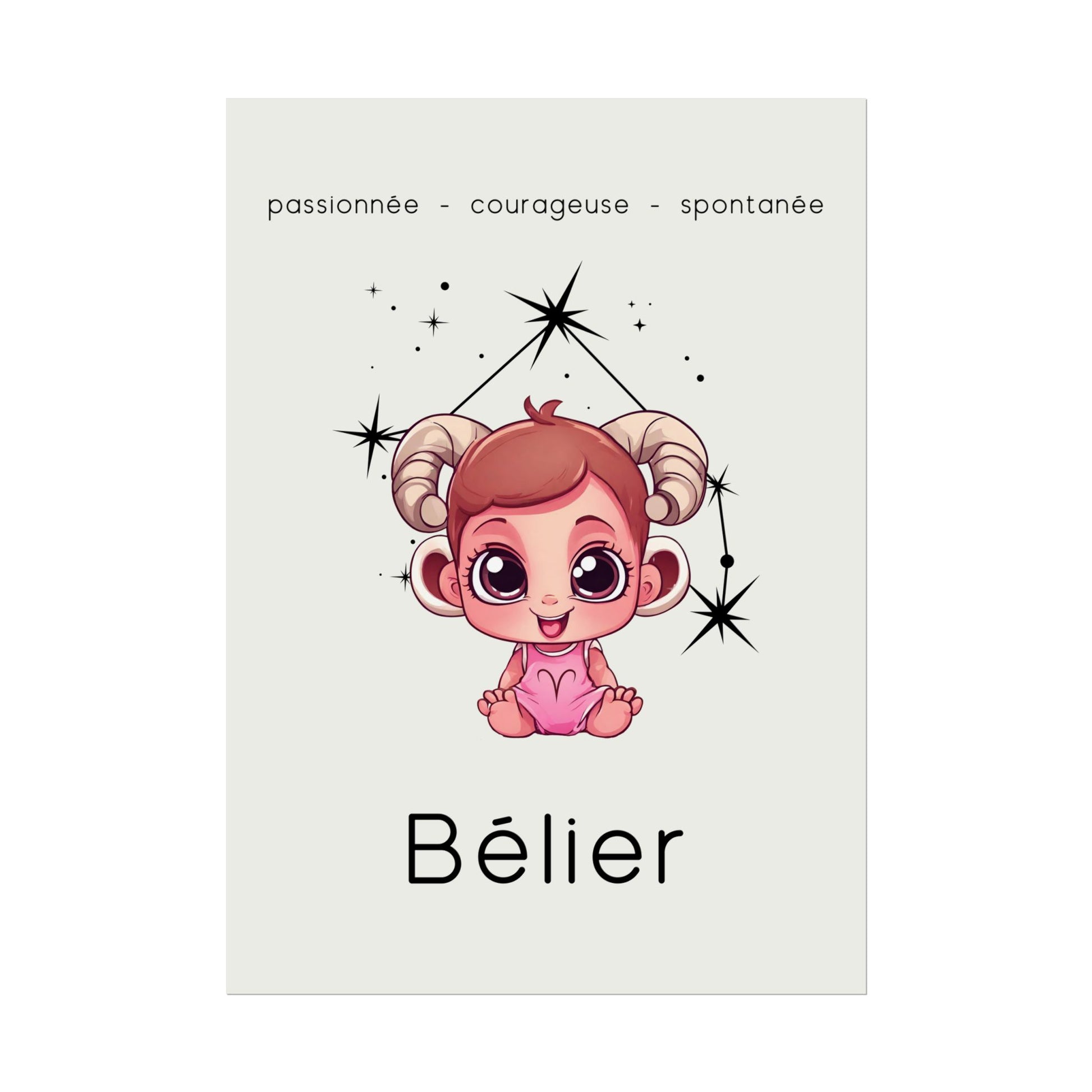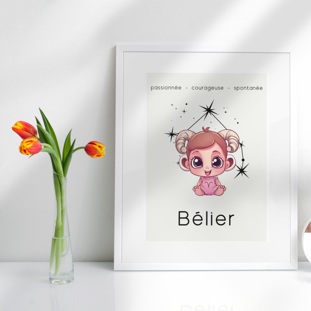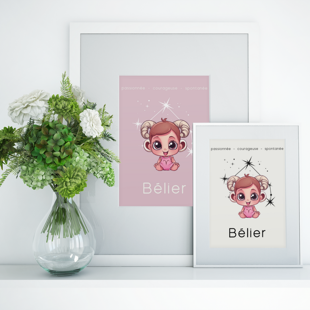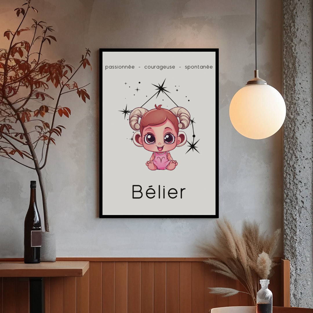 Apportez une touche douce et pétillante à votre intérieur avec ce poster conçu pour les petites filles ou les femmes qui ont gardé leur âme d'enfant. Sur un fond beige délicat, cette illustration enfantine du signe Bélier, accompagnée de sa constellation, capture l’esprit passionné, courageux et spontané de ce signe de feu.
