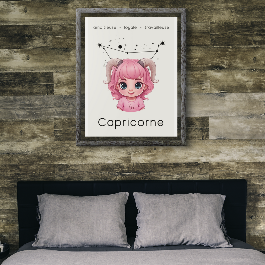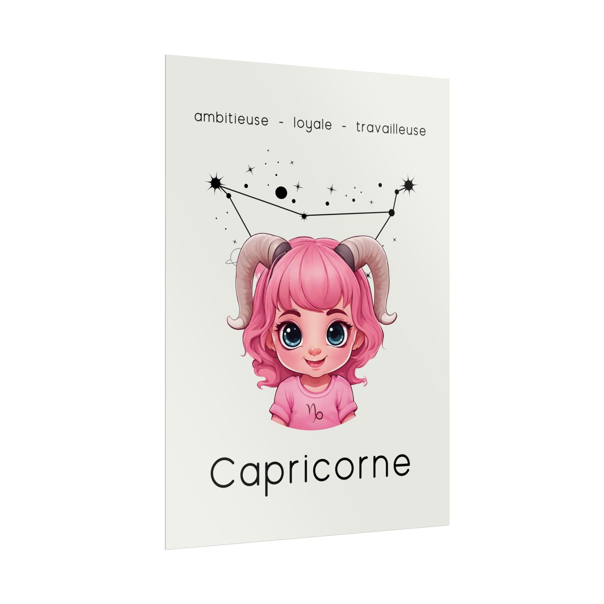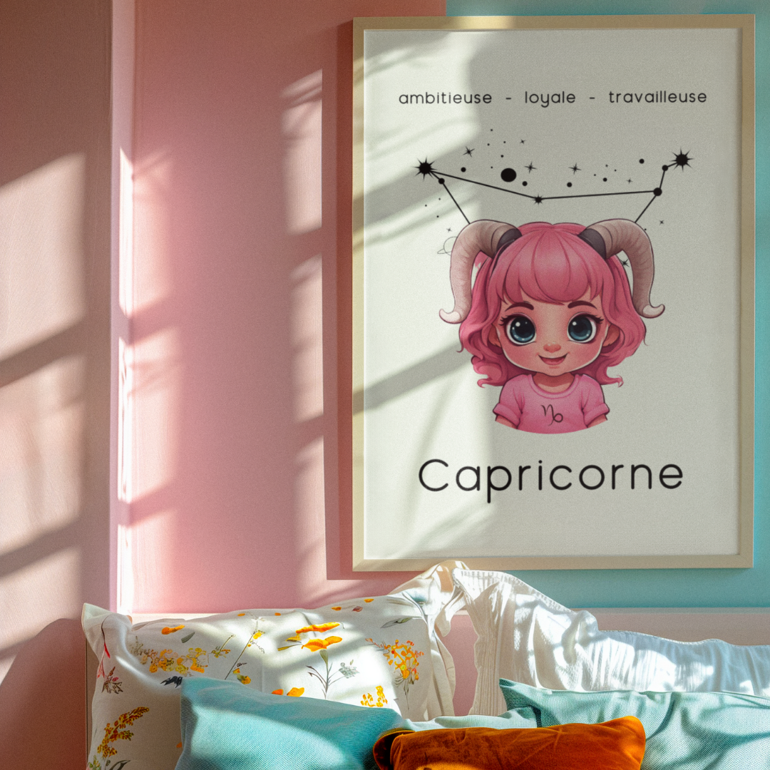 Apportez une touche de détermination et de sagesse à votre espace avec ce poster conçu pour les petites filles ou les femmes ayant conservé leur âme d’enfant, nées sous le signe du Capricorne. Sur un fond beige apaisant, cette illustration enfantine du Capricorne, accompagnée de sa constellation, incarne l'ambition, la loyauté et l'esprit travailleur de ce signe de terre.