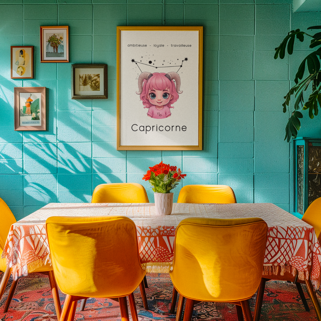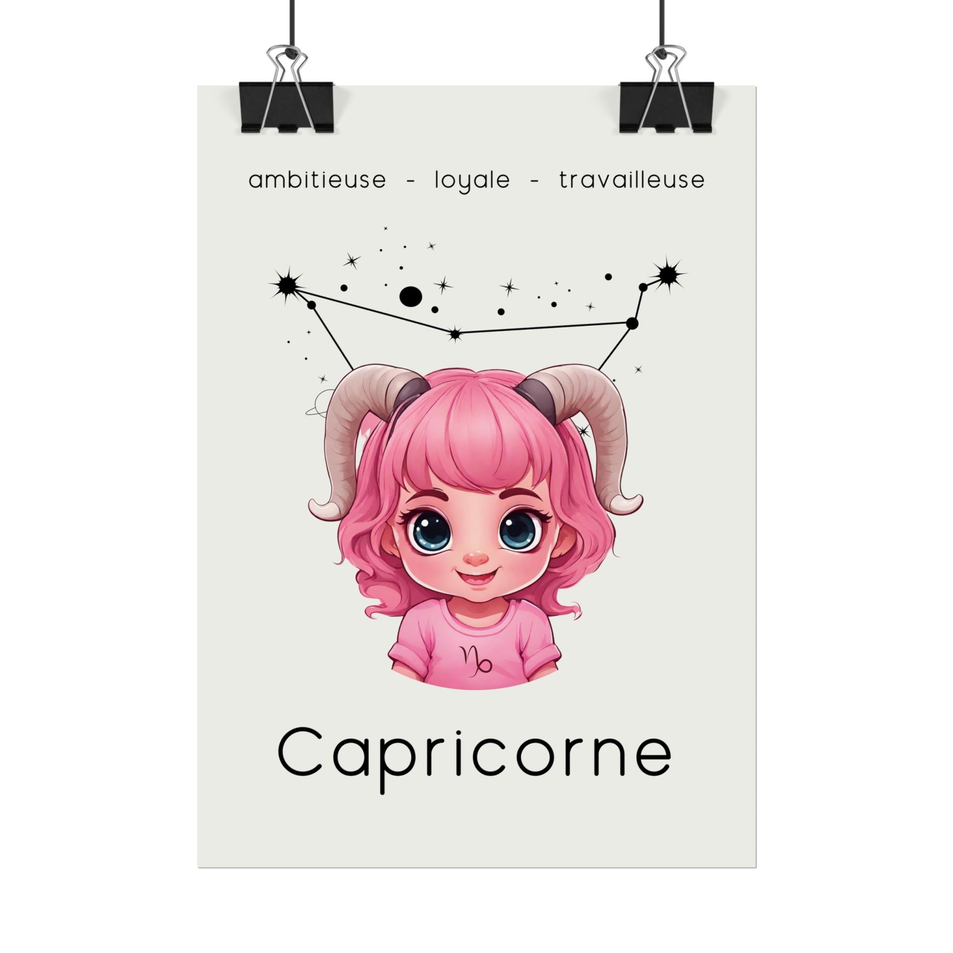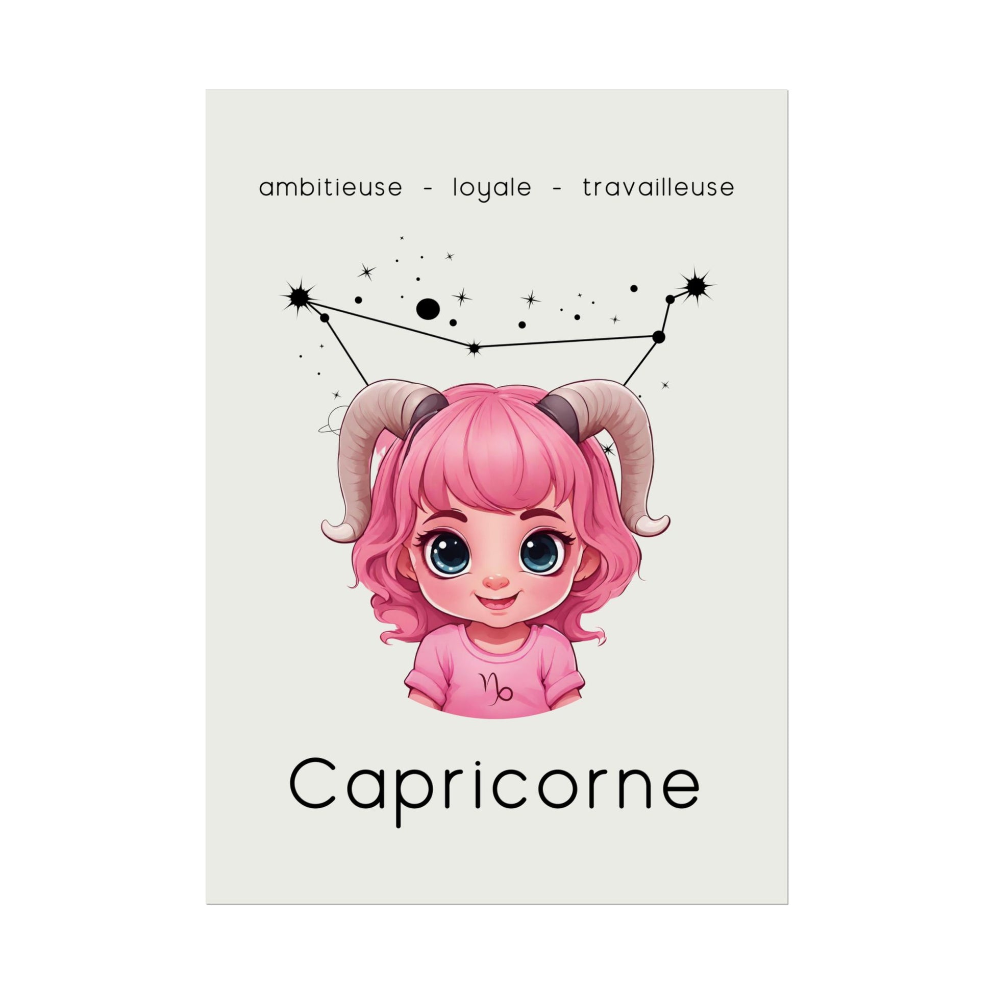 Apportez une touche de détermination et de sagesse à votre espace avec ce poster conçu pour les petites filles ou les femmes ayant conservé leur âme d’enfant, nées sous le signe du Capricorne. Sur un fond beige apaisant, cette illustration enfantine du Capricorne, accompagnée de sa constellation, incarne l'ambition, la loyauté et l'esprit travailleur de ce signe de terre.