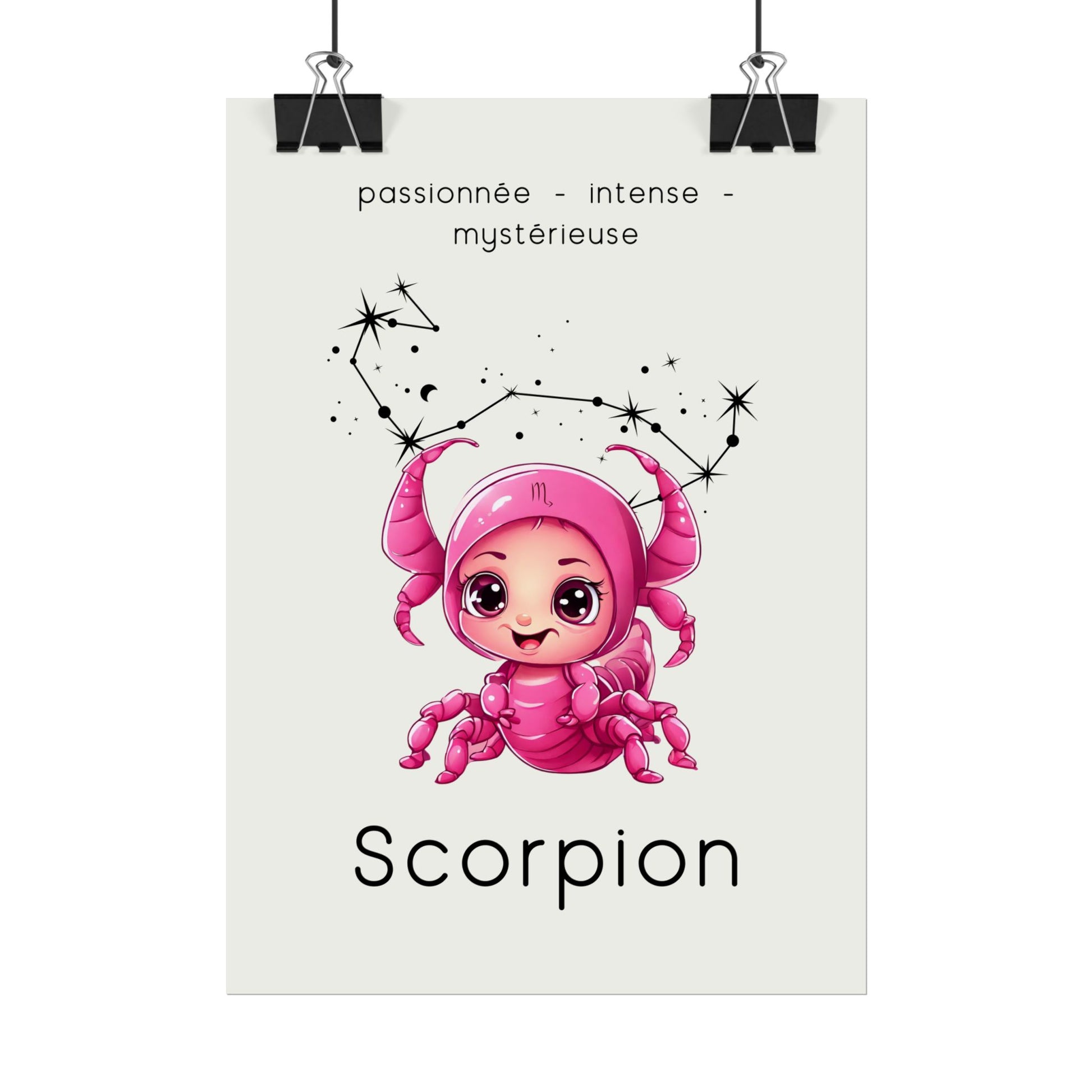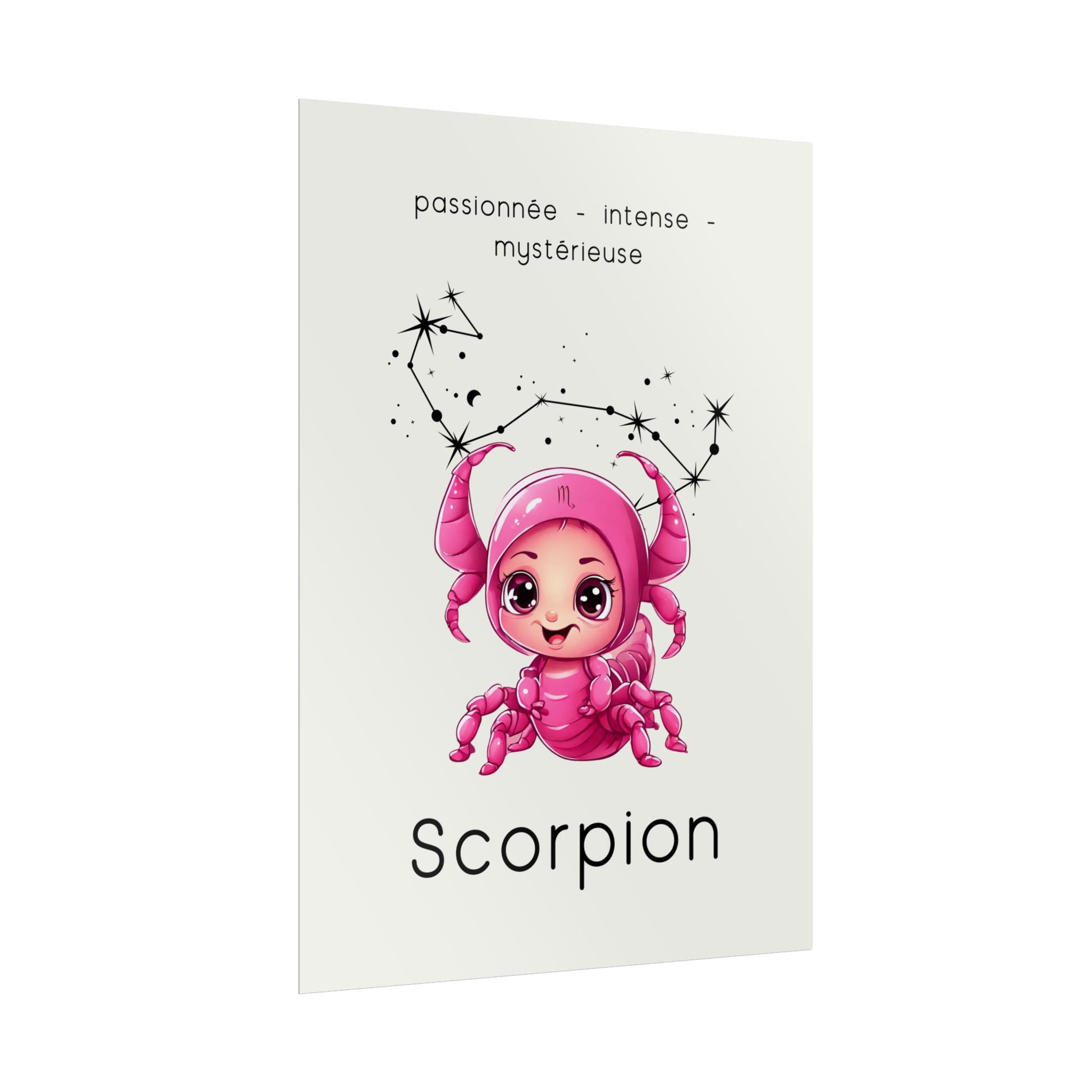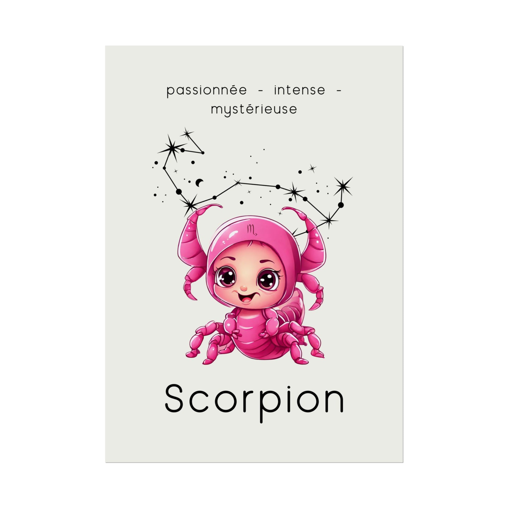 Ajoutez une ambiance profonde et captivante à votre espace avec ce poster conçu pour les petites filles ou les femmes qui ont gardé leur âme d’enfant, nées sous le signe du Scorpion. Sur un fond beige intense, cette illustration enfantine du Scorpion, accompagnée de sa constellation, célèbre la passion, l’intensité et le mystère caractéristiques de ce signe d’eau.