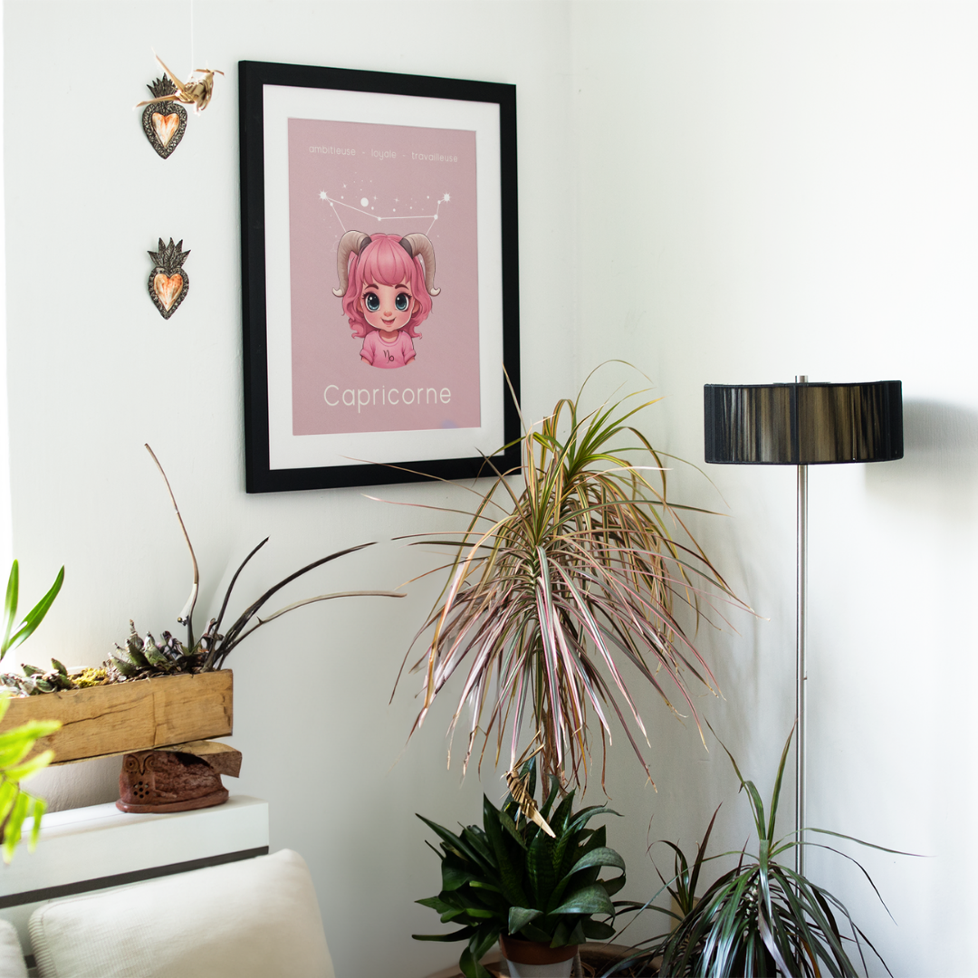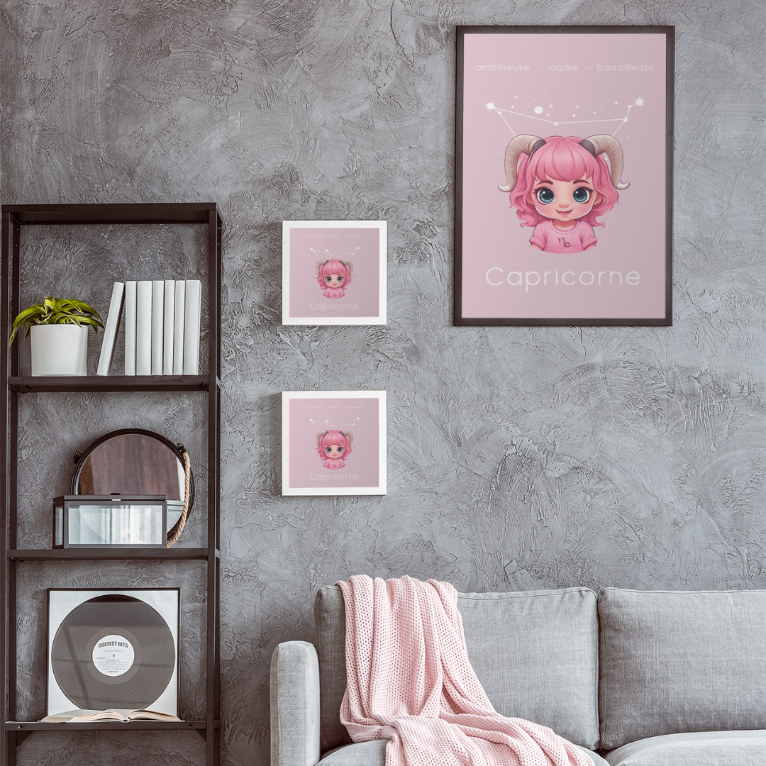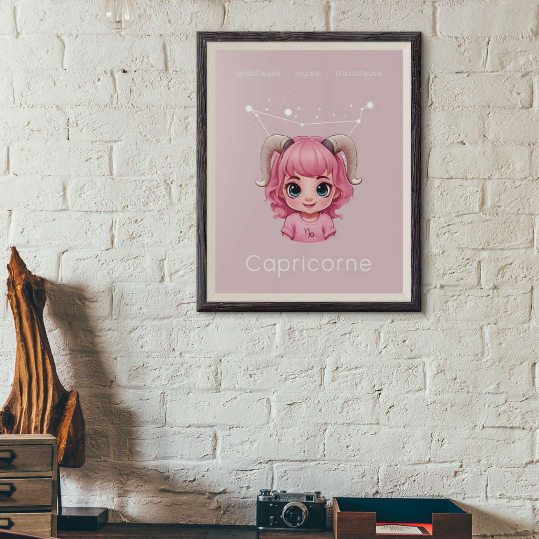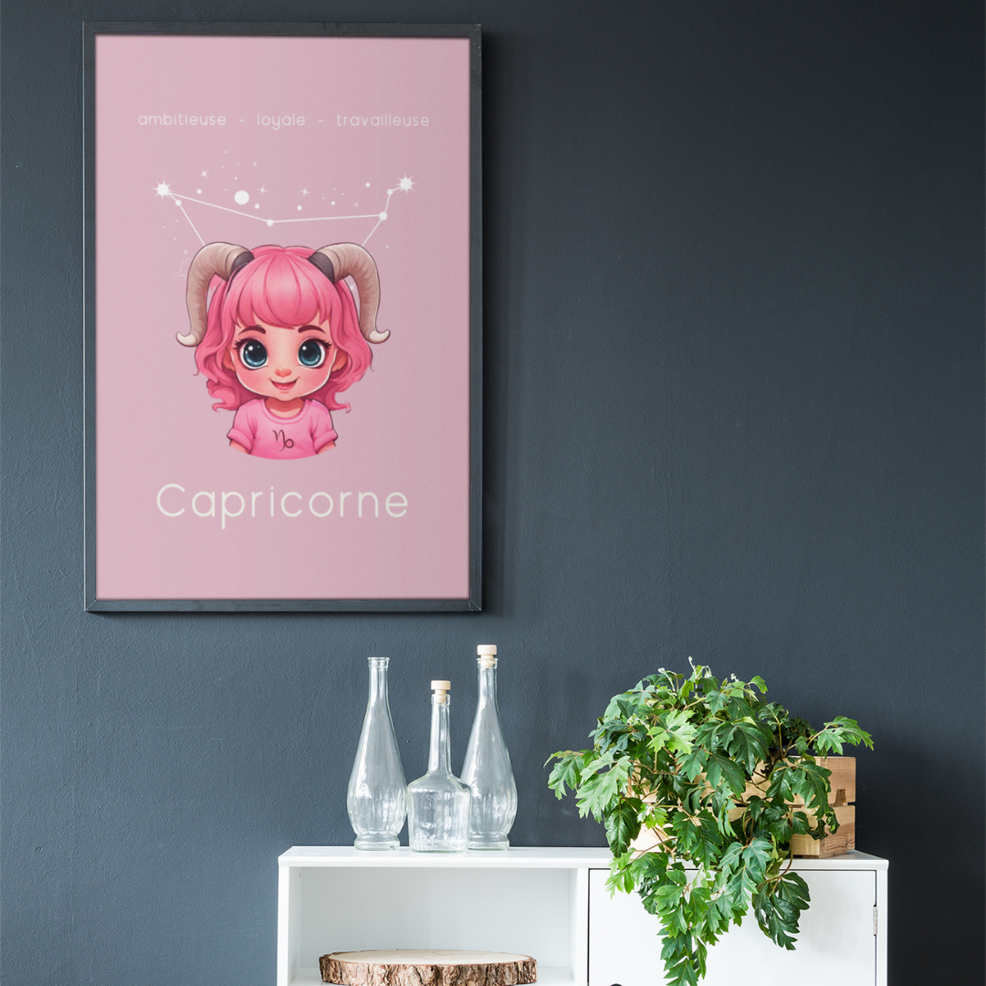 Apportez une touche de détermination et de sagesse à votre espace avec ce poster conçu pour les petites filles ou les femmes ayant conservé leur âme d’enfant, nées sous le signe du Capricorne. Sur un fond rose apaisant, cette illustration enfantine du Capricorne, accompagnée de sa constellation, incarne l'ambition, la loyauté et l'esprit travailleur de ce signe de terre.