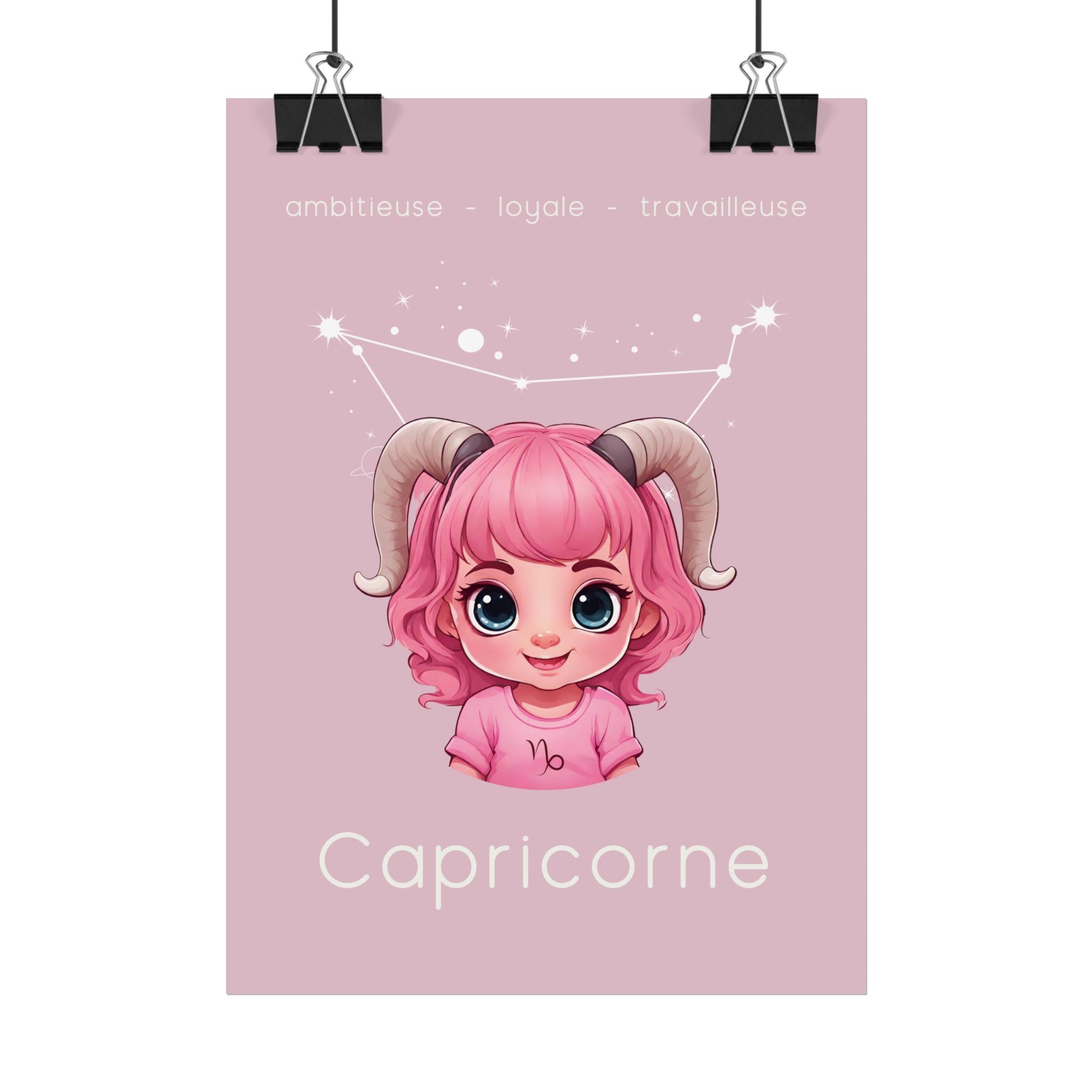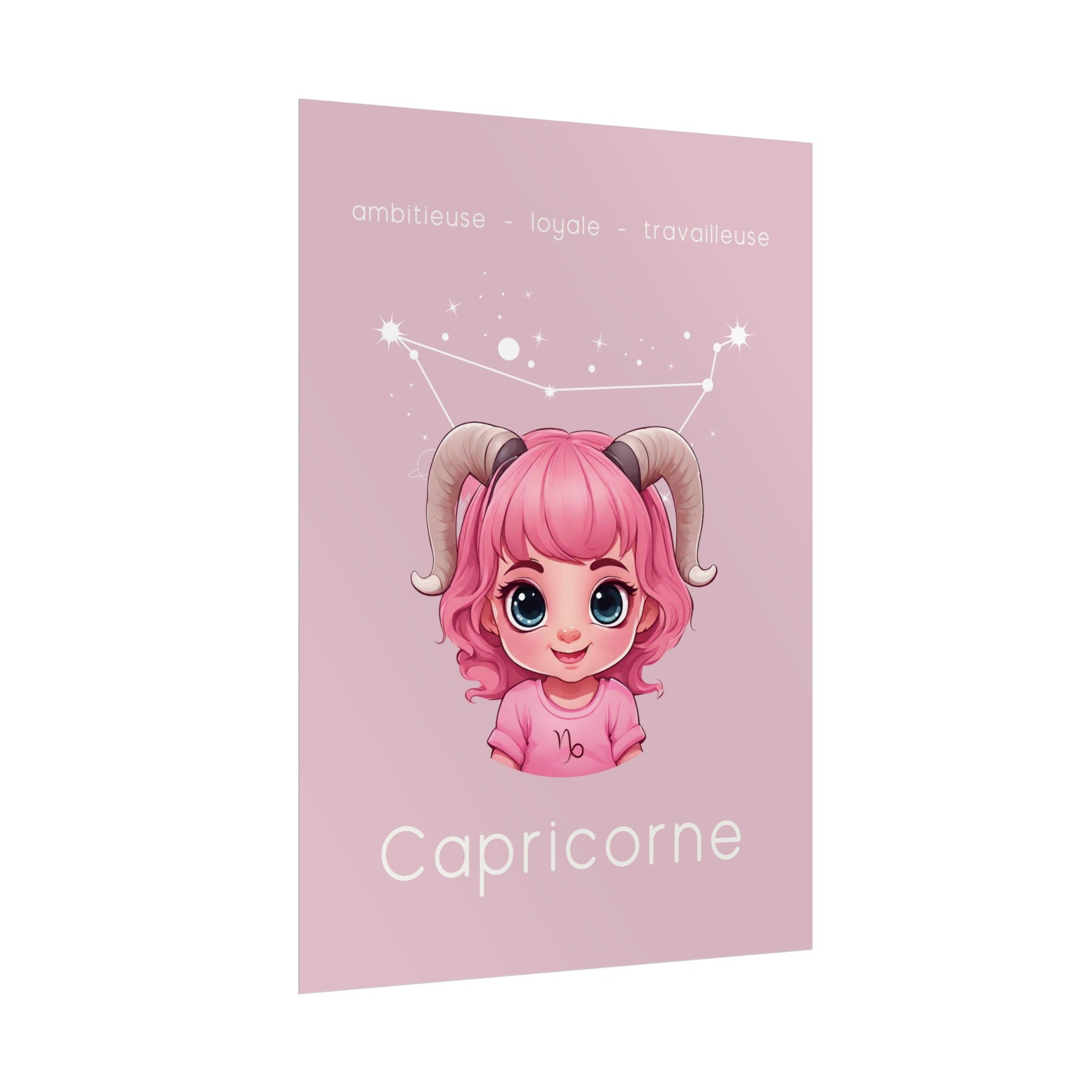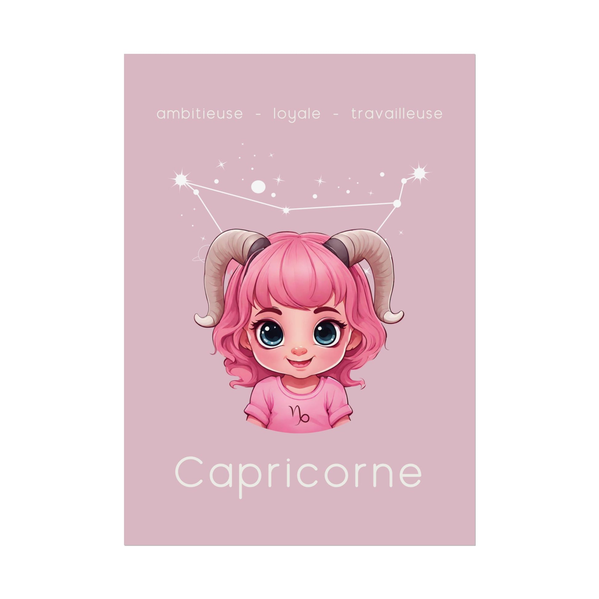 Apportez une touche de détermination et de sagesse à votre espace avec ce poster conçu pour les petites filles ou les femmes ayant conservé leur âme d’enfant, nées sous le signe du Capricorne. Sur un fond rose apaisant, cette illustration enfantine du Capricorne, accompagnée de sa constellation, incarne l'ambition, la loyauté et l'esprit travailleur de ce signe de terre.