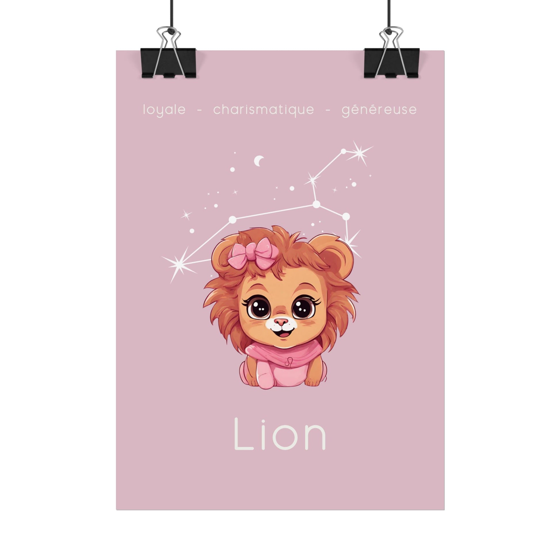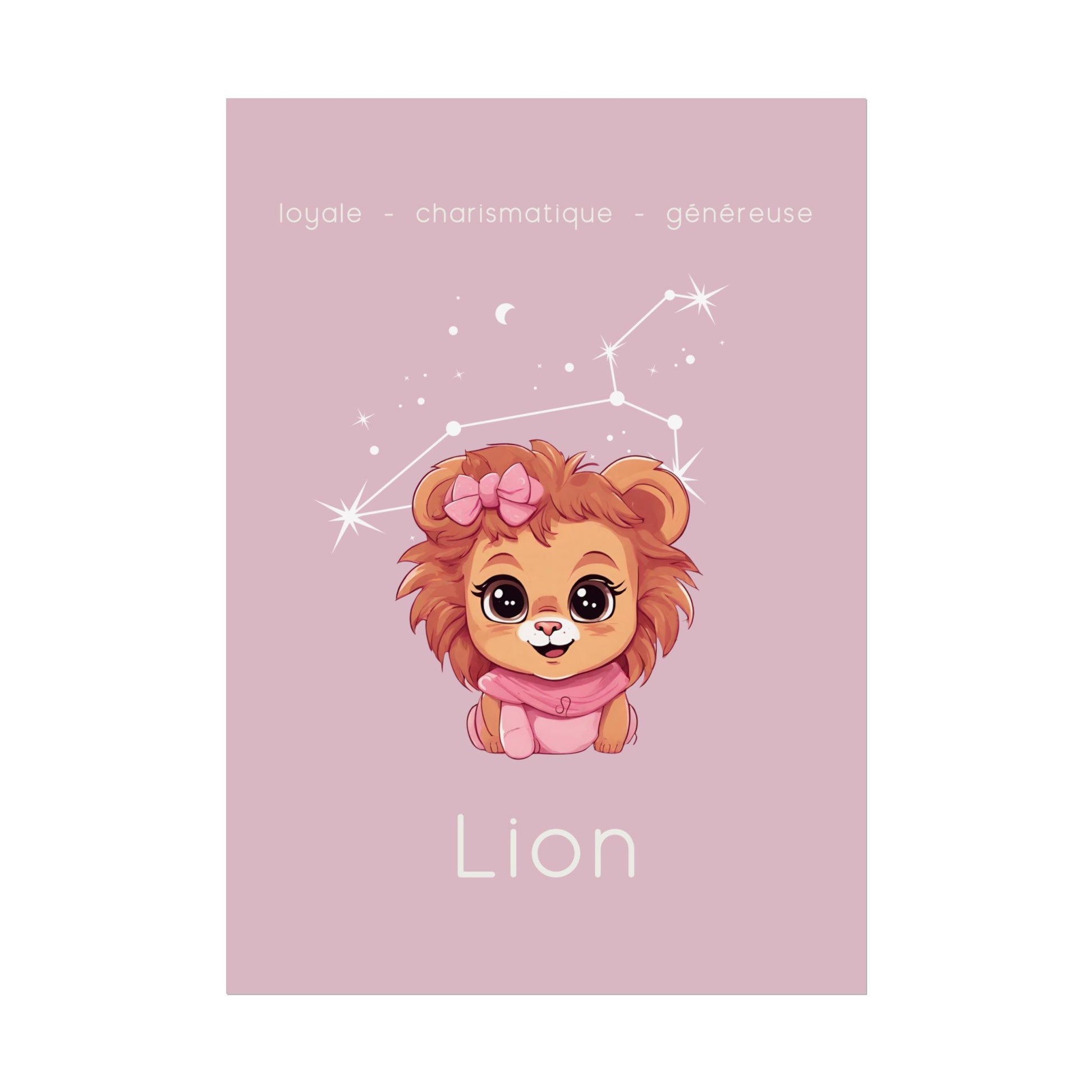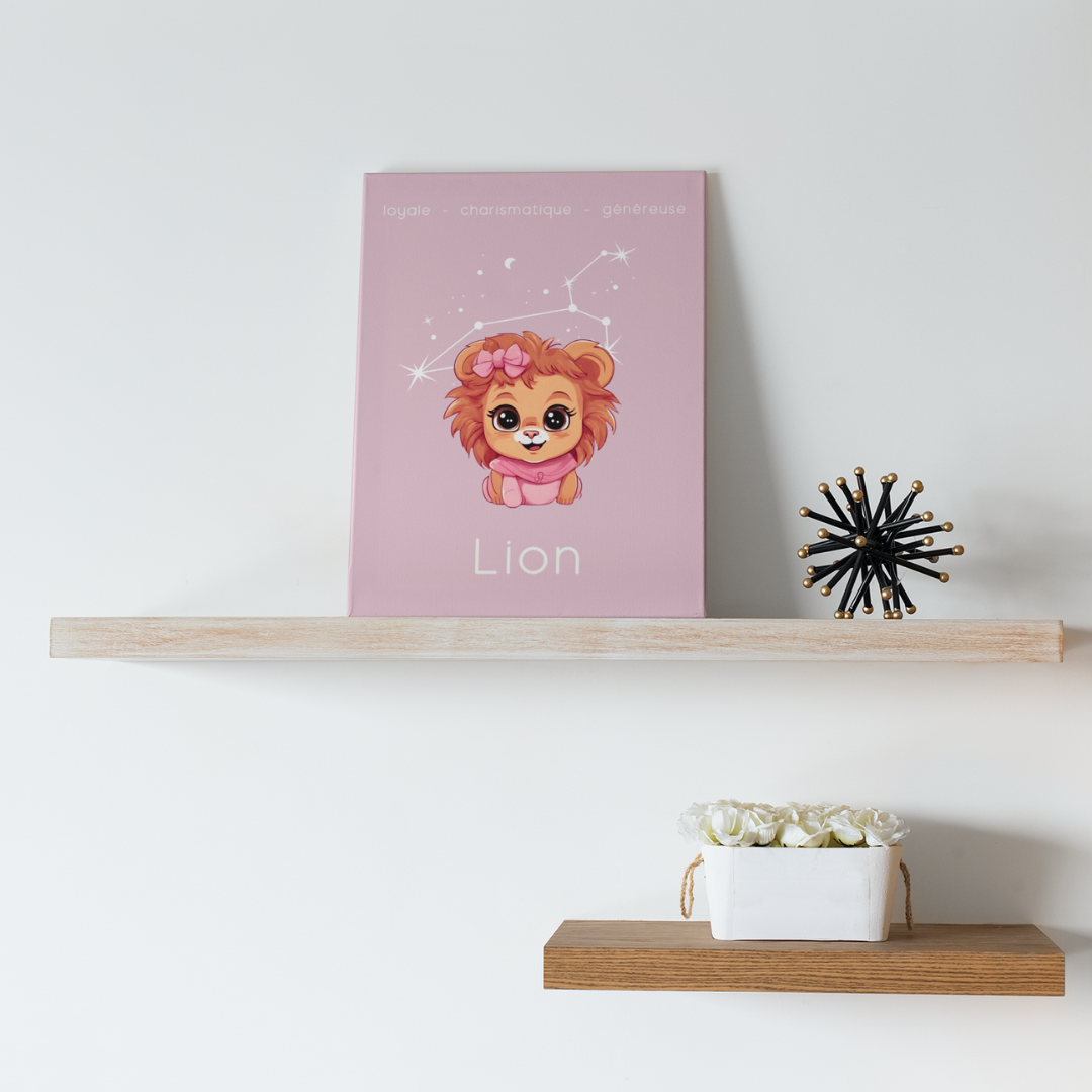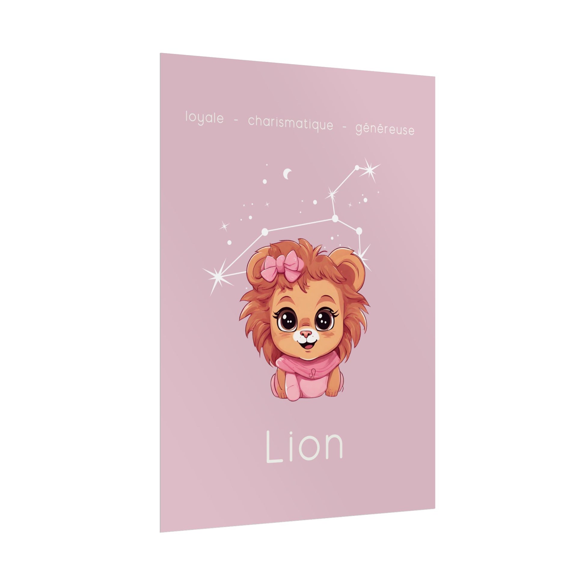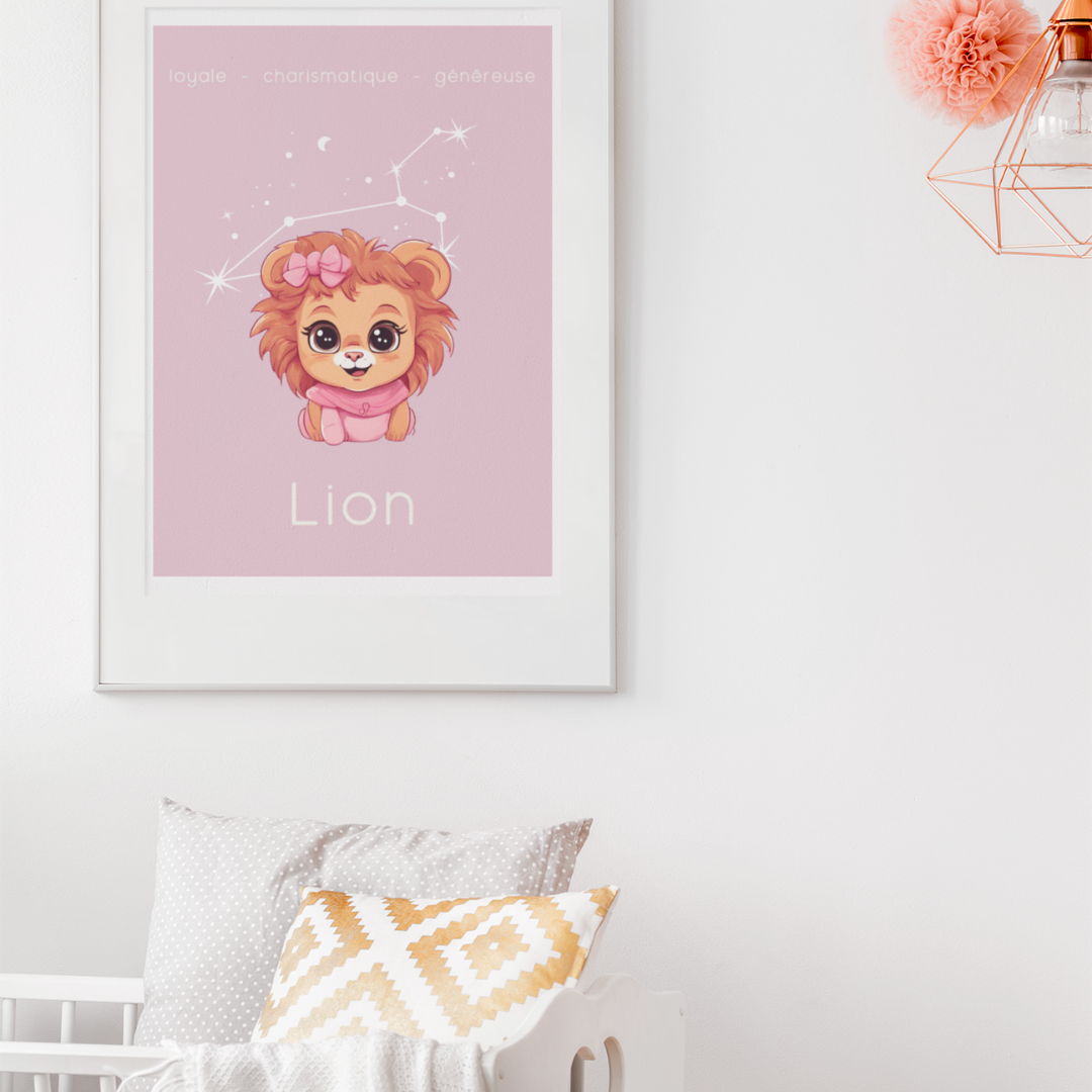 Ajoutez une touche rayonnante et chaleureuse à votre intérieur avec ce poster conçu pour les petites filles ou les femmes ayant gardé leur cœur d’enfant, nées sous le signe du Lion. Sur un fond rose éclatant, cette illustration enfantine du Lion, accompagnée de sa constellation, incarne la loyauté, le charisme et la générosité de ce signe de feu.