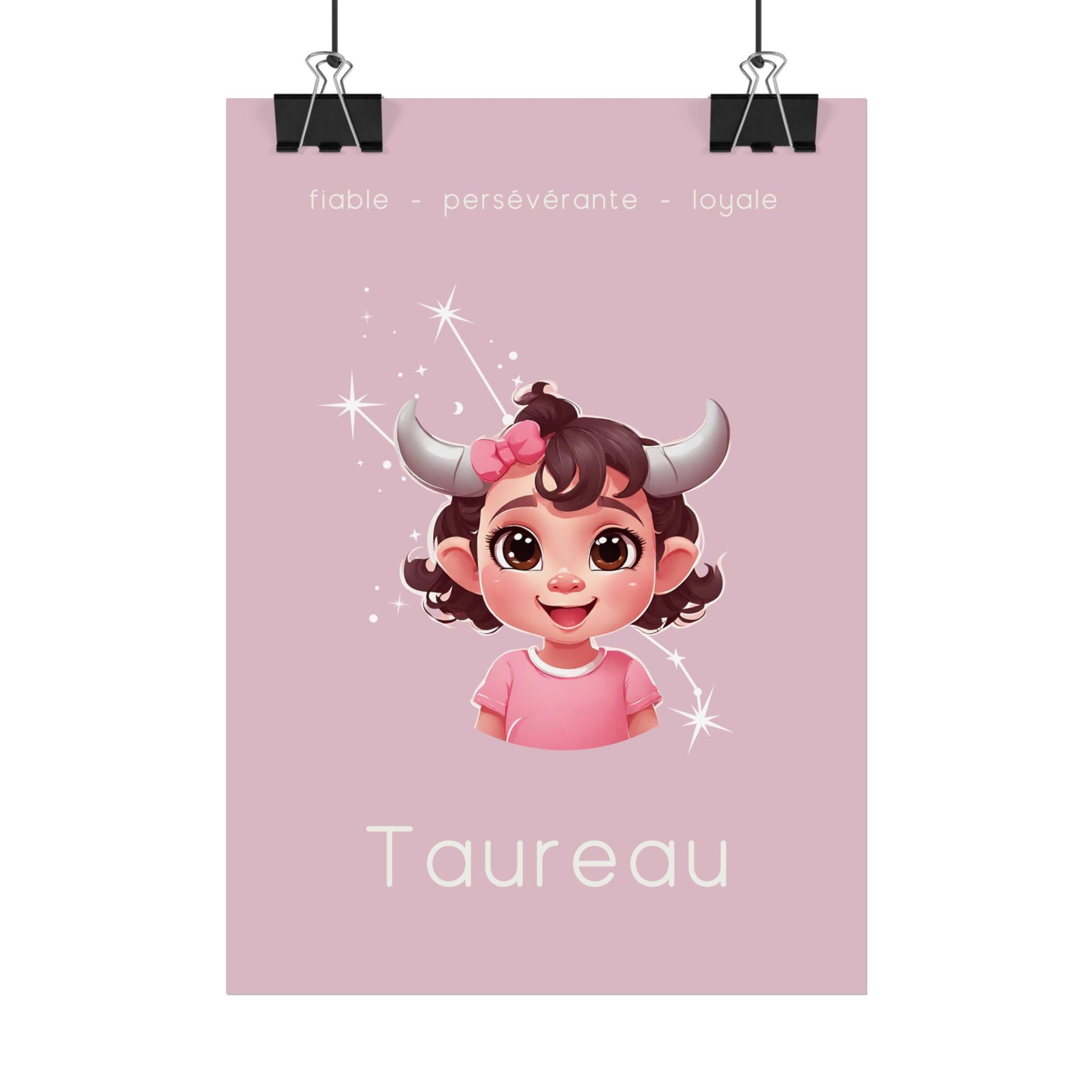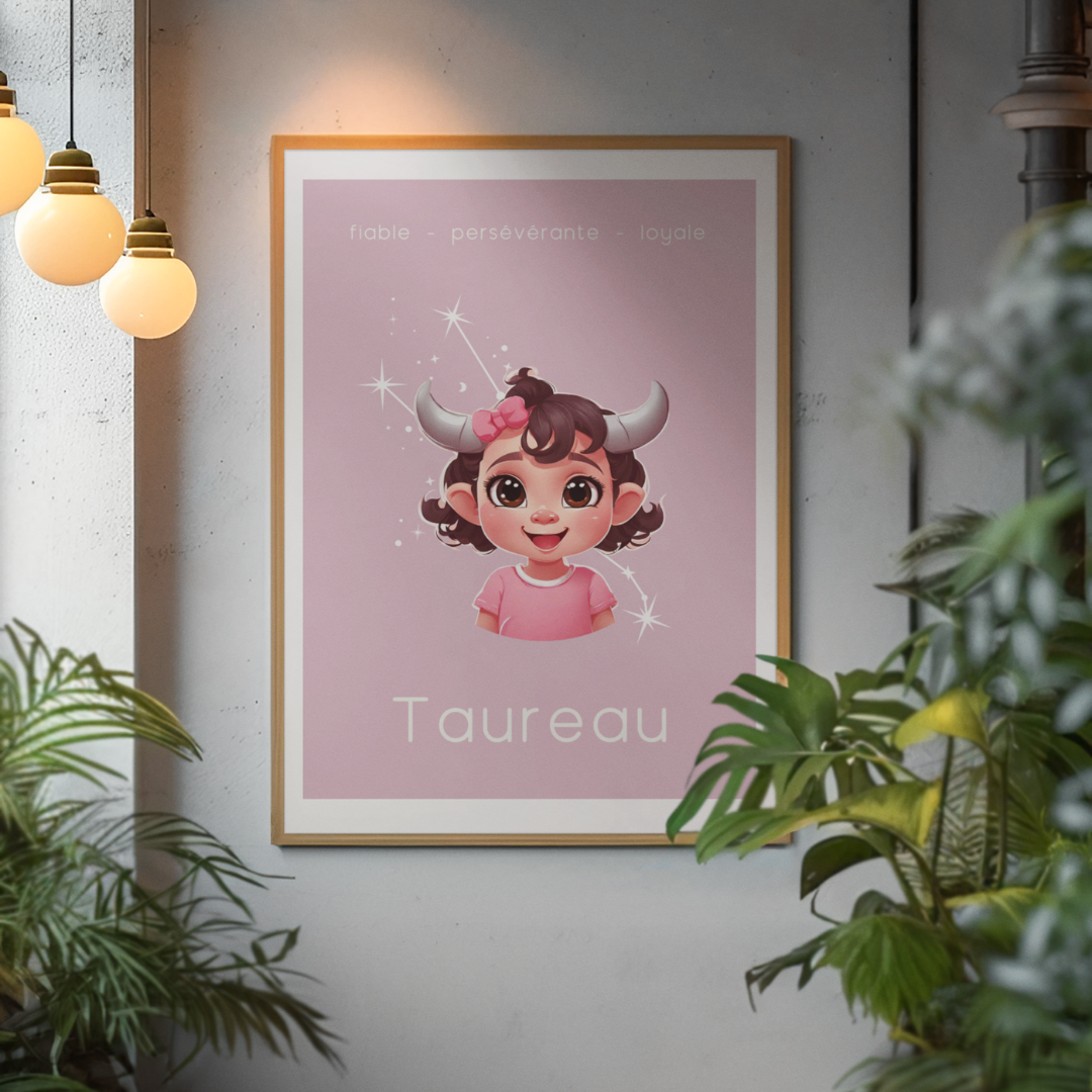 Apportez une touche de douceur et de charme à votre intérieur avec ce poster spécialement conçu pour les petites filles ou les femmes au cœur d'enfant nées sous le signe du Taureau. Sur un fond rose délicat, cette illustration enfantine du Taureau, avec sa constellation en arrière-plan, capture parfaitement l'esprit fiable, persévérant et loyal de ce signe de terre.