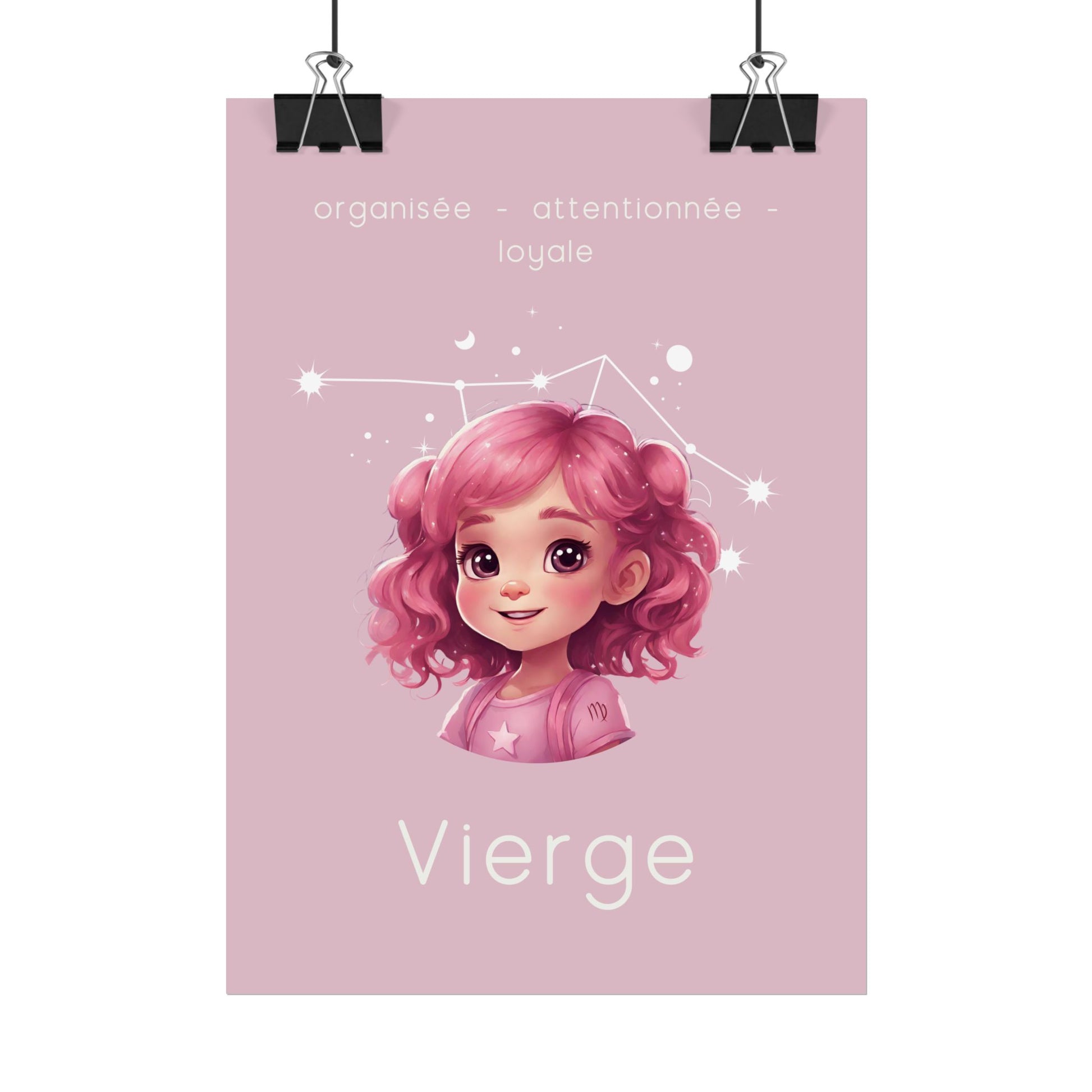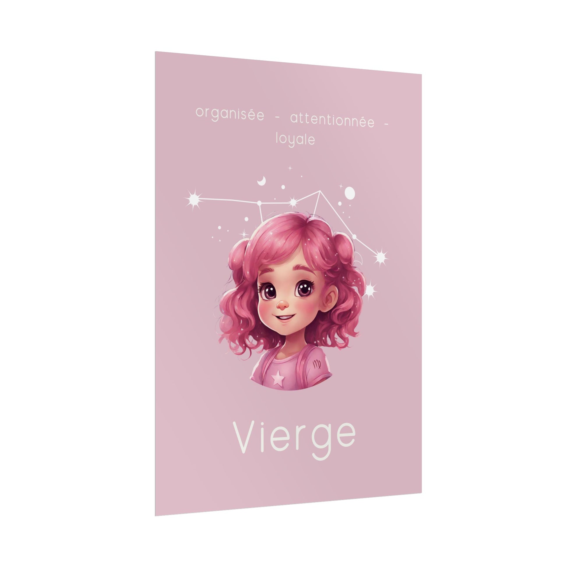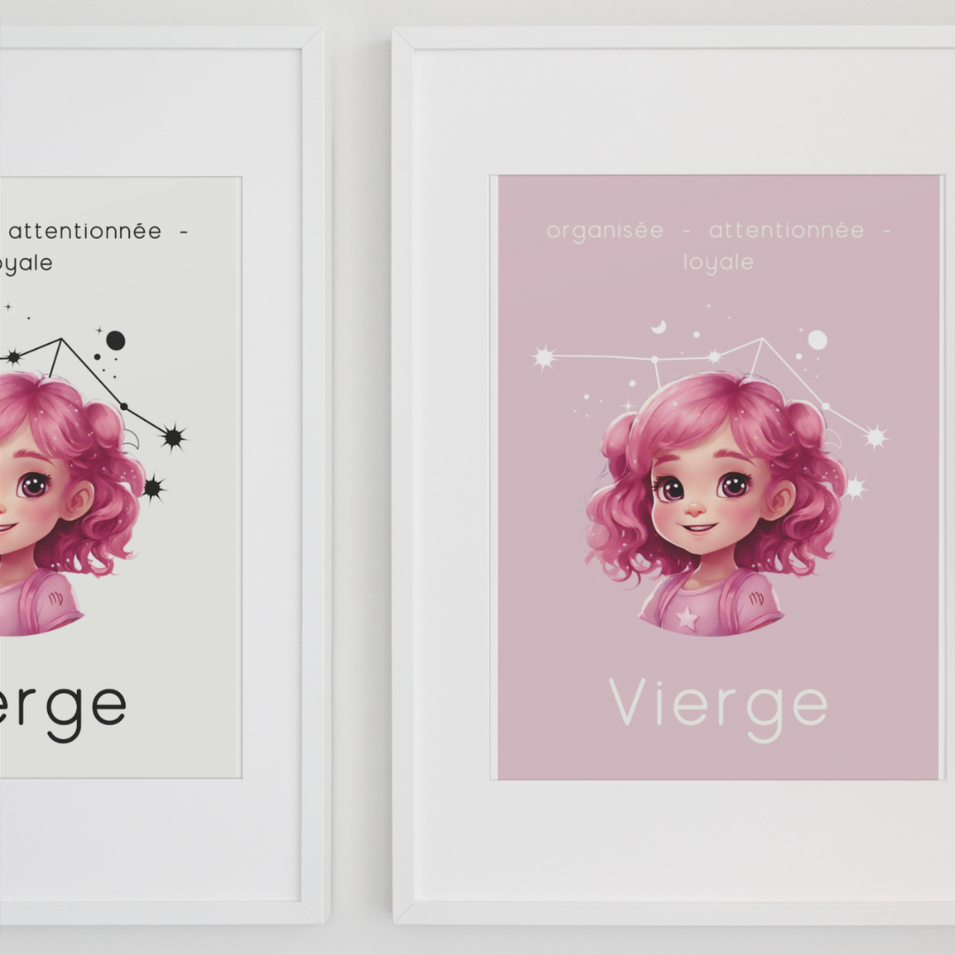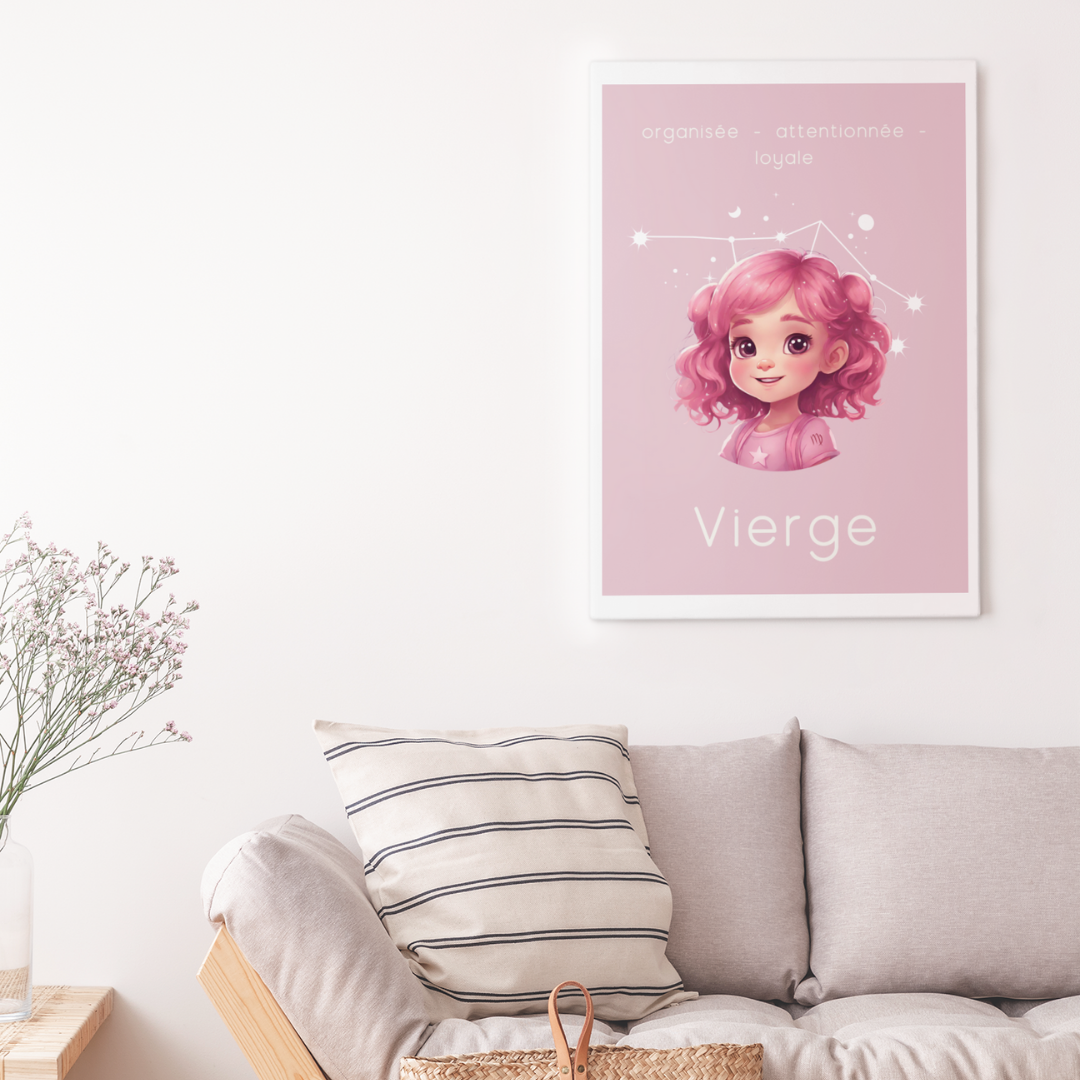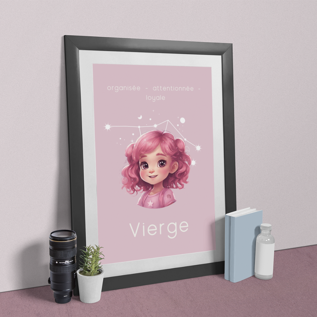 Ajoutez une touche de douceur et d’organisation à votre intérieur avec ce poster conçu pour les petites filles ou les femmes ayant gardé leur âme d’enfant, nées sous le signe de la Vierge. Sur un fond rose délicat, cette illustration enfantine du signe Vierge, accompagnée de sa constellation, célèbre l’attention, l’organisation et la loyauté propres à ce signe de terre.
