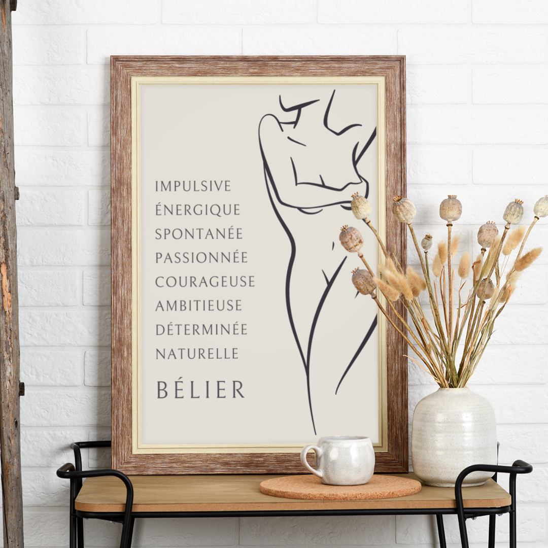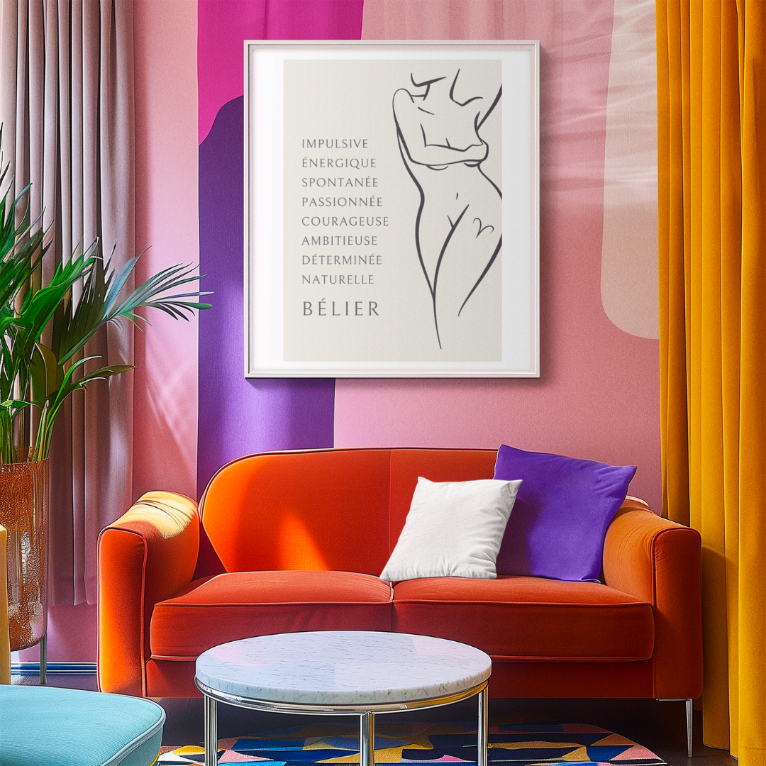 Apportez une touche de puissance et de féminité à votre intérieur avec ce poster unique de la collection Zodiac Women. Ce design exclusif met en scène une femme élégamment représentée, son corps nu orné d’un tatouage symbolisant le signe du Bélier sur la cuisse. À côté de l'illustration, les qualités emblématiques du Bélier viennent compléter cette œuvre pour vous rappeler vos propres forces et vous inspirer à vous aimer chaque jour.
