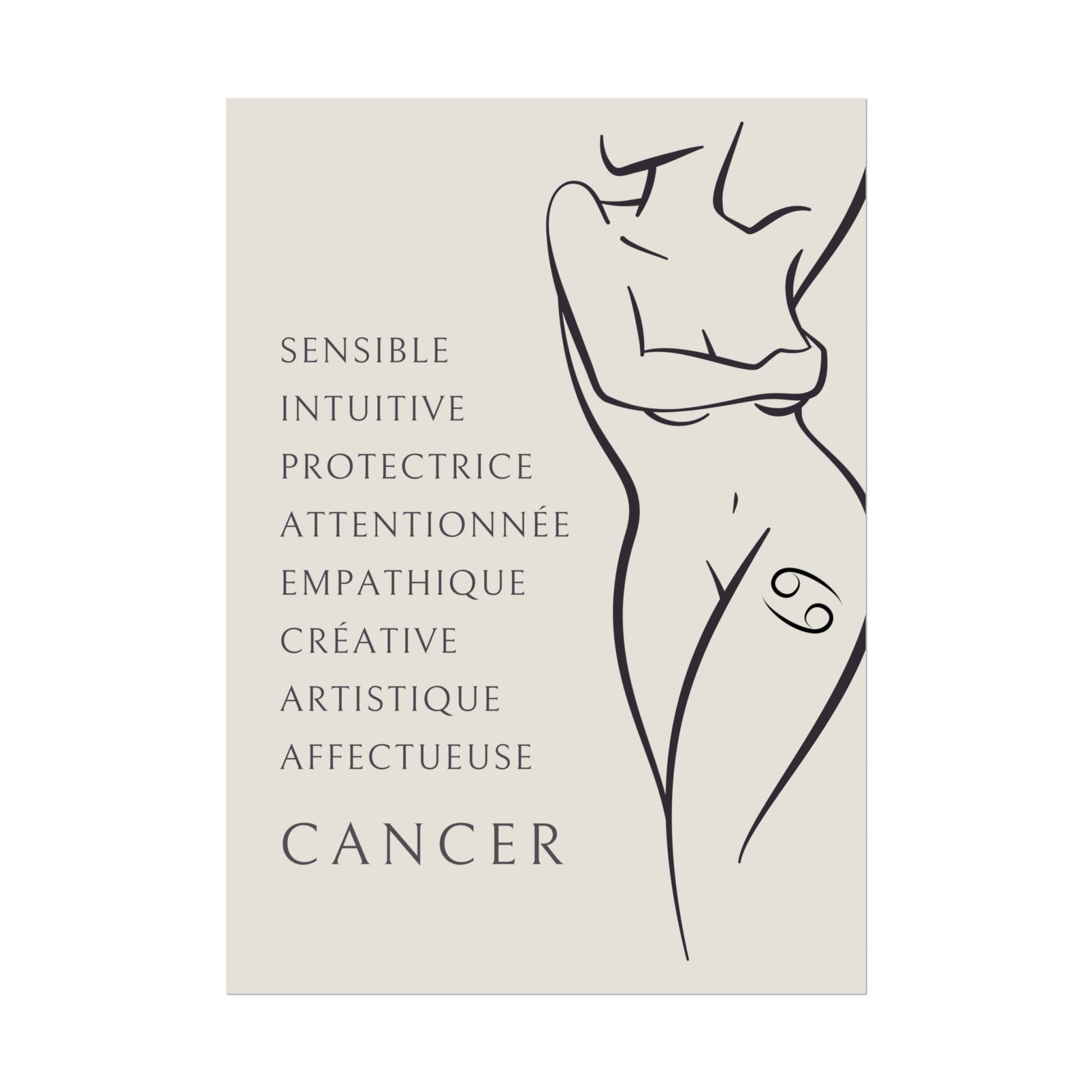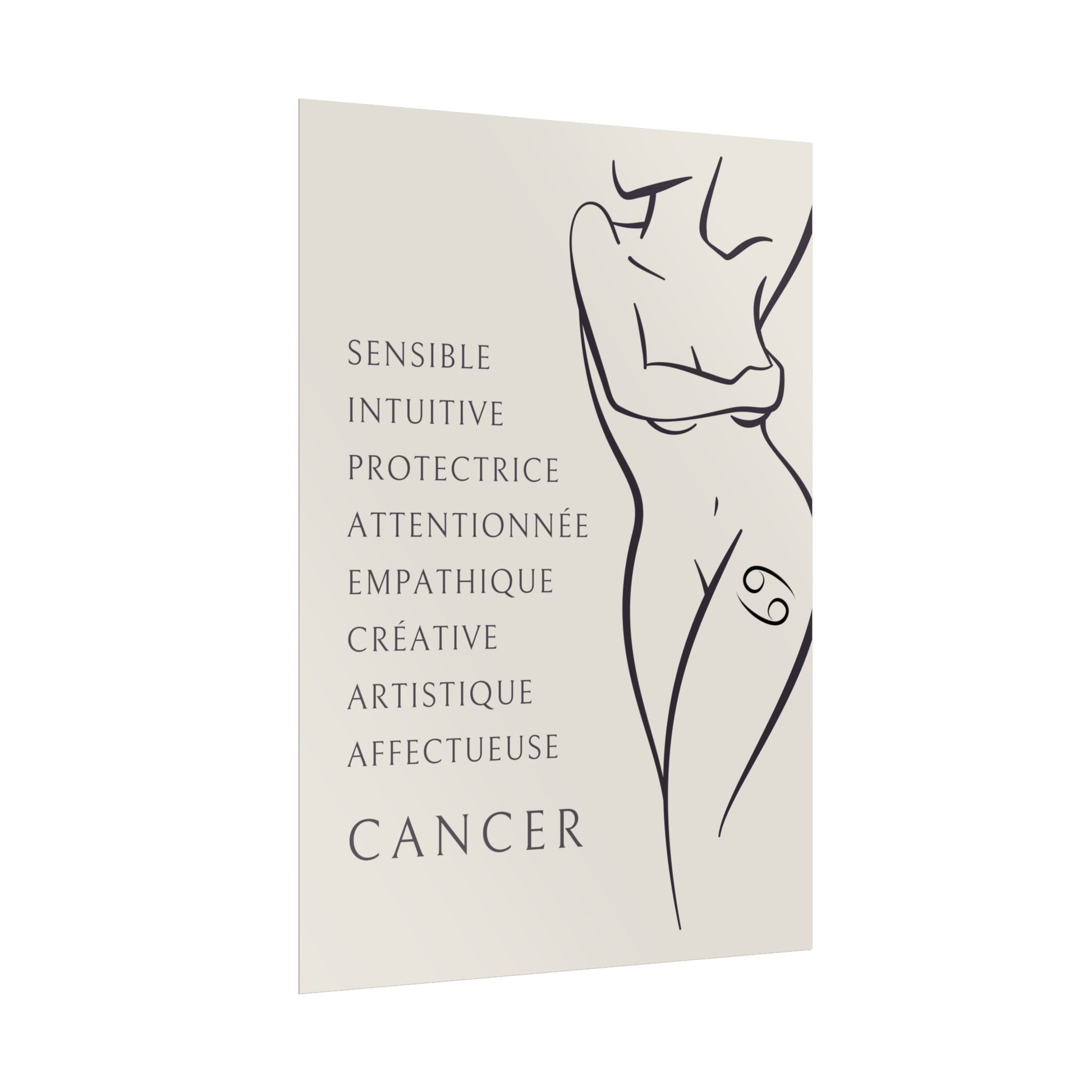 Ajoutez une touche d’élégance et de douceur à votre intérieur avec ce poster exclusif de la collection Zodiac Women. L’illustration met en scène une femme nue, portant un tatouage du signe du Cancer sur la cuisse. Cette œuvre sublime, accompagnée des qualités du Cancer, vous rappellera de vous aimer pleinement et de célébrer votre sensibilité, votre créativité et votre loyauté. Un hommage à la féminité et à la profondeur émotionnelle de ce signe d'eau.