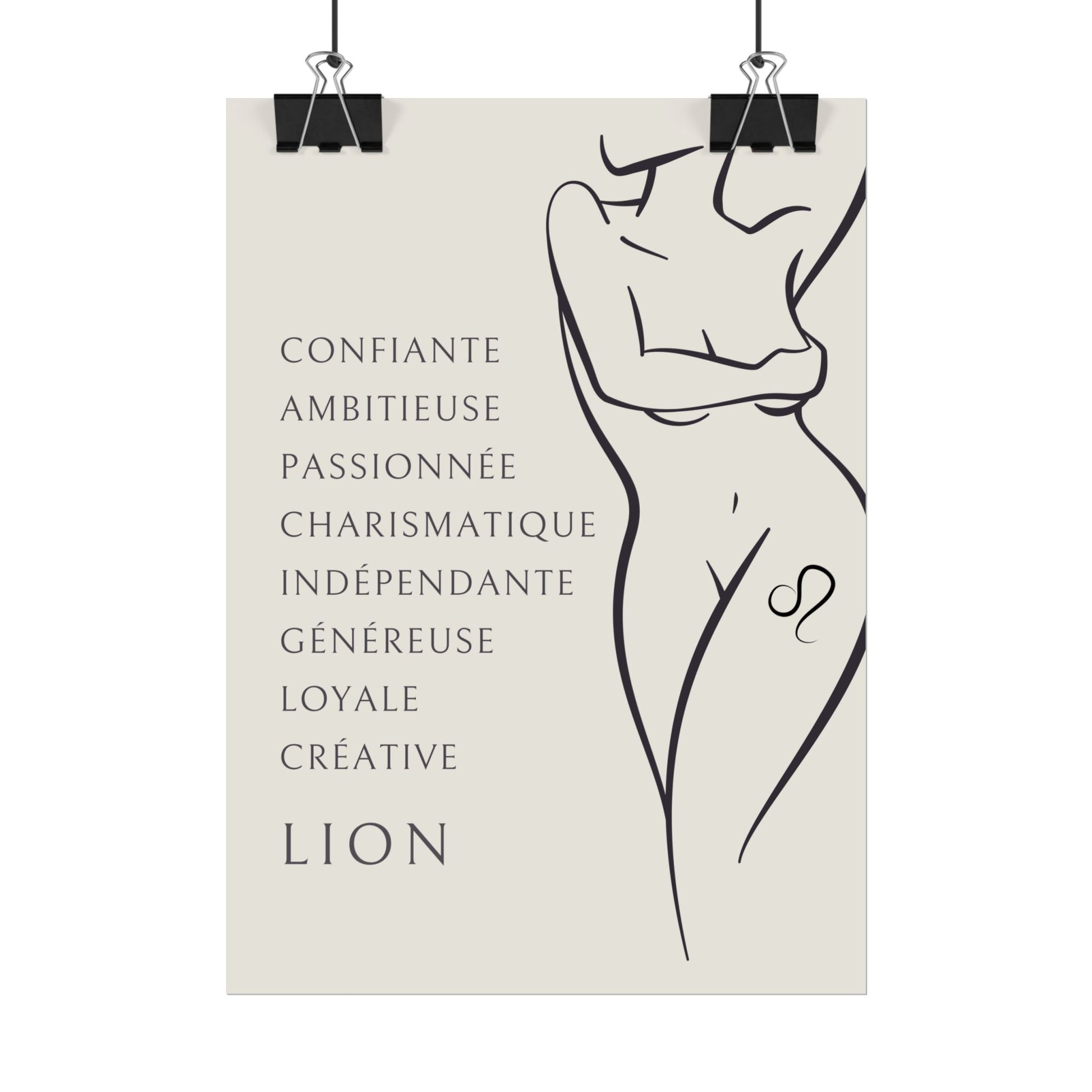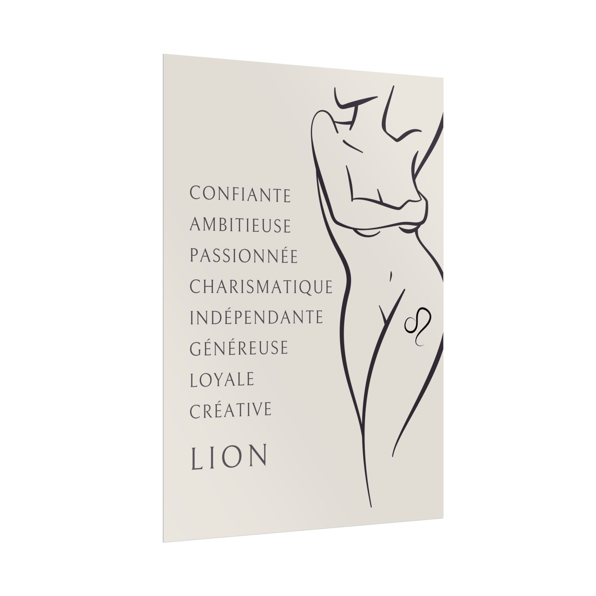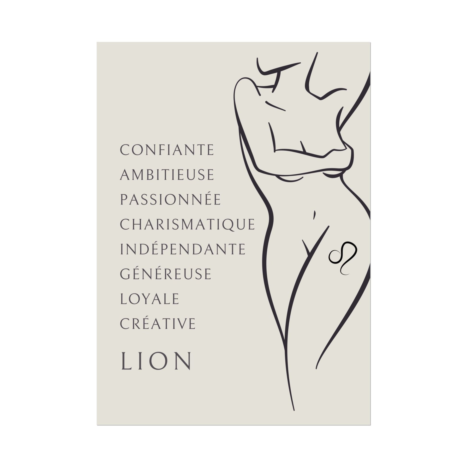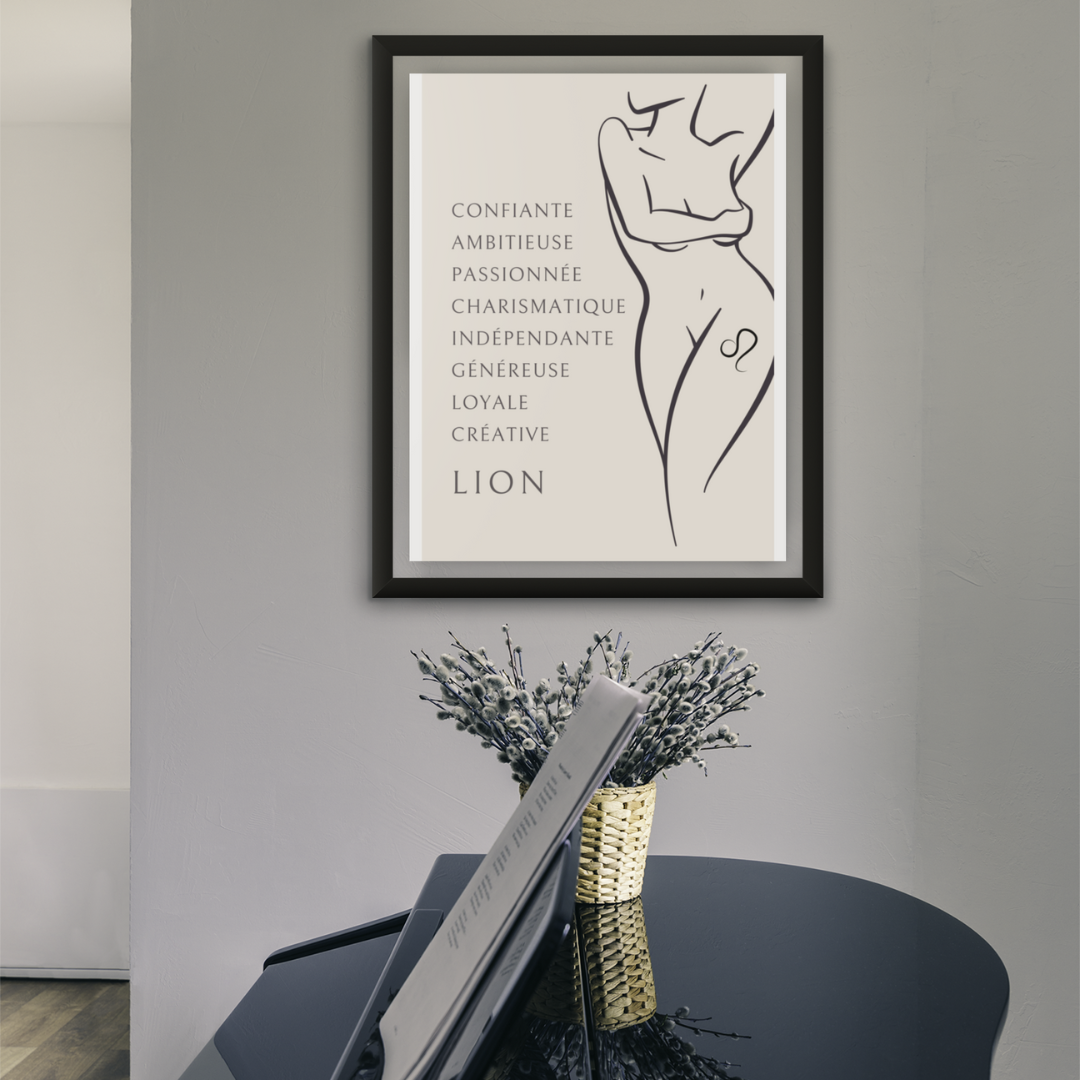 Ajoutez une touche de grandeur et de confiance à votre intérieur avec ce poster exclusif de la collection Zodiac Women. L’illustration met en scène une femme nue, arborant fièrement un tatouage du signe du Lion sur la cuisse. Cette œuvre saisissante, accompagnée des qualités du Lion, vous rappellera de vous aimer et de célébrer votre charisme, votre générosité et votre confiance en vous. Un hommage vibrant à la puissance et à la lumière de ce signe de feu.