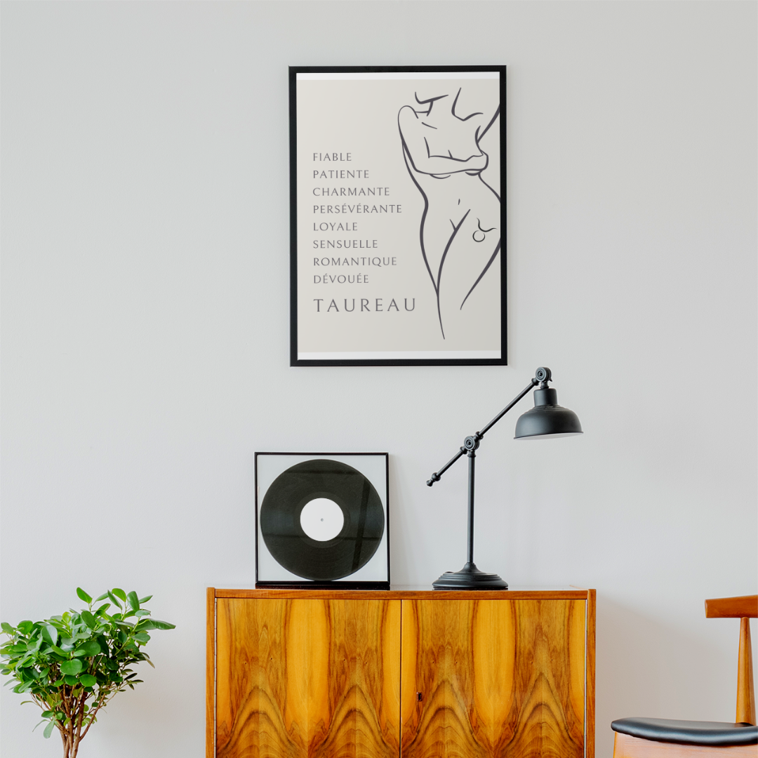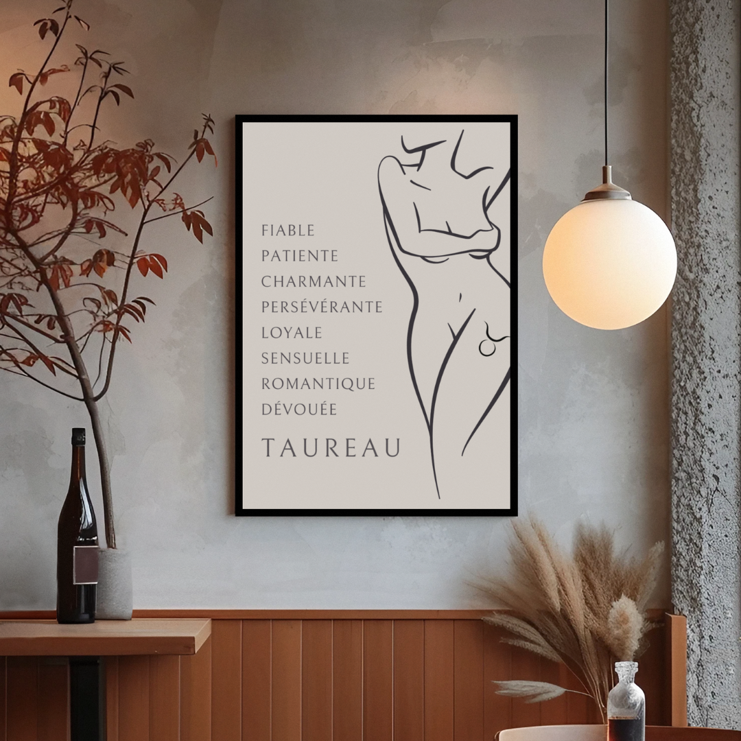 Apportez une touche de force tranquille et de féminité à votre intérieur avec ce poster unique de la collection Zodiac Women. Ce design exclusif met en scène une femme magnifiquement représentée, son corps nu orné d’un tatouage symbolisant le signe du Taureau sur la cuisse. À côté de l'illustration, les qualités emblématiques du Taureau viennent compléter cette œuvre pour vous rappeler vos propres forces et vous inspirer à vous aimer chaque jour.
