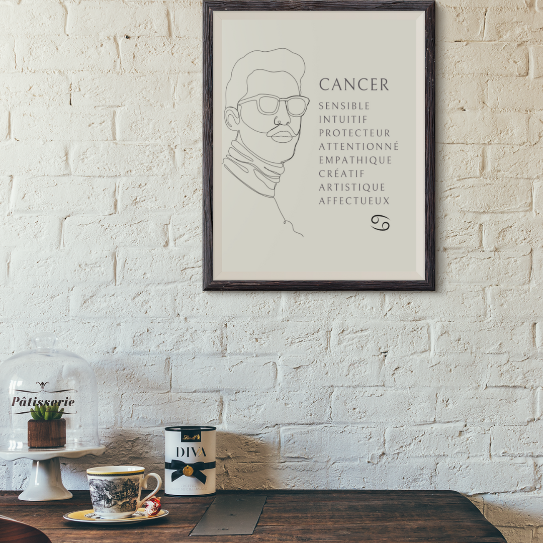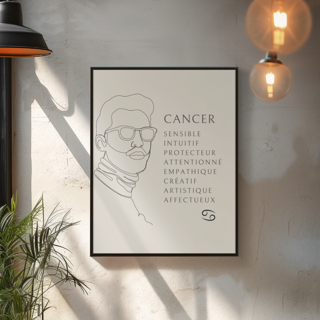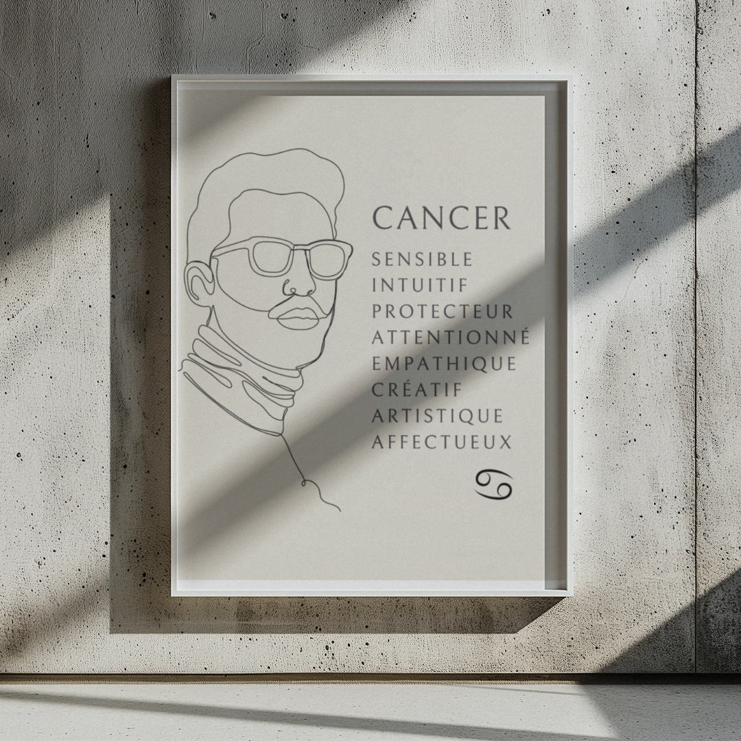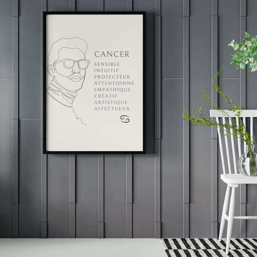 Apportez une touche d’intuition et de sensibilité à votre intérieur avec ce poster unique de la collection Zodiac Men. L’illustration met en lumière un homme élégant, incarnant l’essence protectrice et émotionnelle du signe du Cancer. Ce design est une ode à la douceur et à la force intérieure qui définissent ce signe d’eau.