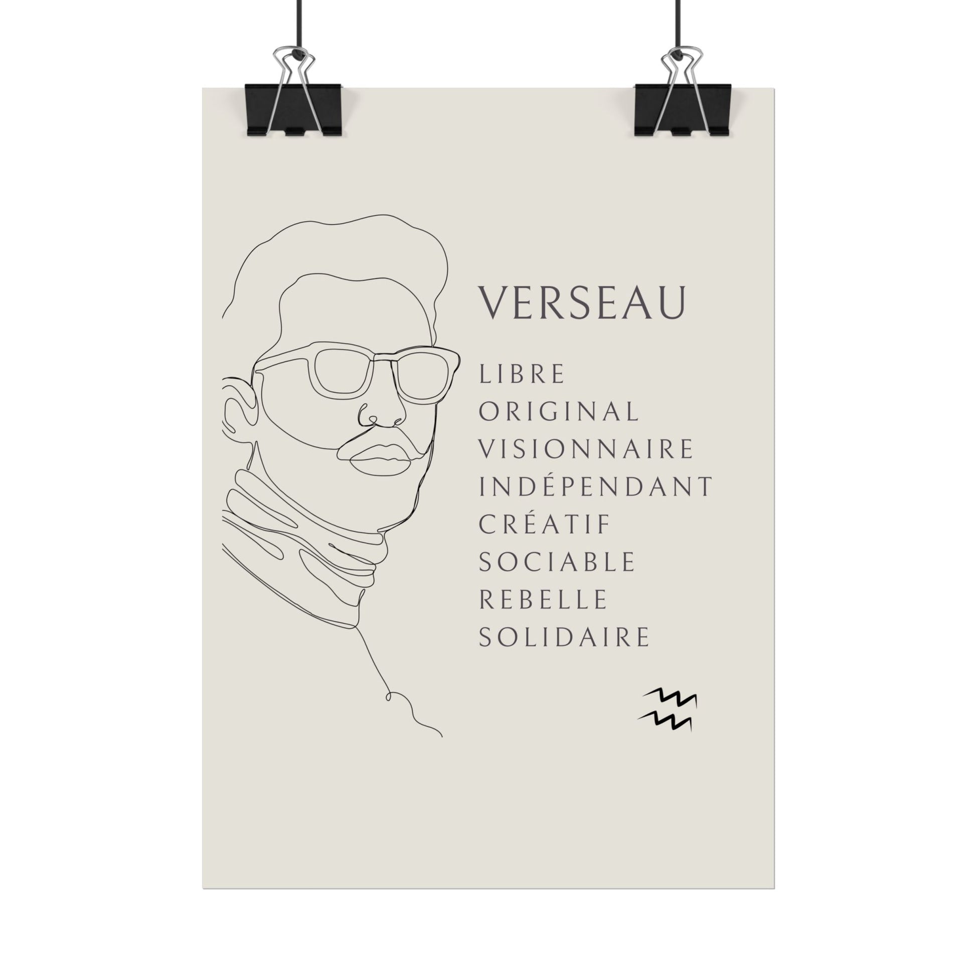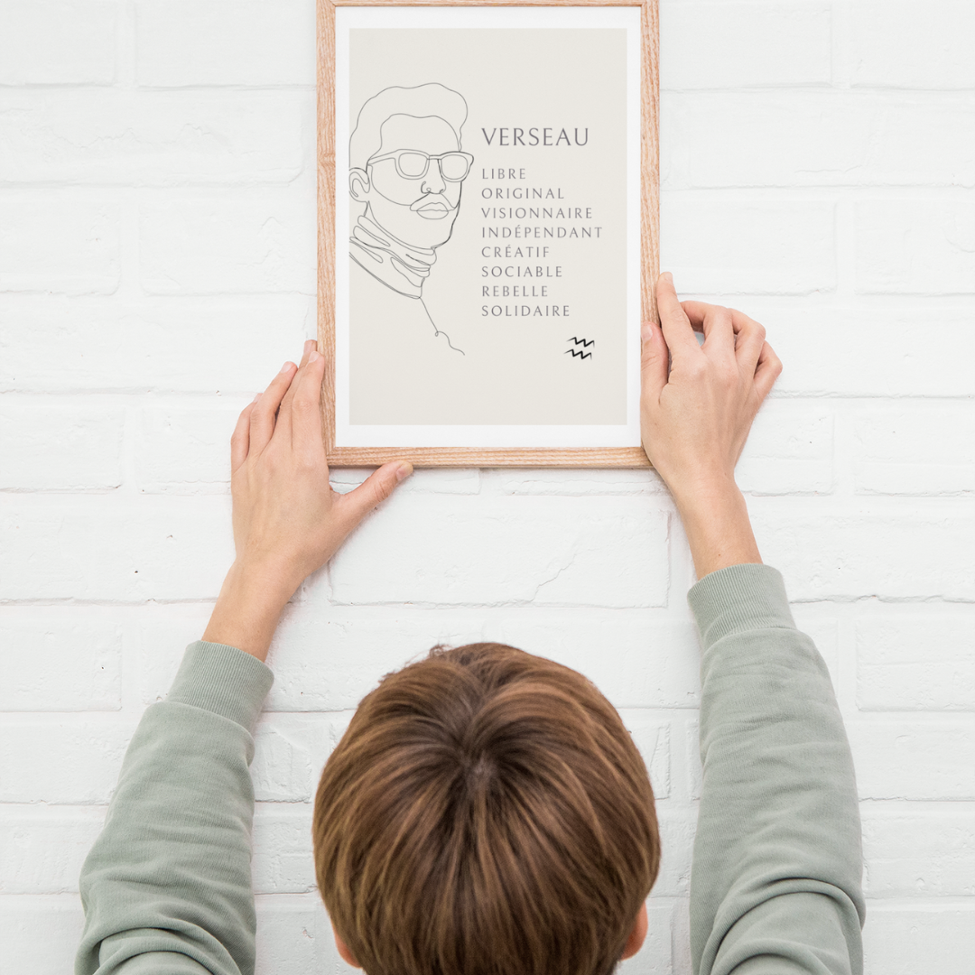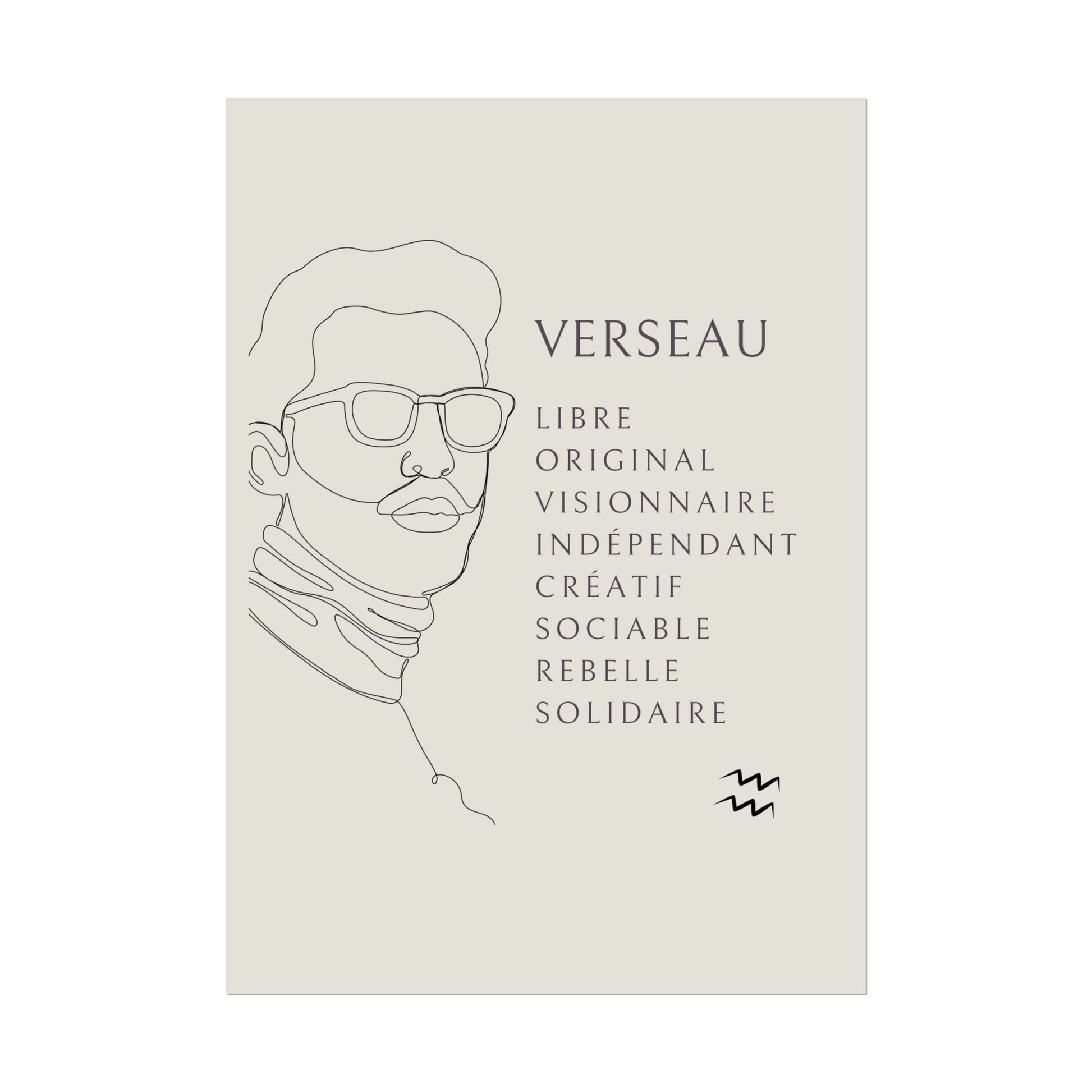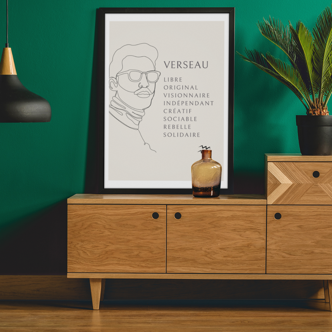 Apportez une touche d'originalité et de liberté à votre intérieur avec ce poster de la collection Zodiac Men. L’illustration représente un homme incarnant l’esprit du Verseau, un signe visionnaire, indépendant et altruiste, parfait pour ajouter une énergie positive et innovante à votre espace.