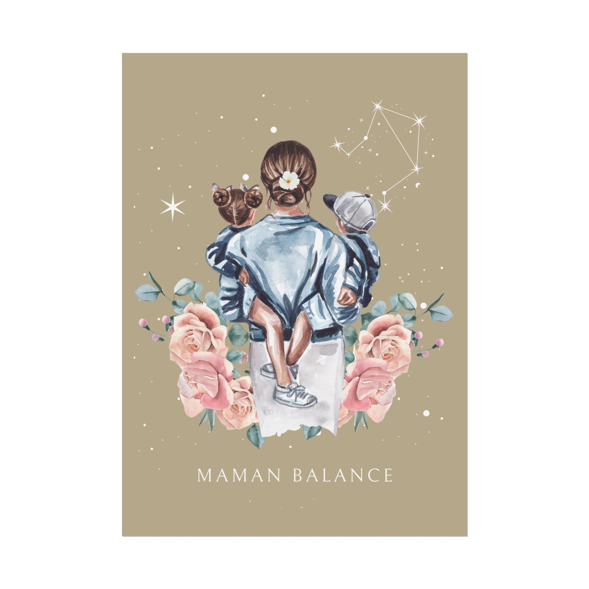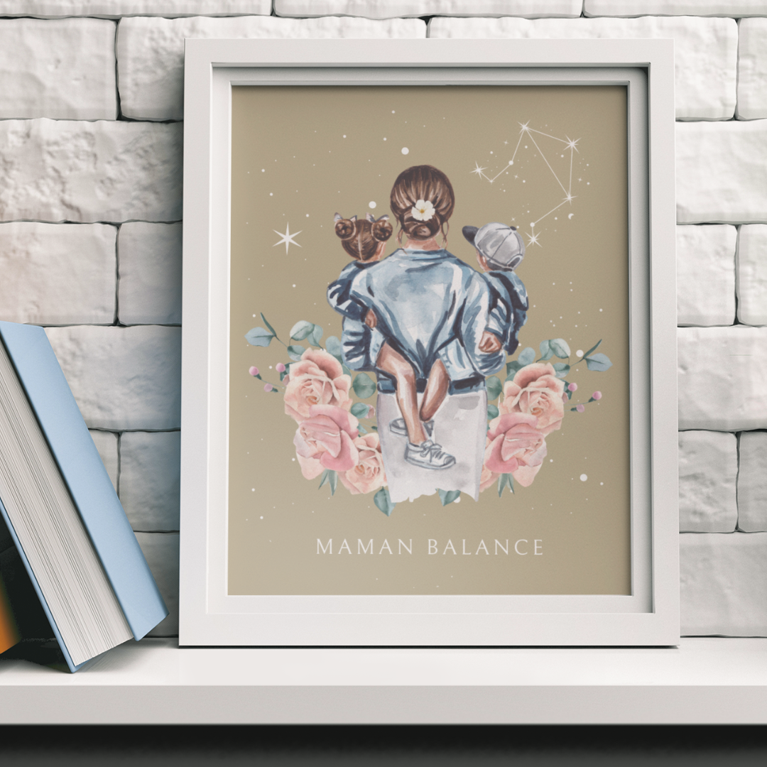 Apportez une touche d’harmonie et d’élégance à votre intérieur avec ce poster de la collection Cosmic Mum. L’illustration met en scène une mère tenant ses enfants avec tendresse, sur un fond étoilé mettant en valeur la constellation de la Balance. Ce design célèbre le lien délicat et équilibré entre une mère et son enfant.