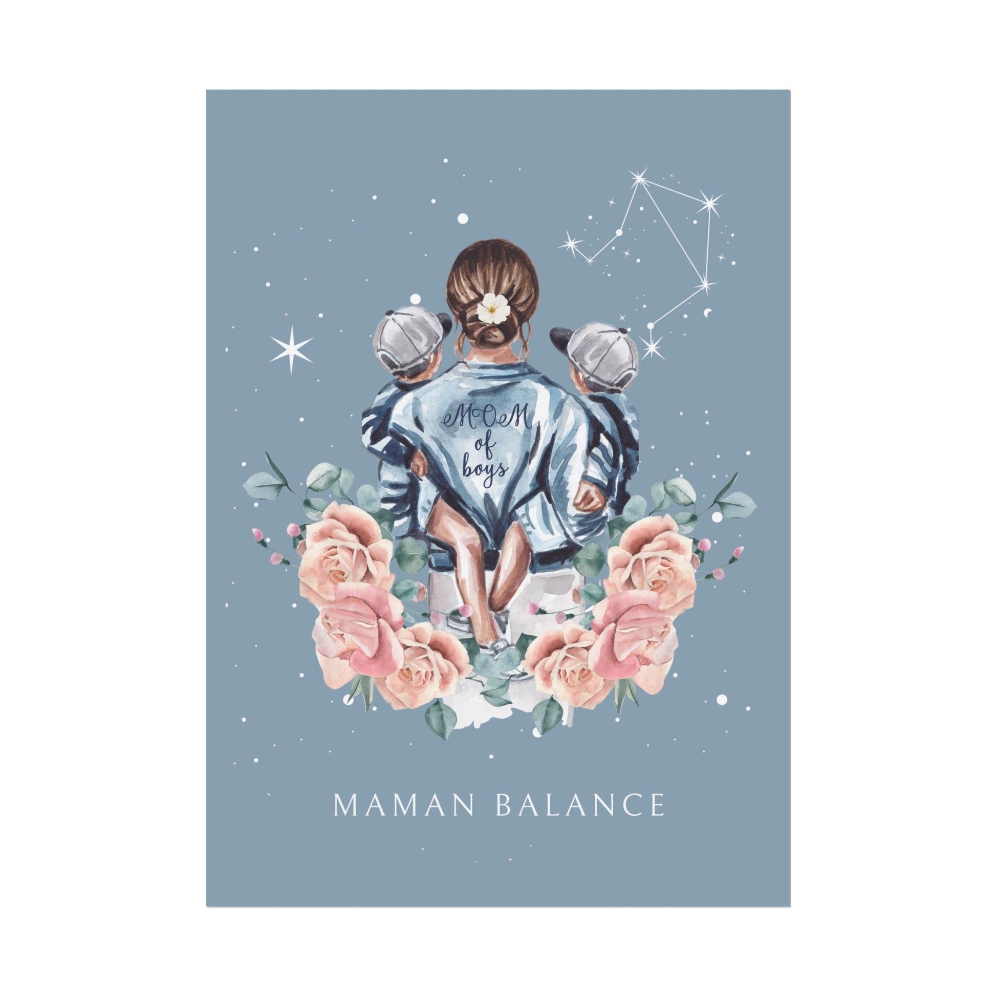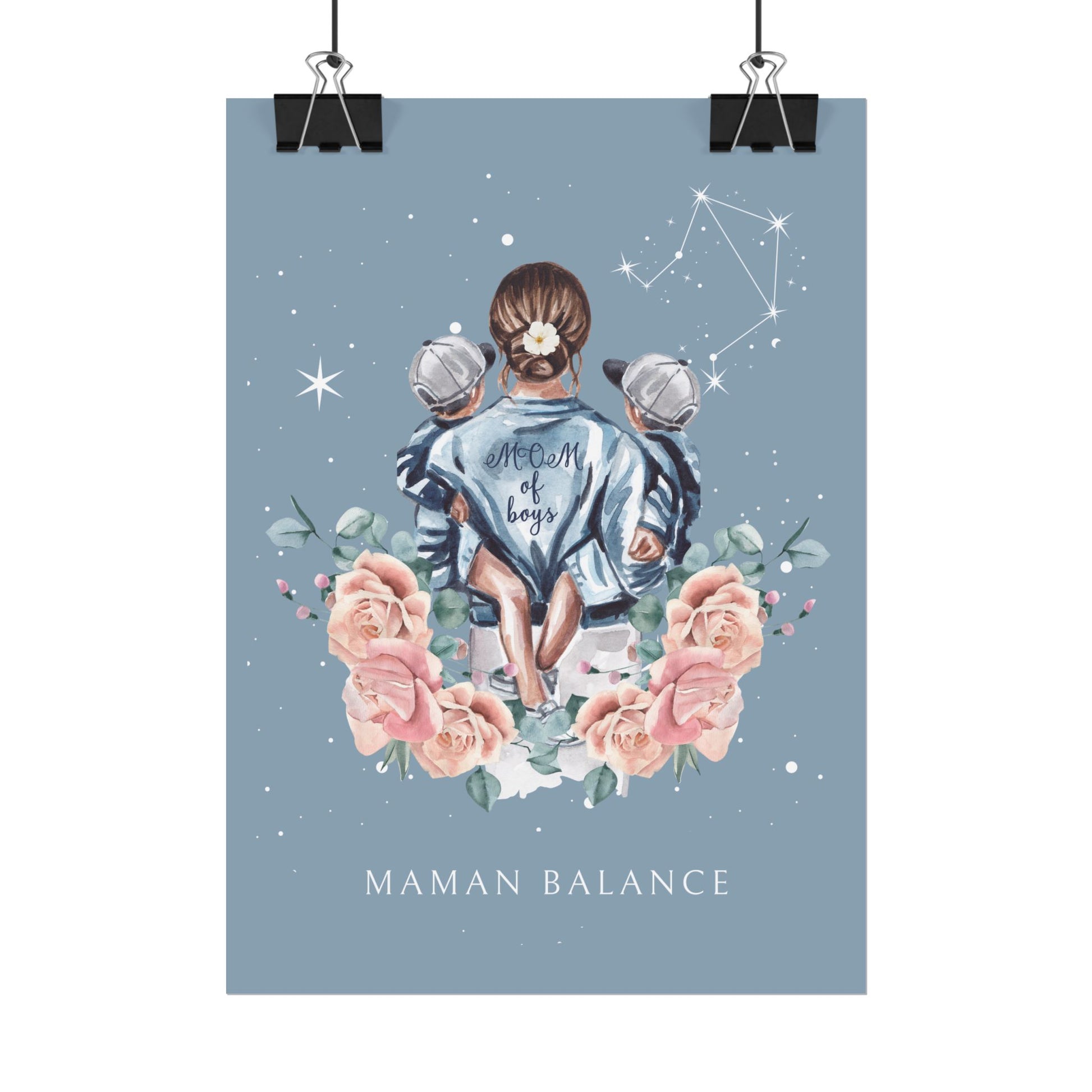 Apportez une touche d’harmonie et d’élégance à votre intérieur avec ce poster de la collection Cosmic Mum. L’illustration met en scène une mère tenant ses fils avec tendresse, sur un fond étoilé mettant en valeur la constellation de la Balance. Ce design célèbre le lien délicat et équilibré entre une mère et son enfant.