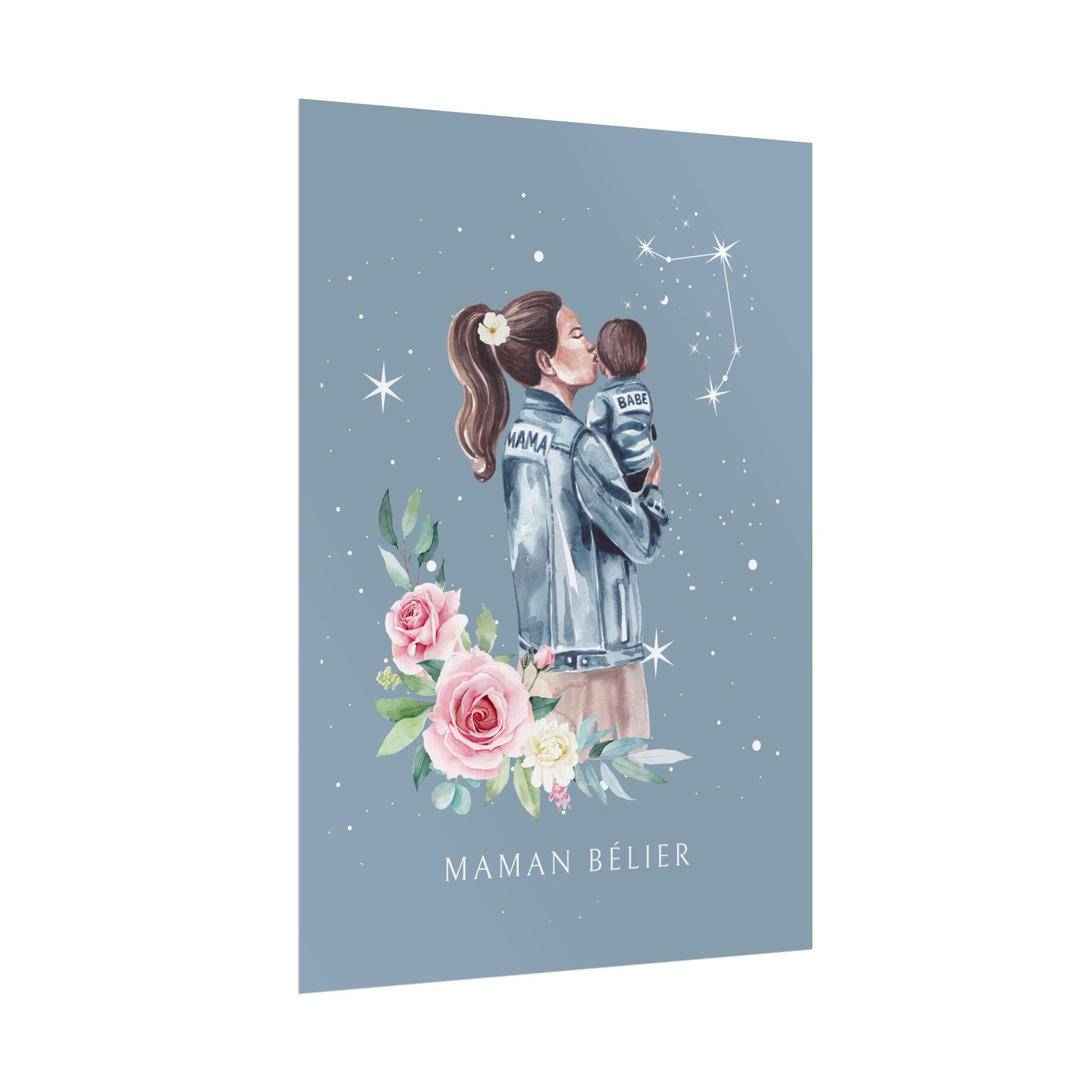 Ajoutez une touche d’amour et de sérénité à votre intérieur avec ce poster de la collection Cosmic Mum. L’illustration représente une mère portant tendrement son fils dans les bras, sous un fond étoilé mettant en avant la constellation du Bélier. Une ode à la maternité et à la connexion universelle entre une mère et son enfant.