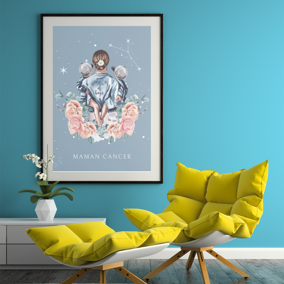 Ajoutez une touche d’émotion et de poésie à votre décoration avec ce poster de la collection Cosmic Mum. L’illustration met en scène une mère portant tendrement ses fils, enveloppés sous un ciel étoilé où brille la constellation du Cancer. Cette œuvre célèbre la douceur et la profondeur du lien maternel.