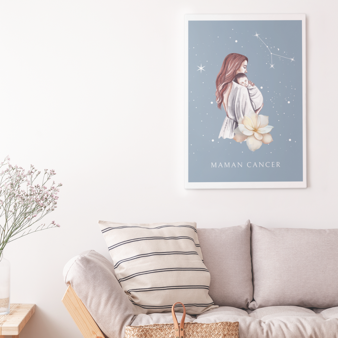 Ajoutez une touche d’émotion et de poésie à votre décoration avec ce poster de la collection Cosmic Mum. L’illustration met en scène une mère portant tendrement son bébé, enveloppés sous un ciel étoilé où brille la constellation du Cancer. Cette œuvre célèbre la douceur et la profondeur du lien maternel.