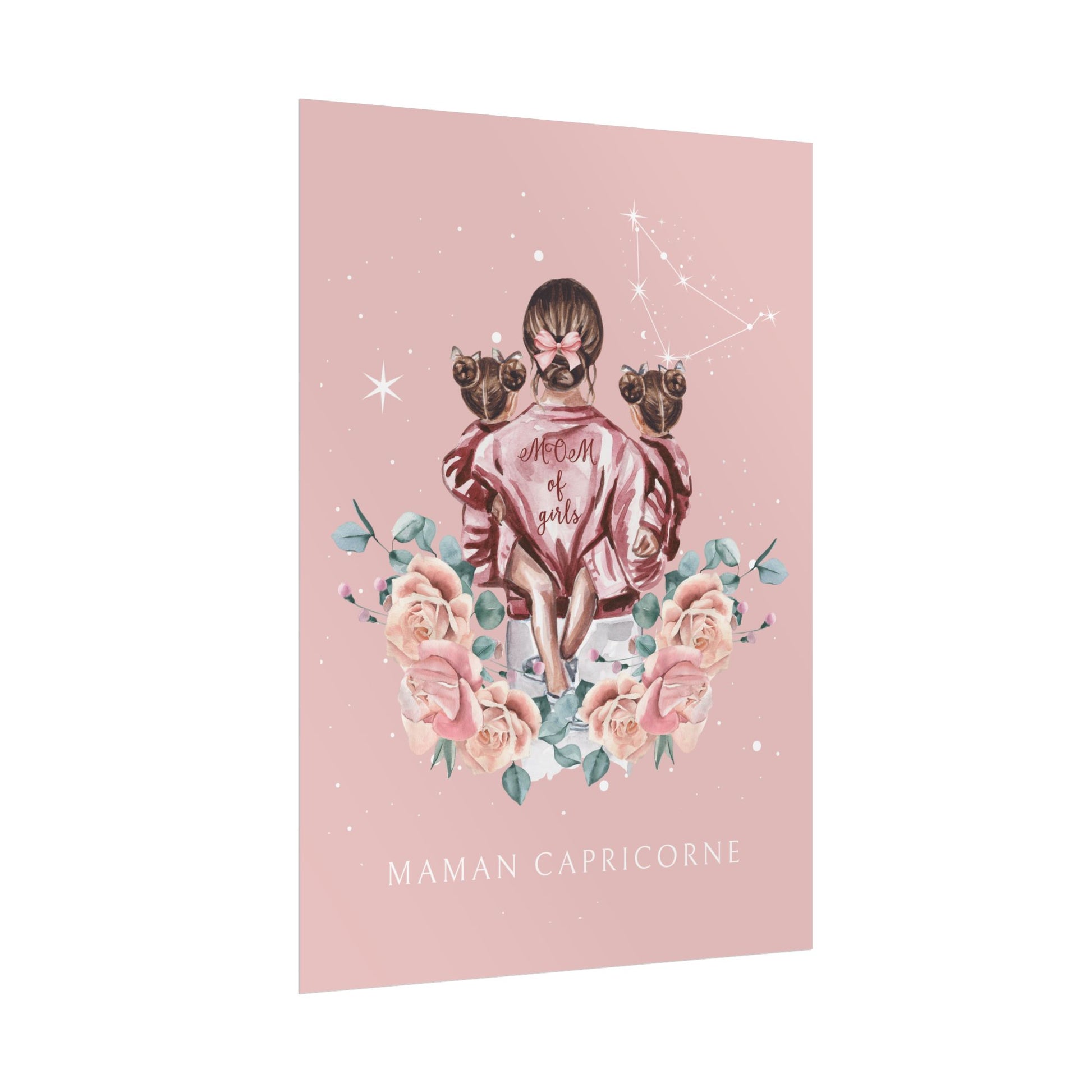 Apportez une élégance intemporelle et une énergie de réflexion à votre intérieur avec ce poster de la collection Cosmic Mum. L’illustration représente une mère portant tendrement ses filles, sur un fond étoilé mettant en valeur la constellation du Capricorne. Ce design capture la force et la sagesse d'une mère Capricorne.