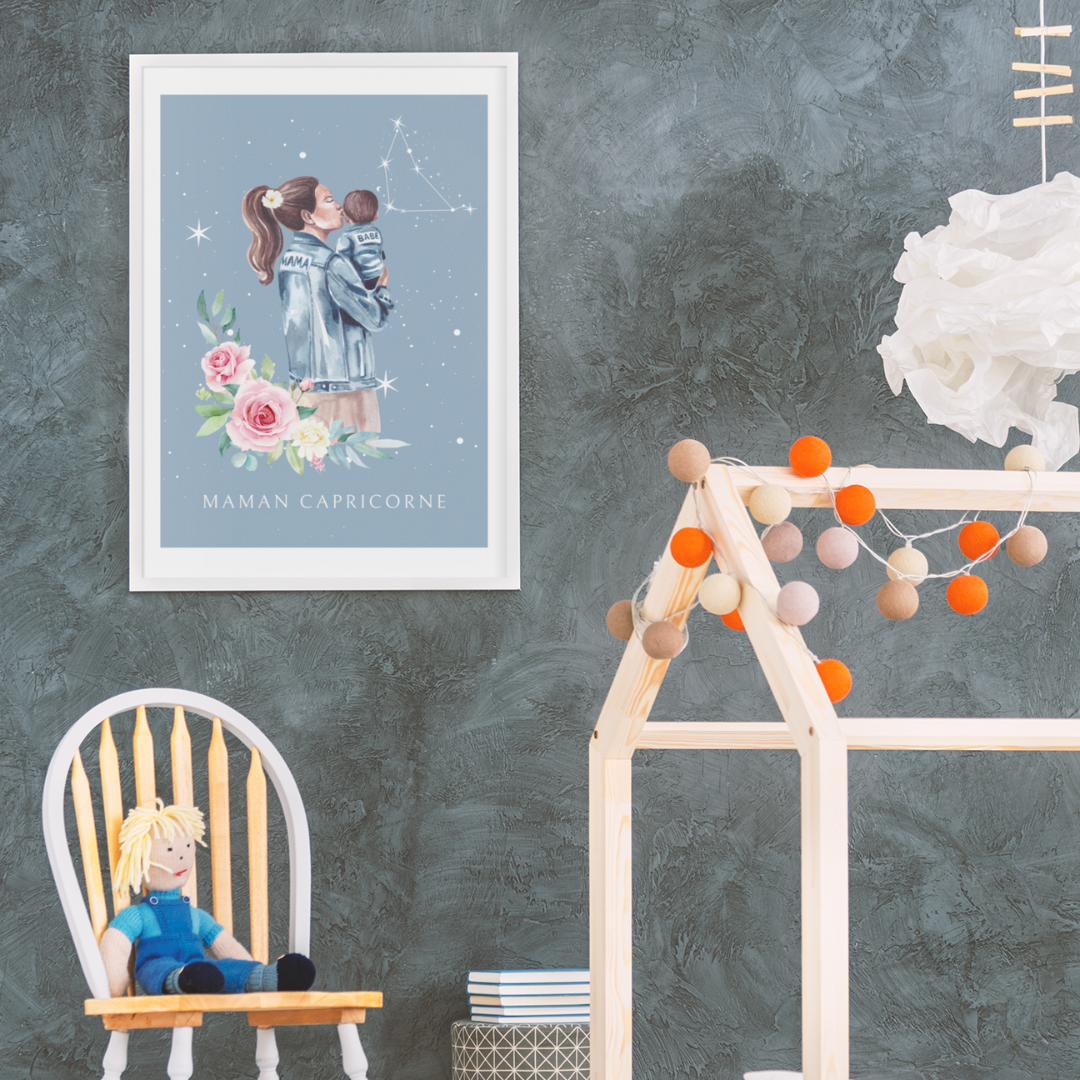 Apportez une élégance intemporelle et une énergie de réflexion à votre intérieur avec ce poster de la collection Cosmic Mum. L’illustration représente une mère portant tendrement son fils, sur un fond étoilé mettant en valeur la constellation du Capricorne. Ce design capture la force et la sagesse d'une mère Capricorne.