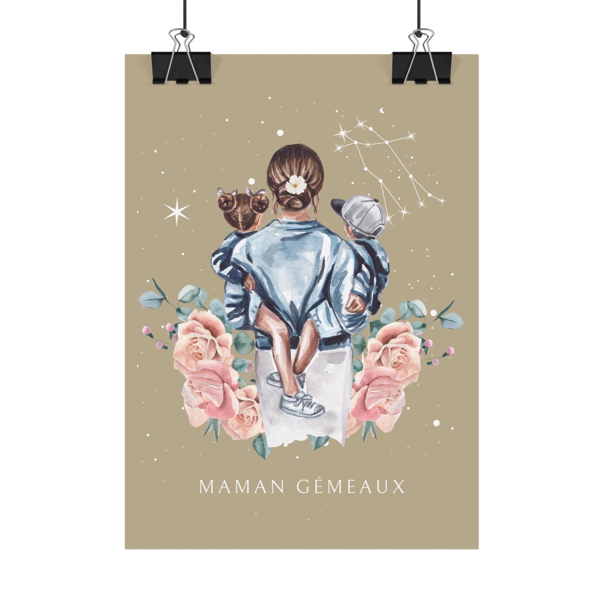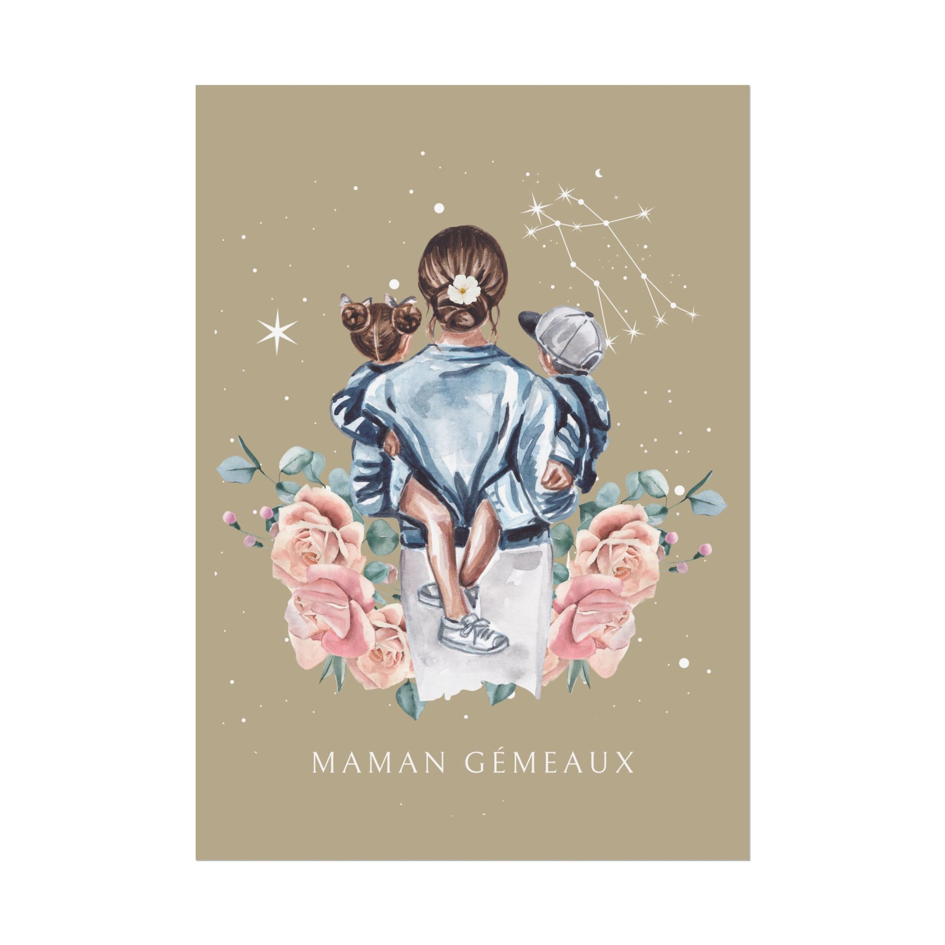 Ajoutez une touche d’élégance et de tendresse à votre décoration avec ce poster de la collection Cosmic Mum. L’illustration représente une mère tenant ses enfants dans les bras, bercés sous un ciel étoilé décoré de la constellation des Gémeaux. Cette œuvre capture l’essence de la maternité dans toute sa splendeur.