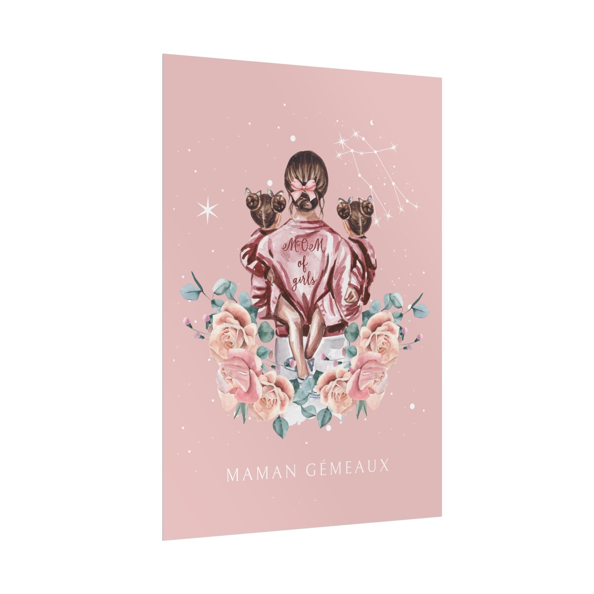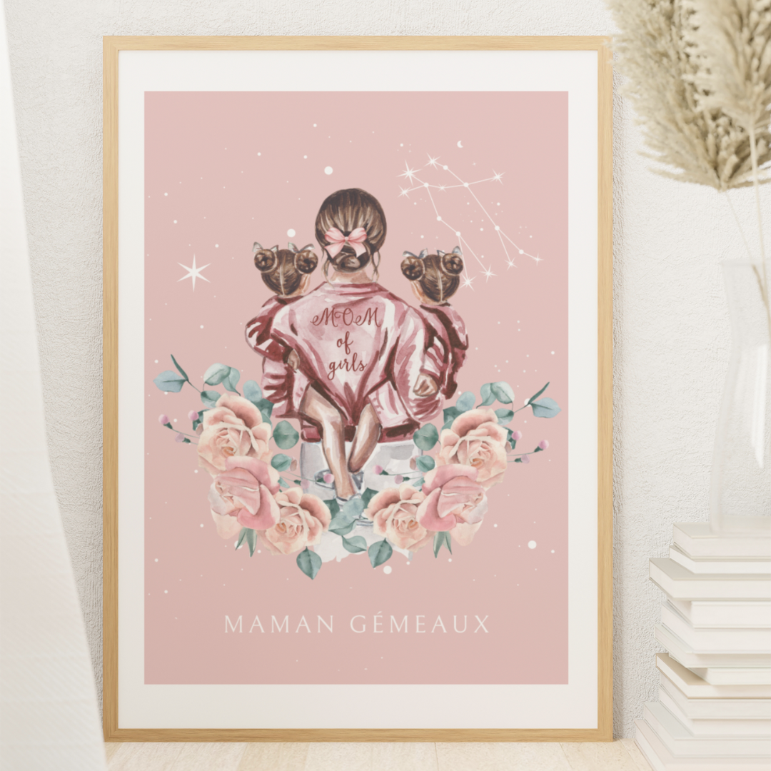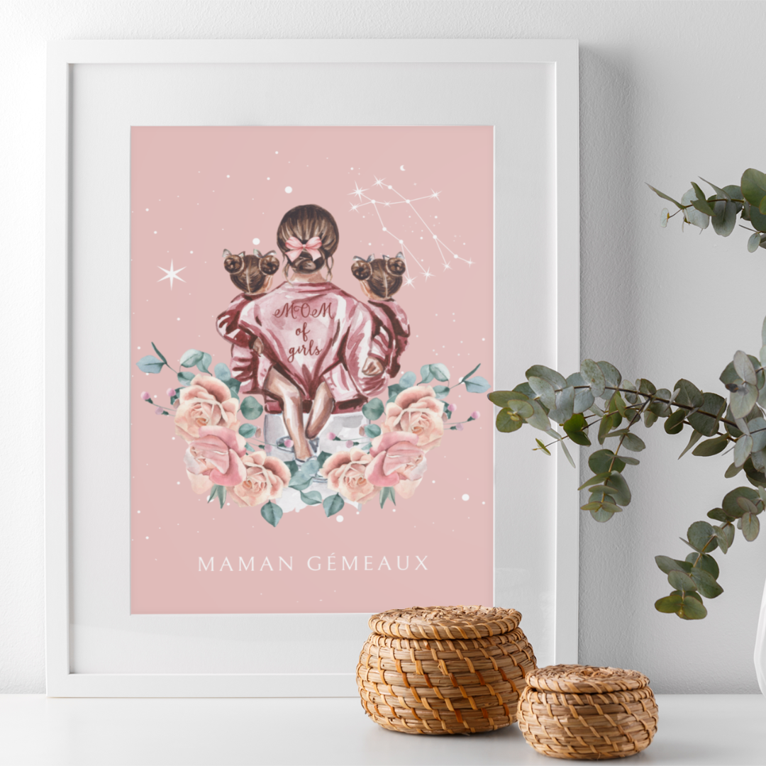 Ajoutez une touche d’élégance et de tendresse à votre décoration avec ce poster de la collection Cosmic Mum. L’illustration représente une mère tenant ses filles dans les bras, bercés sous un ciel étoilé décoré de la constellation des Gémeaux. Cette œuvre capture l’essence de la maternité dans toute sa splendeur.