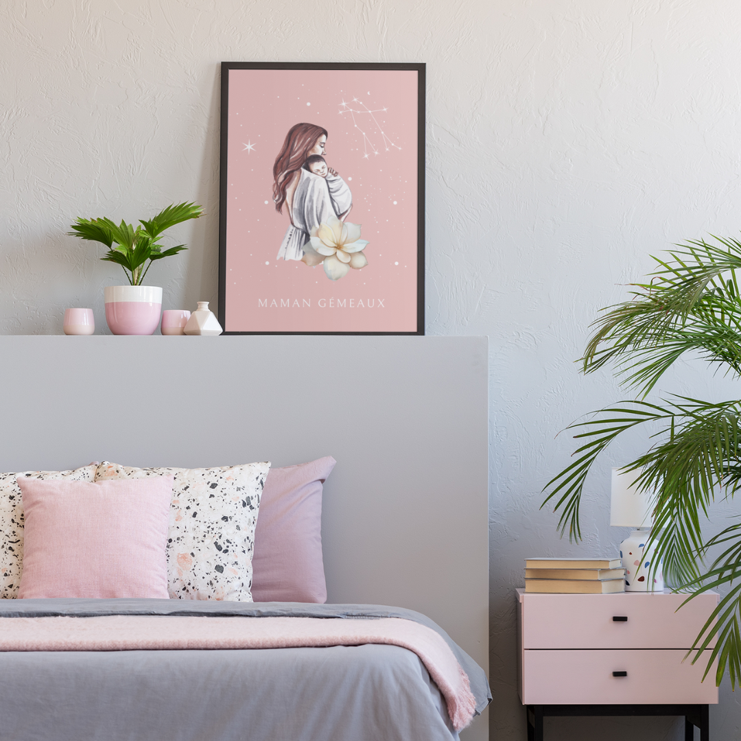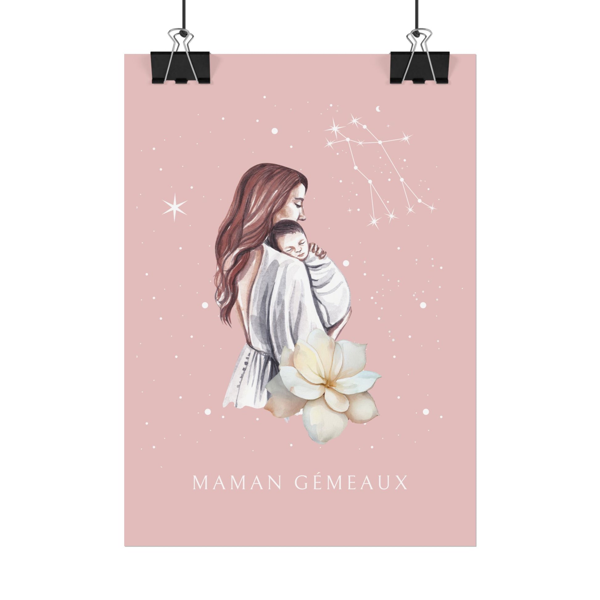 Ajoutez une touche d’élégance et de tendresse à votre décoration avec ce poster de la collection Cosmic Mum. L’illustration représente une mère tenant son bébé dans les bras, bercés sous un ciel étoilé décoré de la constellation des Gémeaux. Cette œuvre capture l’essence de la maternité dans toute sa splendeur.