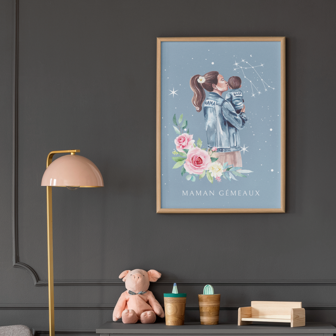 Ajoutez une touche d’élégance et de tendresse à votre décoration avec ce poster de la collection Cosmic Mum. L’illustration représente une mère tenant son fils dans les bras, bercés sous un ciel étoilé décoré de la constellation des Gémeaux. Cette œuvre capture l’essence de la maternité dans toute sa splendeur.