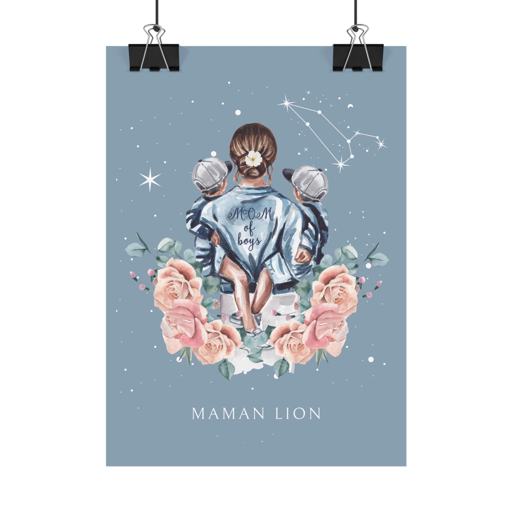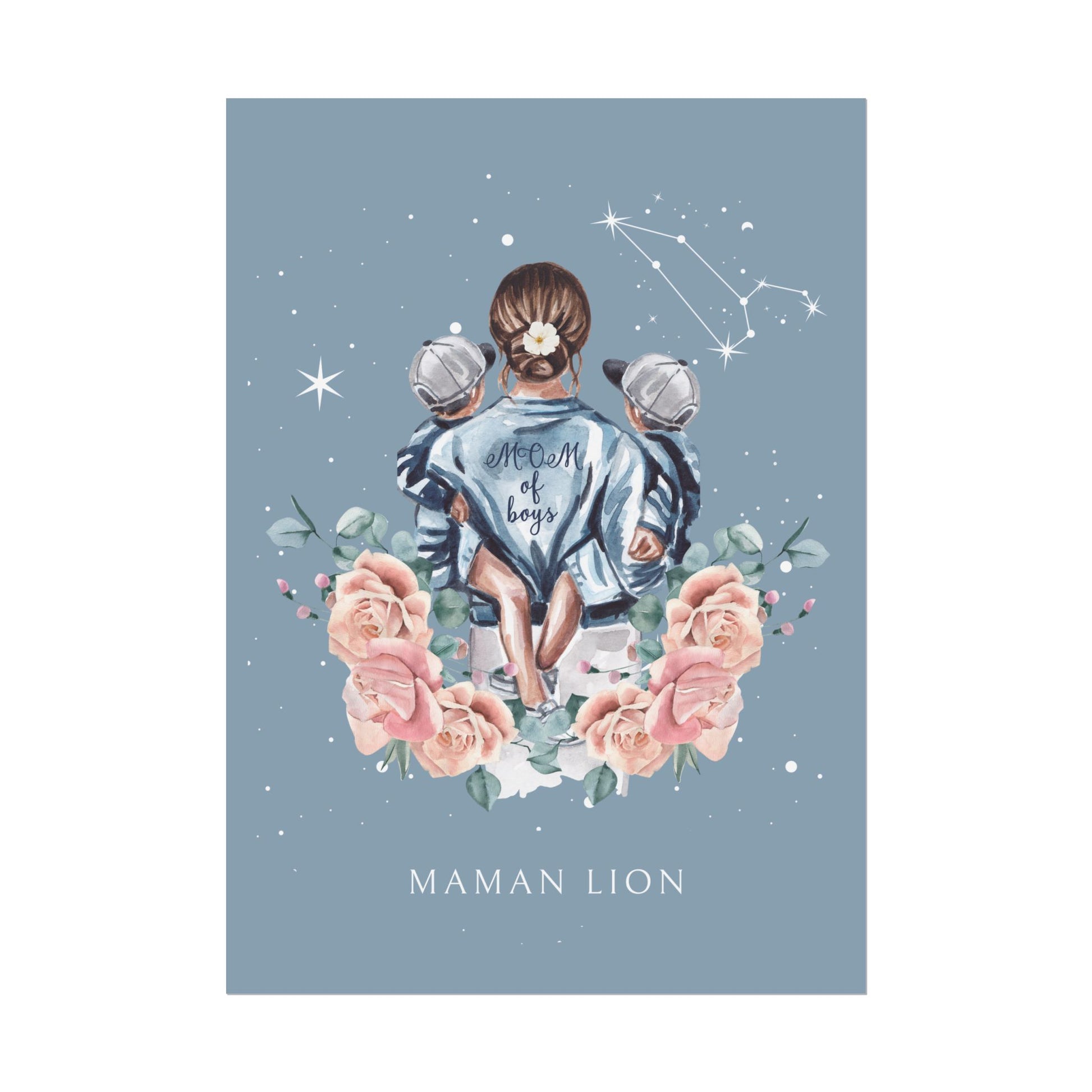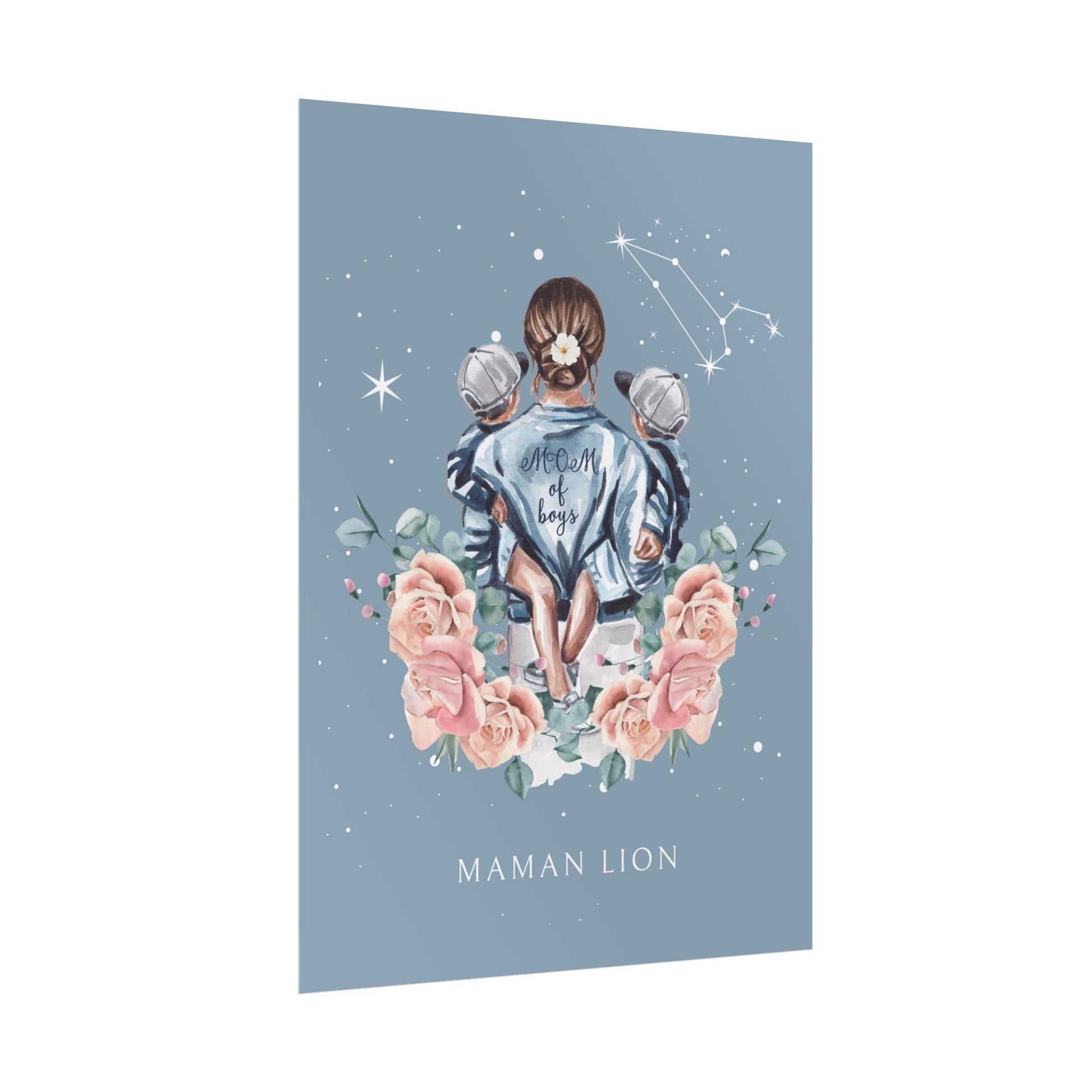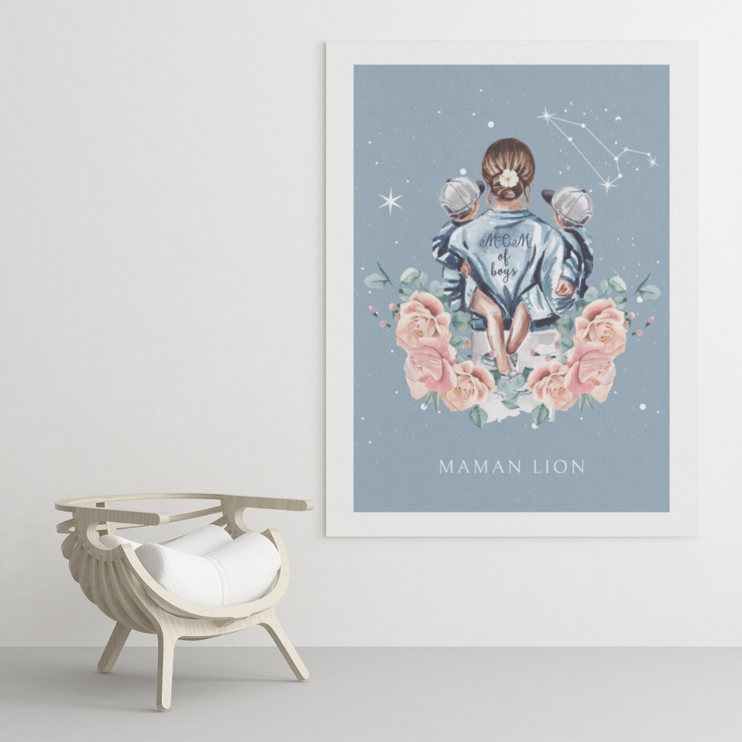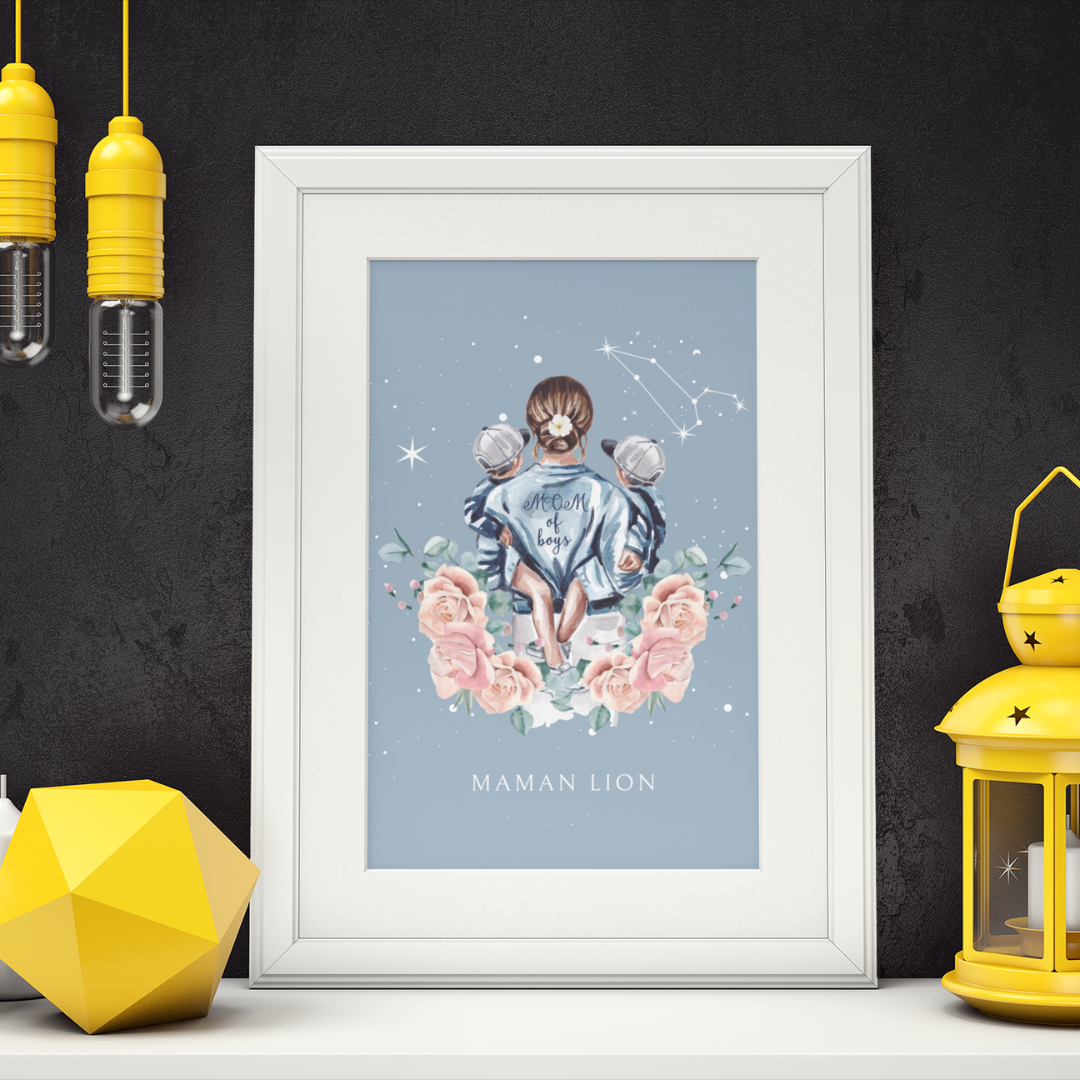 Ajoutez une touche de force et de chaleur à votre décoration avec ce poster de la collection Cosmic Mum. L’illustration met en scène une mère portant ses fils avec tendresse, sous un ciel étoilé illuminé par la constellation du Lion. Ce design rend hommage à la puissance et à la noblesse du lien maternel.