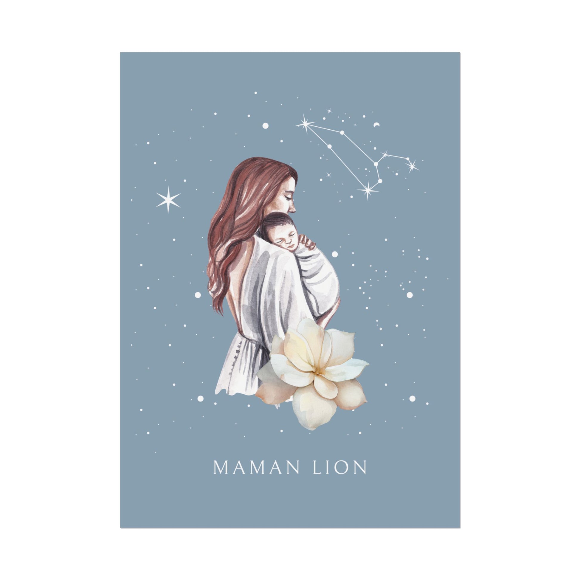 Ajoutez une touche de force et de chaleur à votre décoration avec ce poster de la collection Cosmic Mum. L’illustration met en scène une mère portant son bébé avec tendresse, sous un ciel étoilé illuminé par la constellation du Lion. Ce design rend hommage à la puissance et à la noblesse du lien maternel.