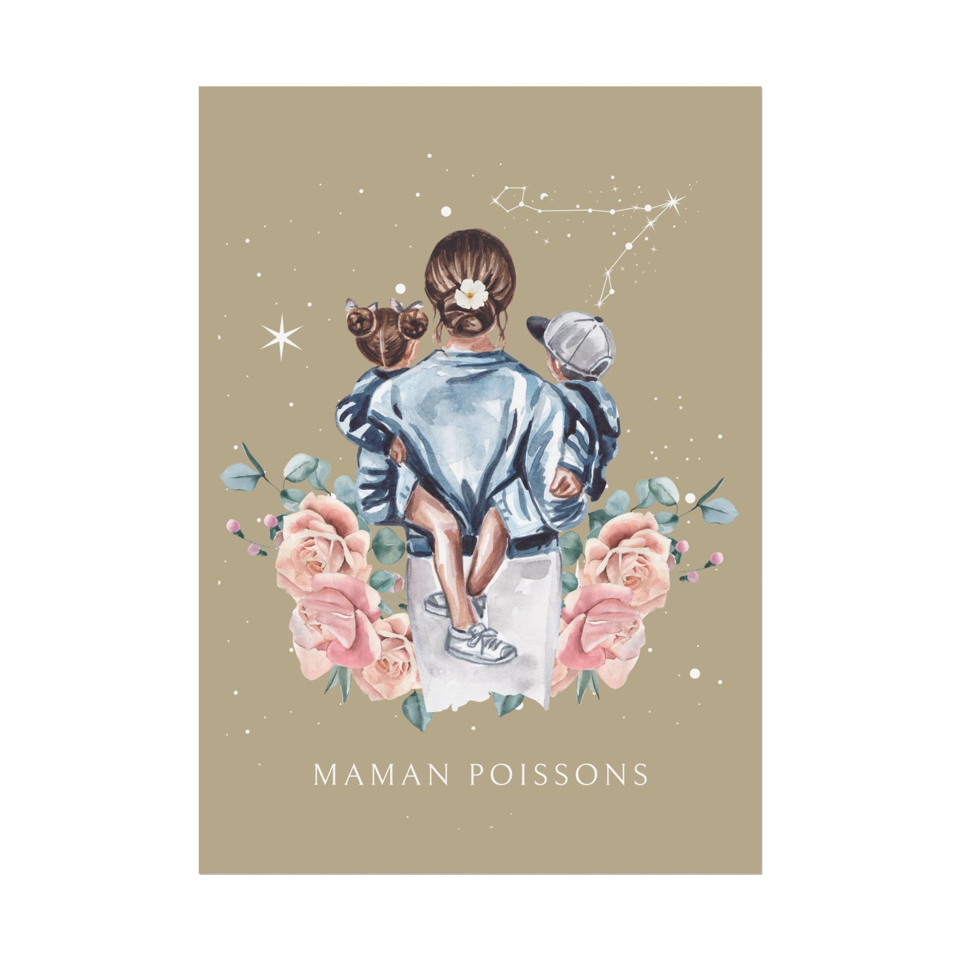 • Design exclusif : Une illustration empreinte de poésie et de tendresse, représentant une mère Poissons et son enfant sous l’éclat mystique de la constellation des Poissons.