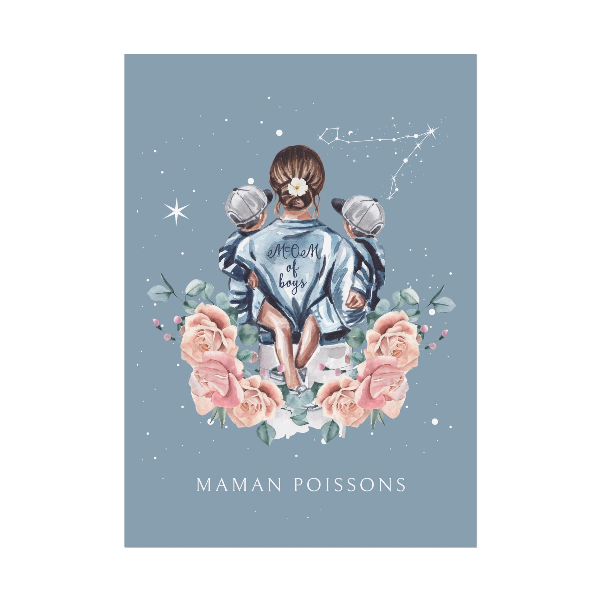 • Design exclusif : Une illustration empreinte de poésie et de tendresse, représentant une mère Poissons et son enfant sous l’éclat mystique de la constellation des Poissons.
