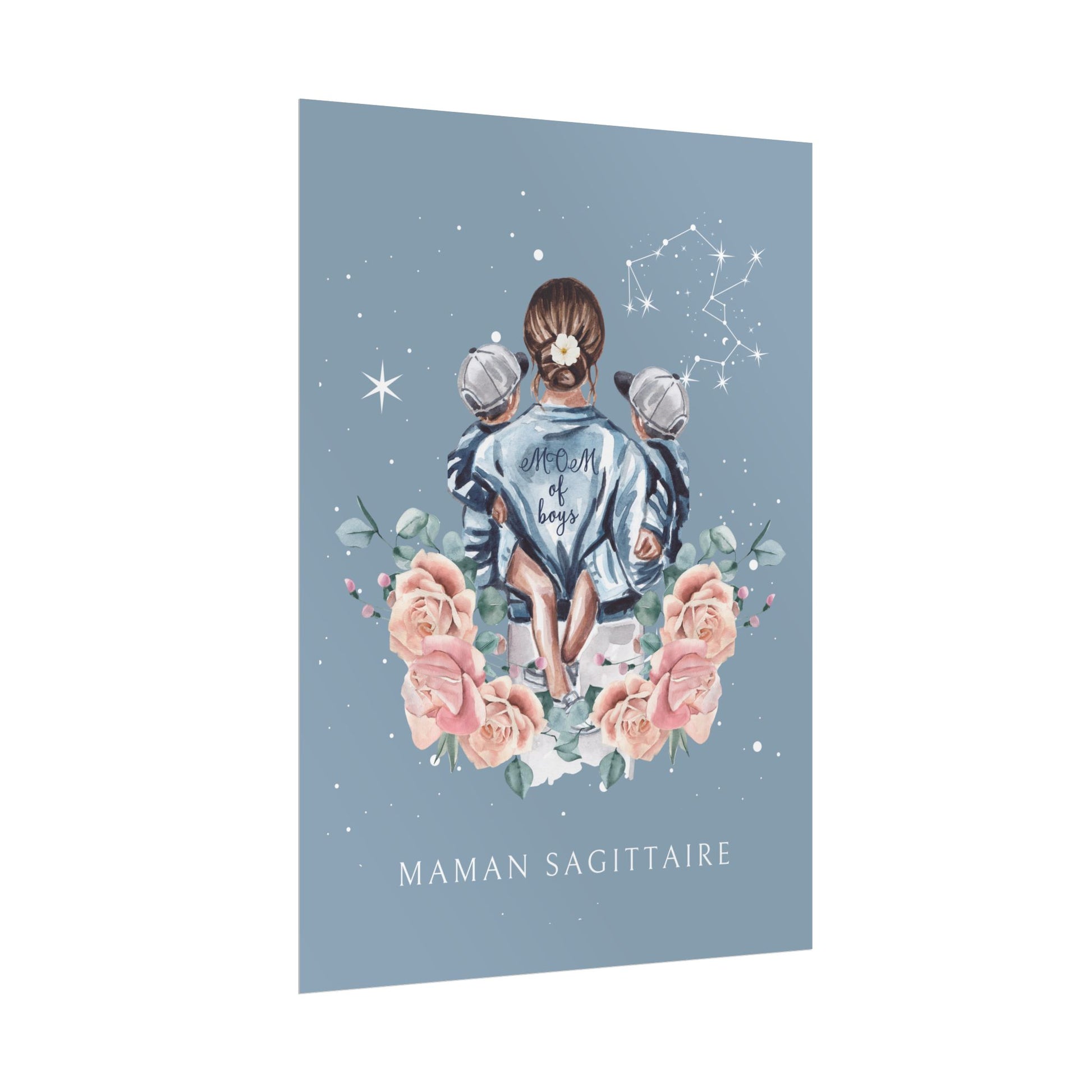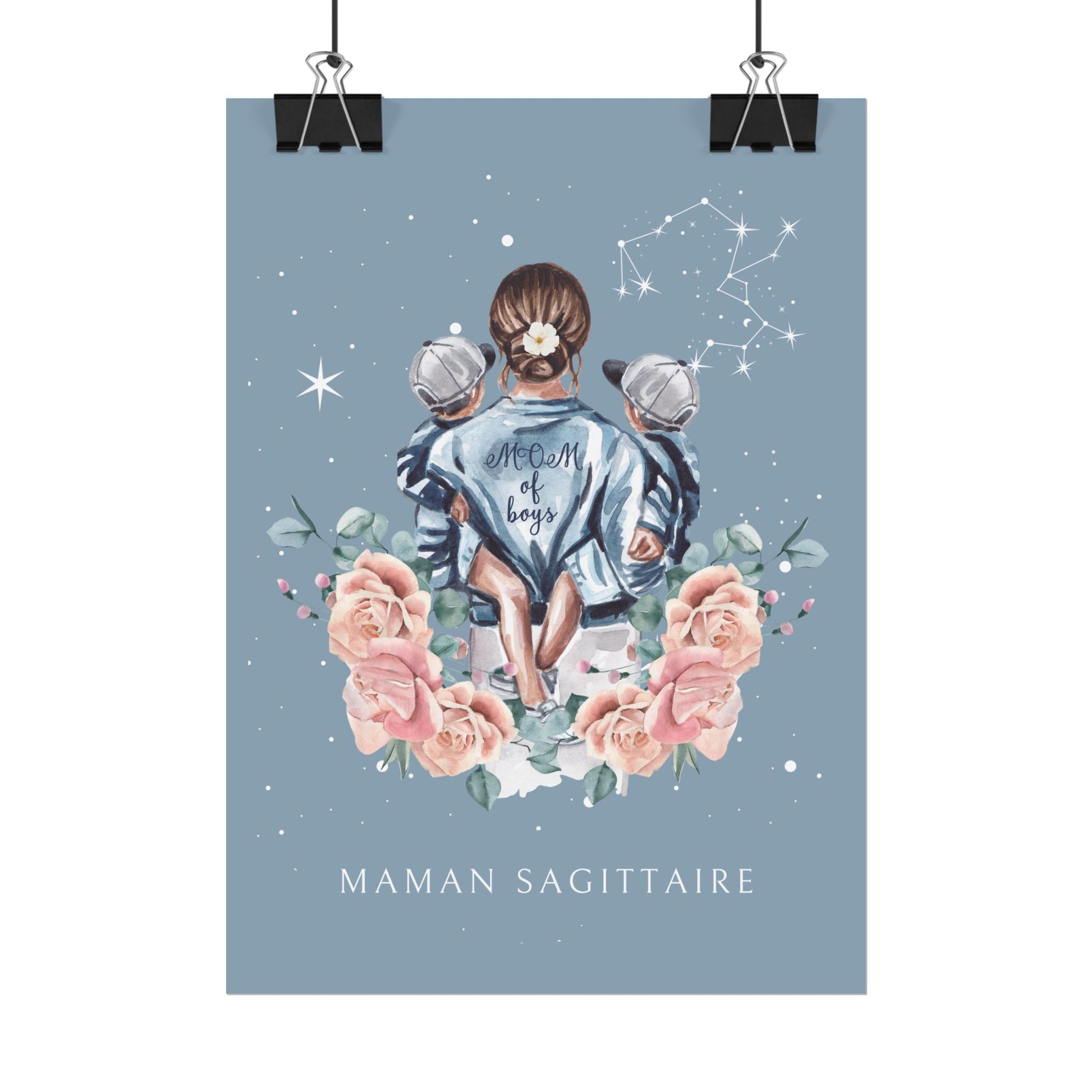 Apportez une énergie positive et une touche d’aventure à votre intérieur avec ce poster de la collection Cosmic Mum. L’illustration représente une mère portant tendrement ses fils, sur un fond étoilé mettant en valeur la constellation du Sagittaire. Ce design capture la connexion unique et joyeuse entre une mère et son enfant.